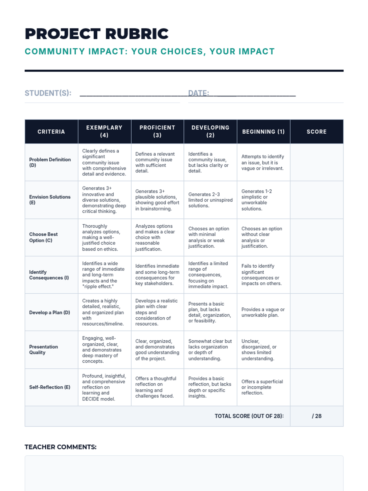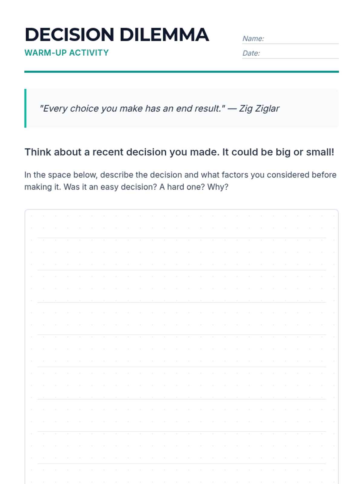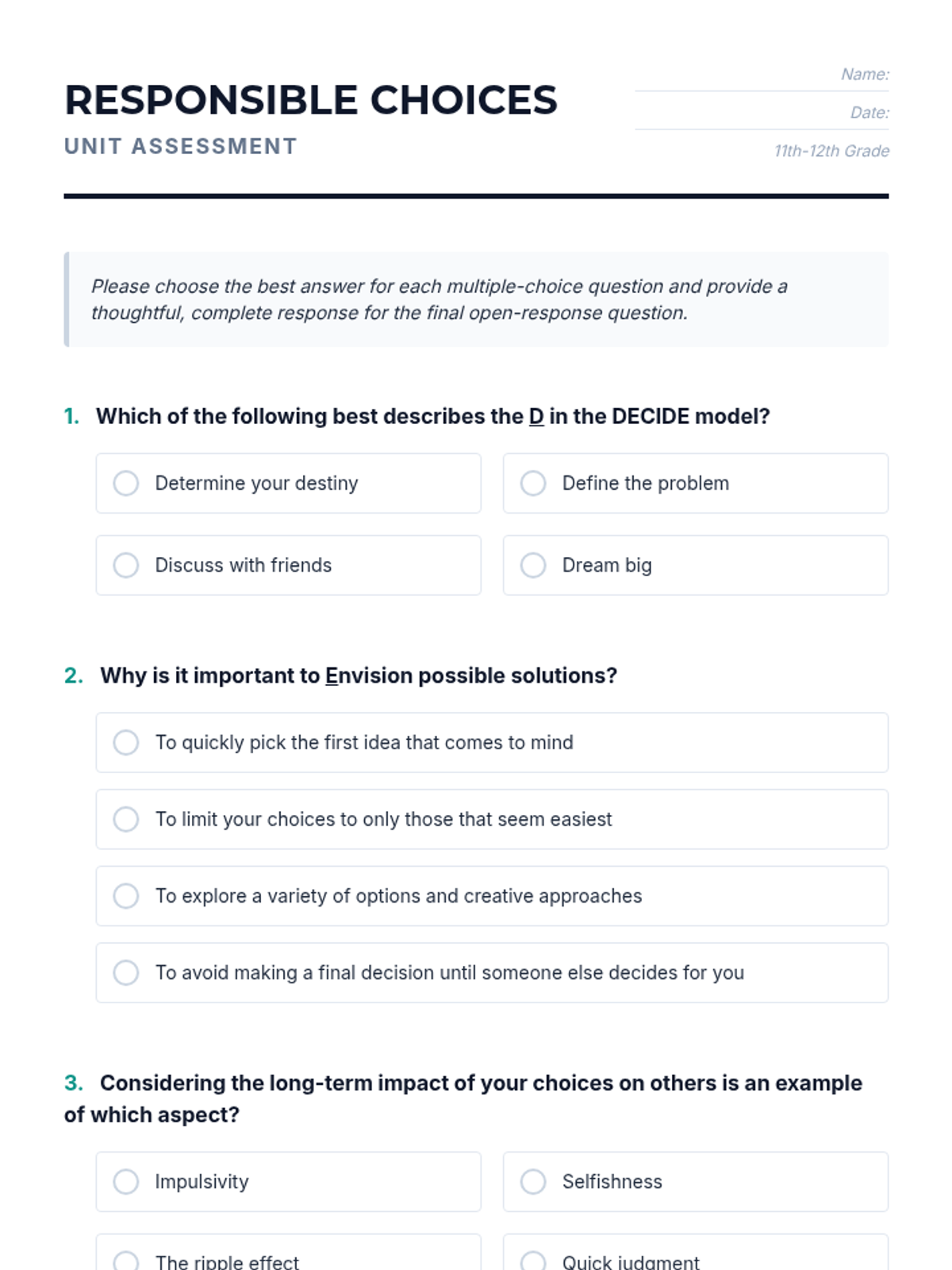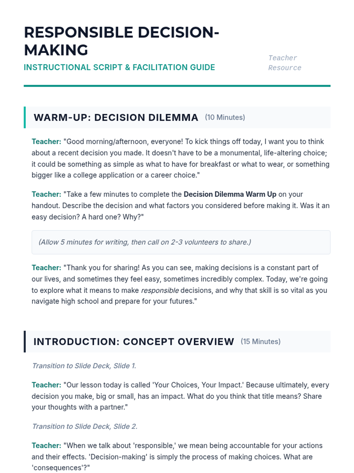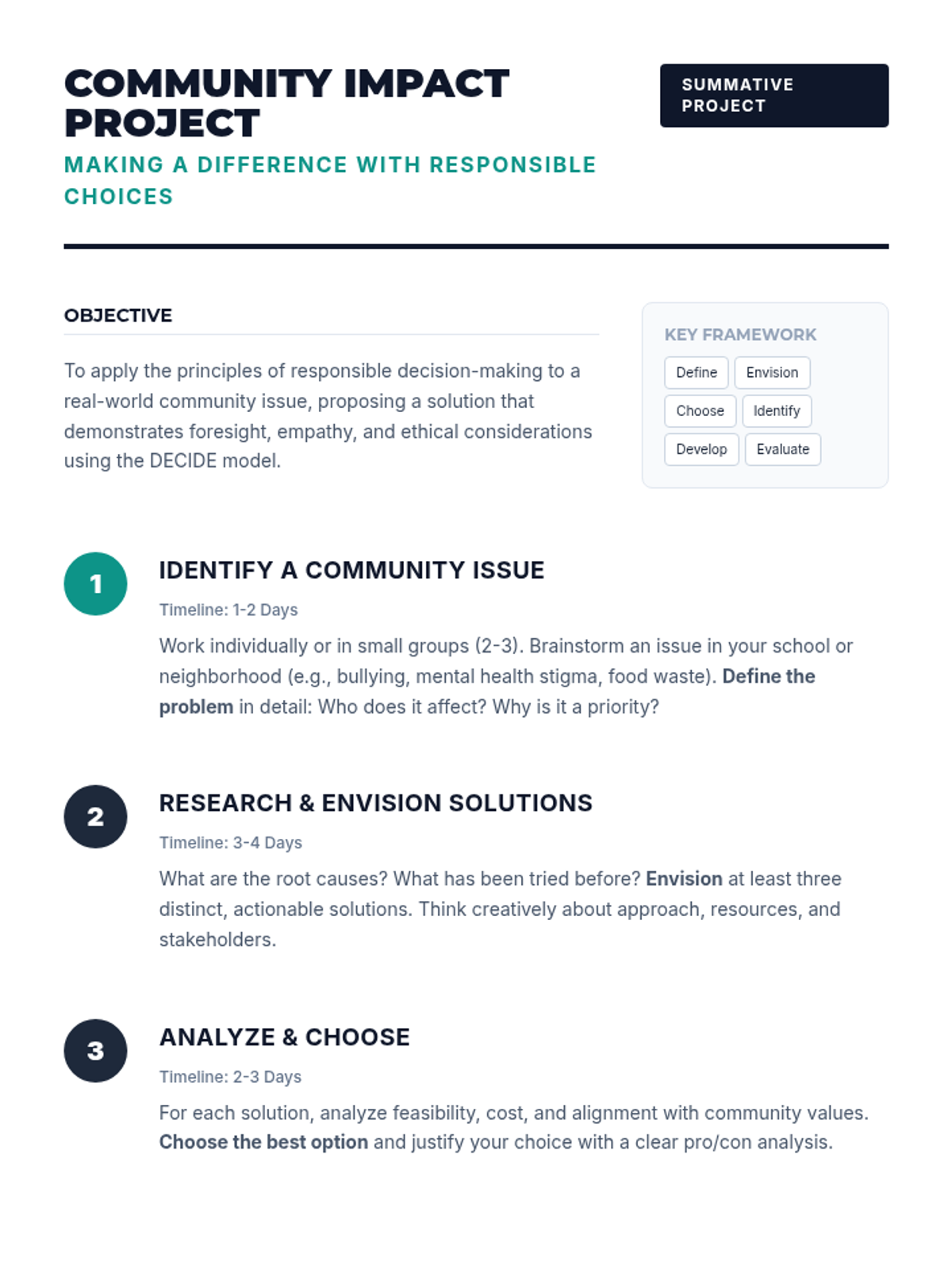 This lesson empowers 11th and 12th-grade students to understand and apply the principles of responsible decision-making through the DECIDE model, ethical analysis, and real-world application.