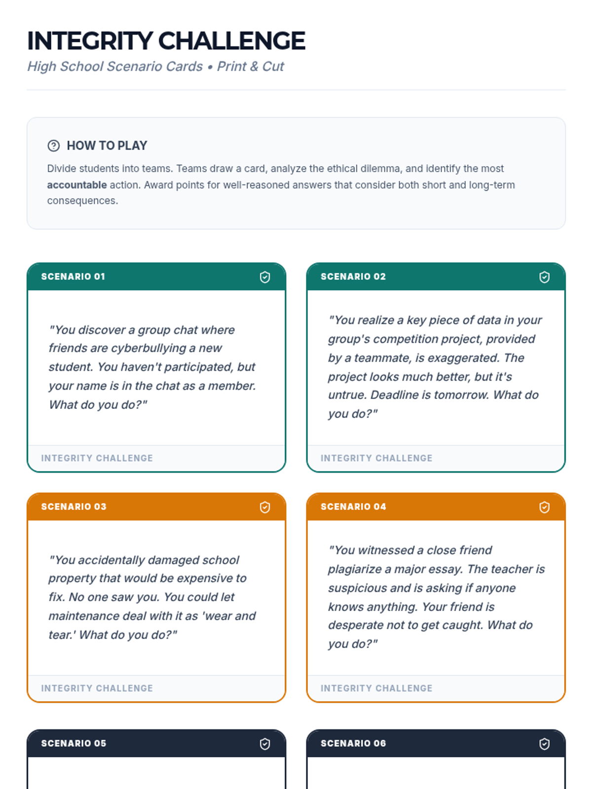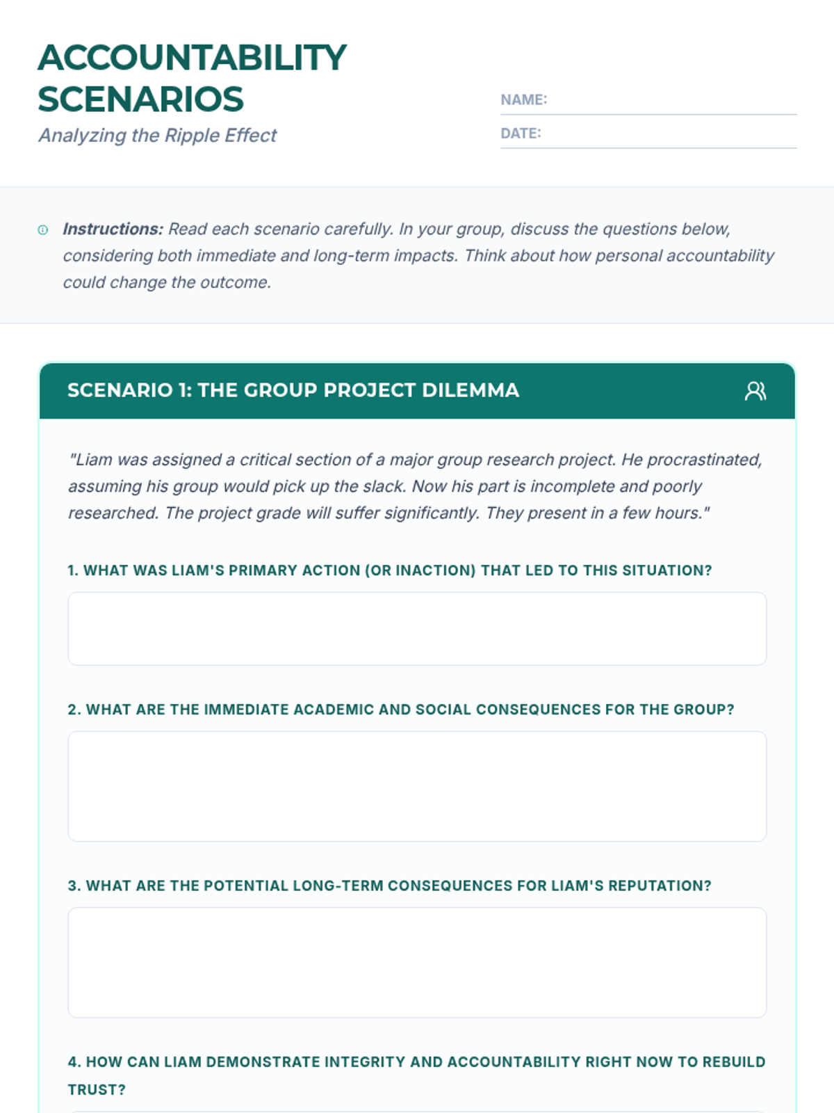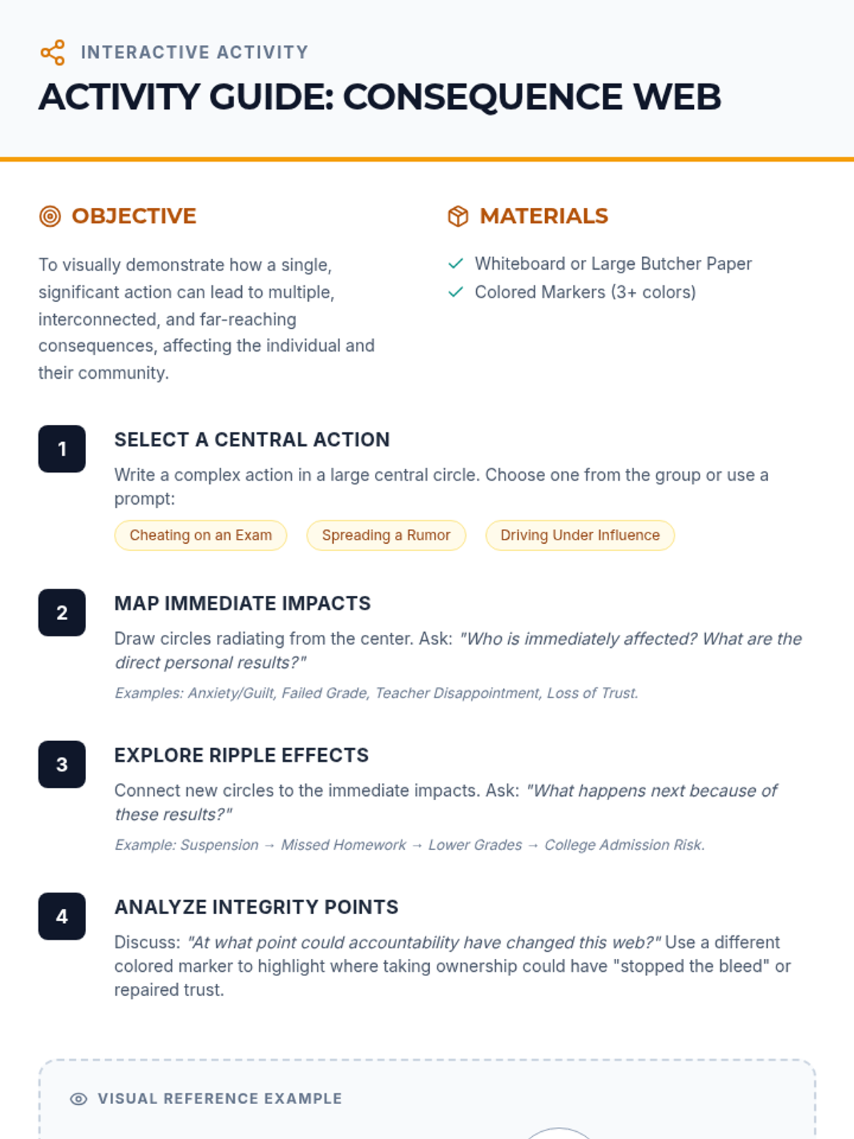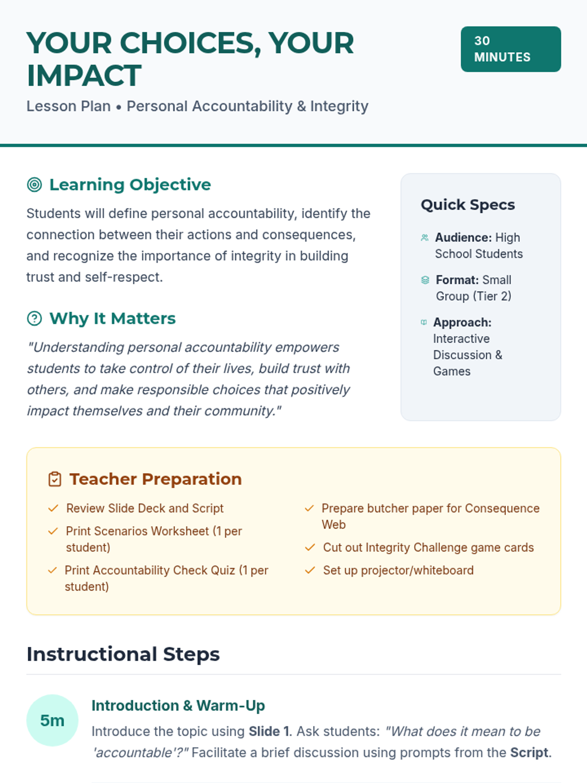 A 30-minute Tier 2 small group lesson for high school students focused on personal accountability, the ripple effect of consequences, and building integrity. Students explore scenarios, map out consequence webs, and engage in an integrity challenge game.