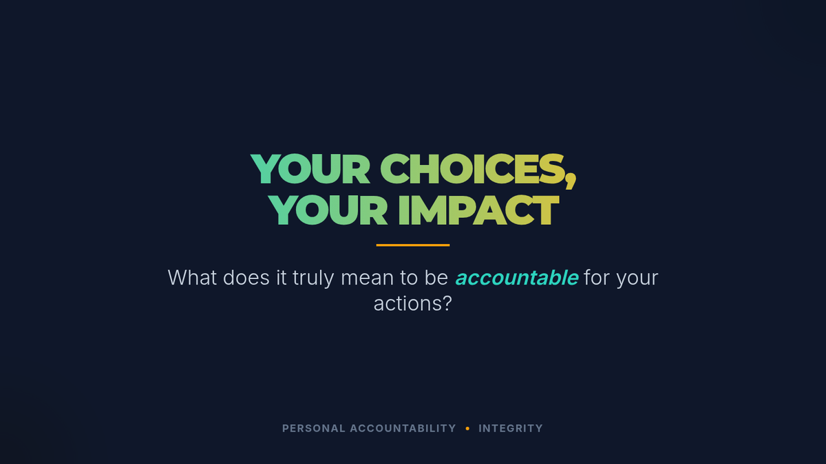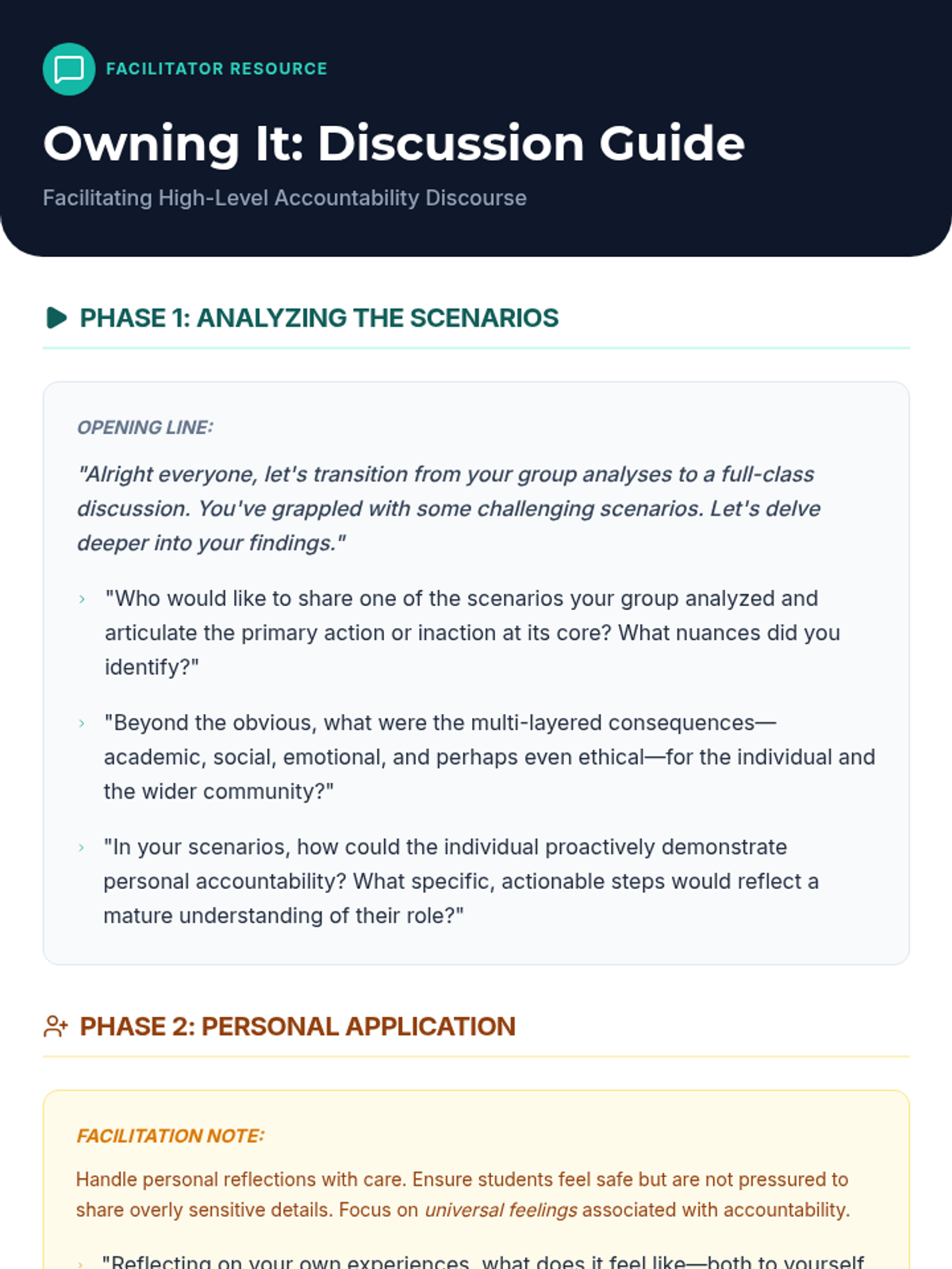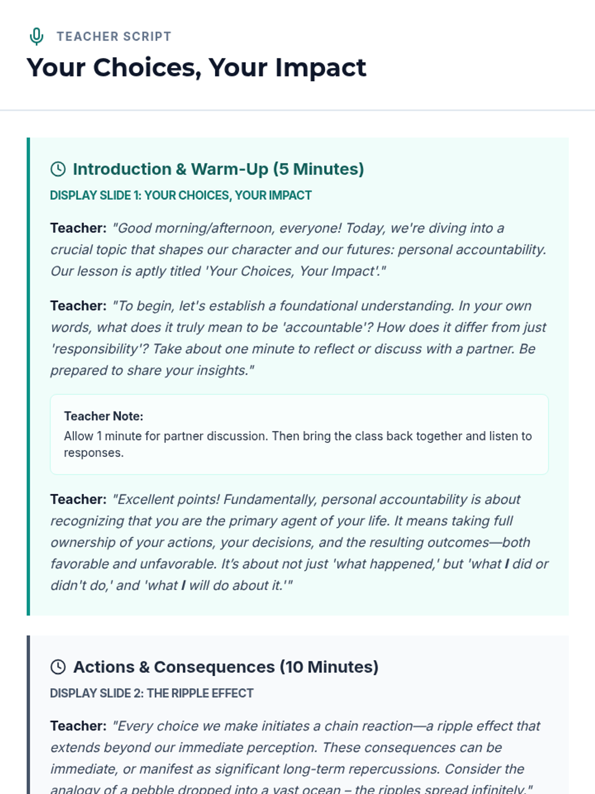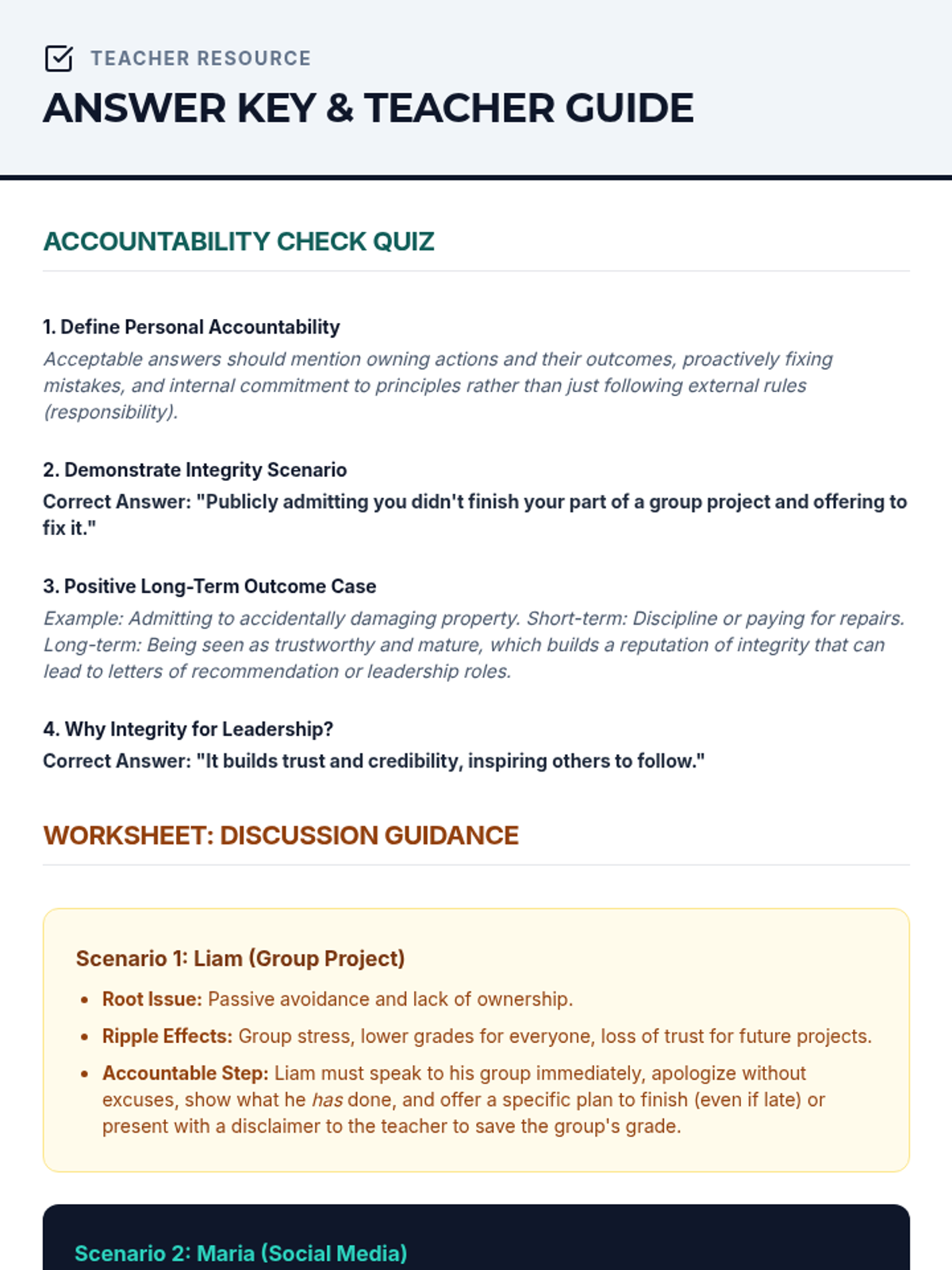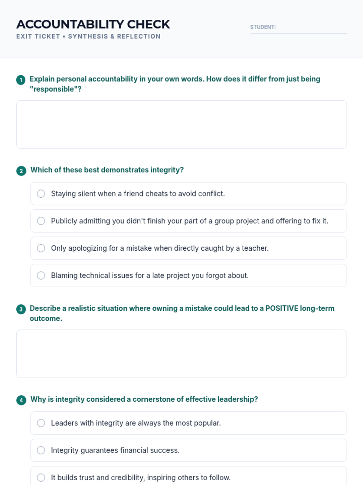 A 30-minute Tier 2 small group lesson for high school students focused on personal accountability, the ripple effect of consequences, and building integrity. Students explore scenarios, map out consequence webs, and engage in an integrity challenge game.