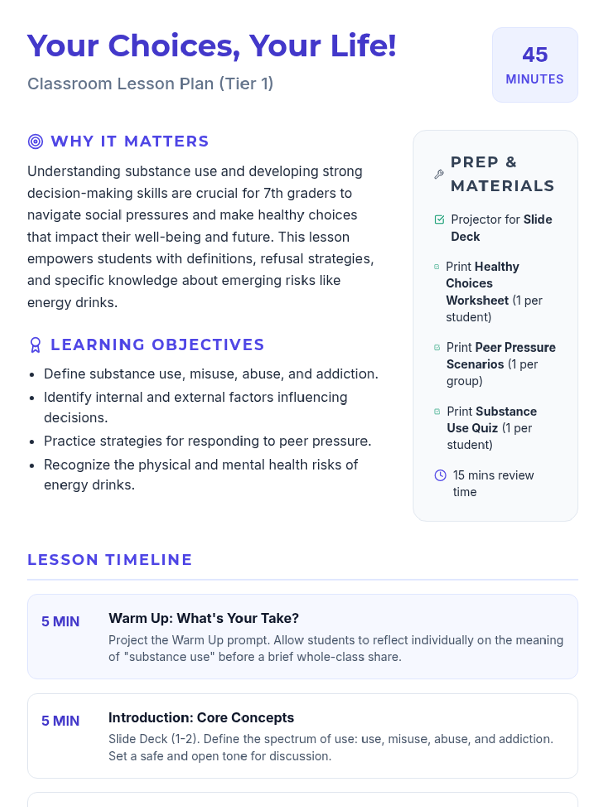 A 45-minute lesson for 7th graders that explores substance use definitions, decision-making strategies, and the specific risks of energy drinks through interactive scenarios and personal reflection.