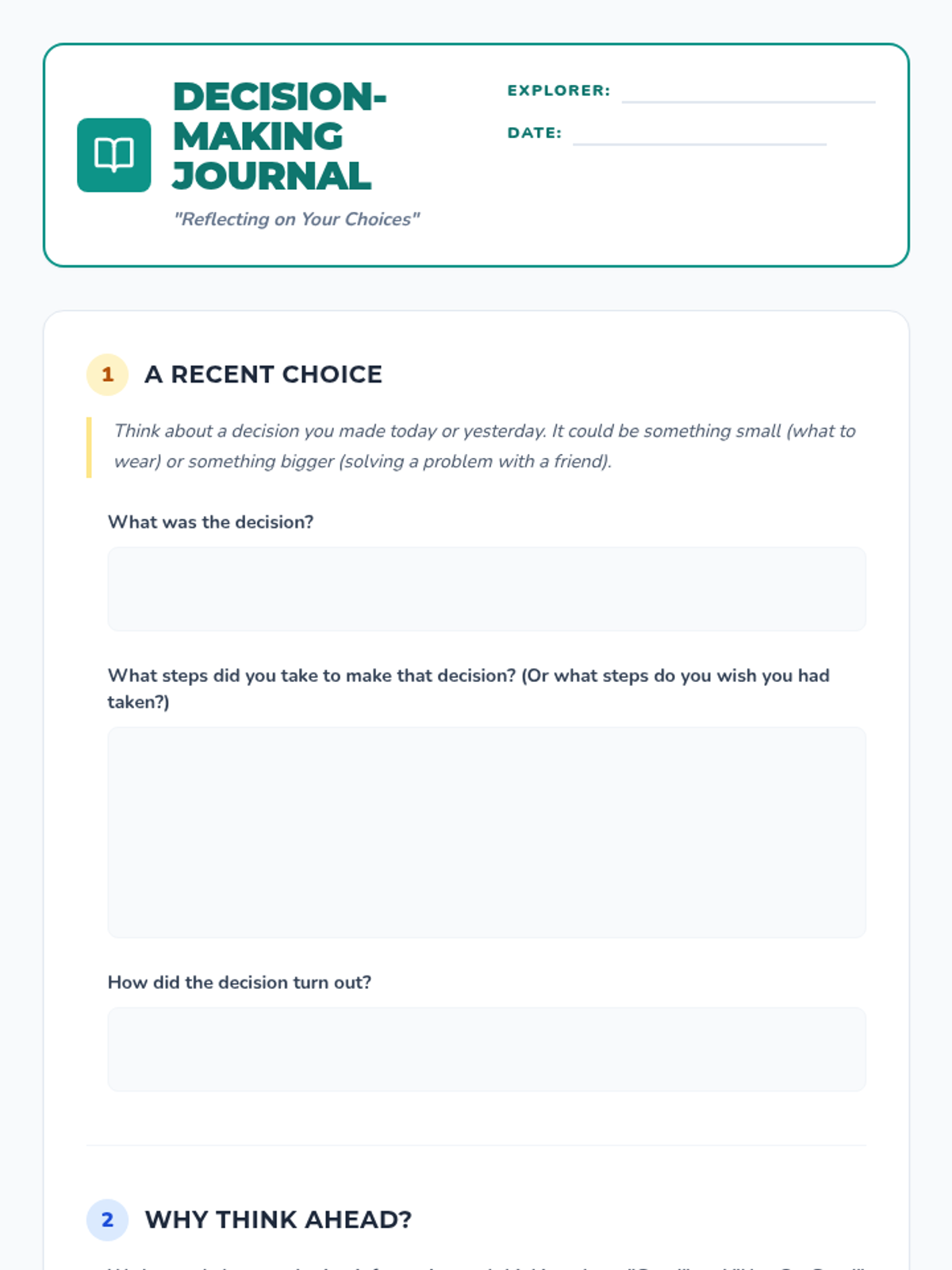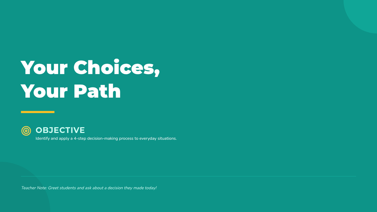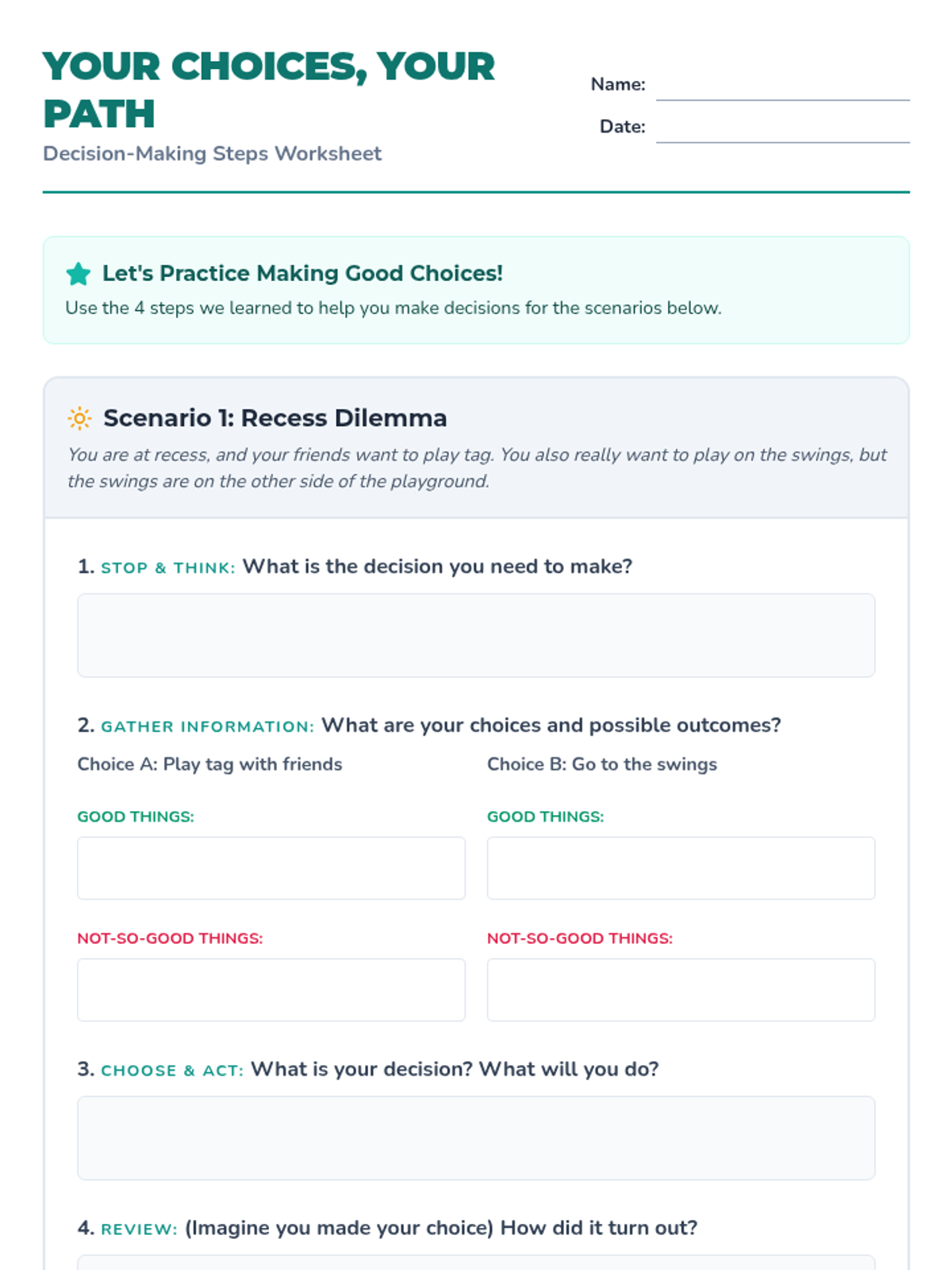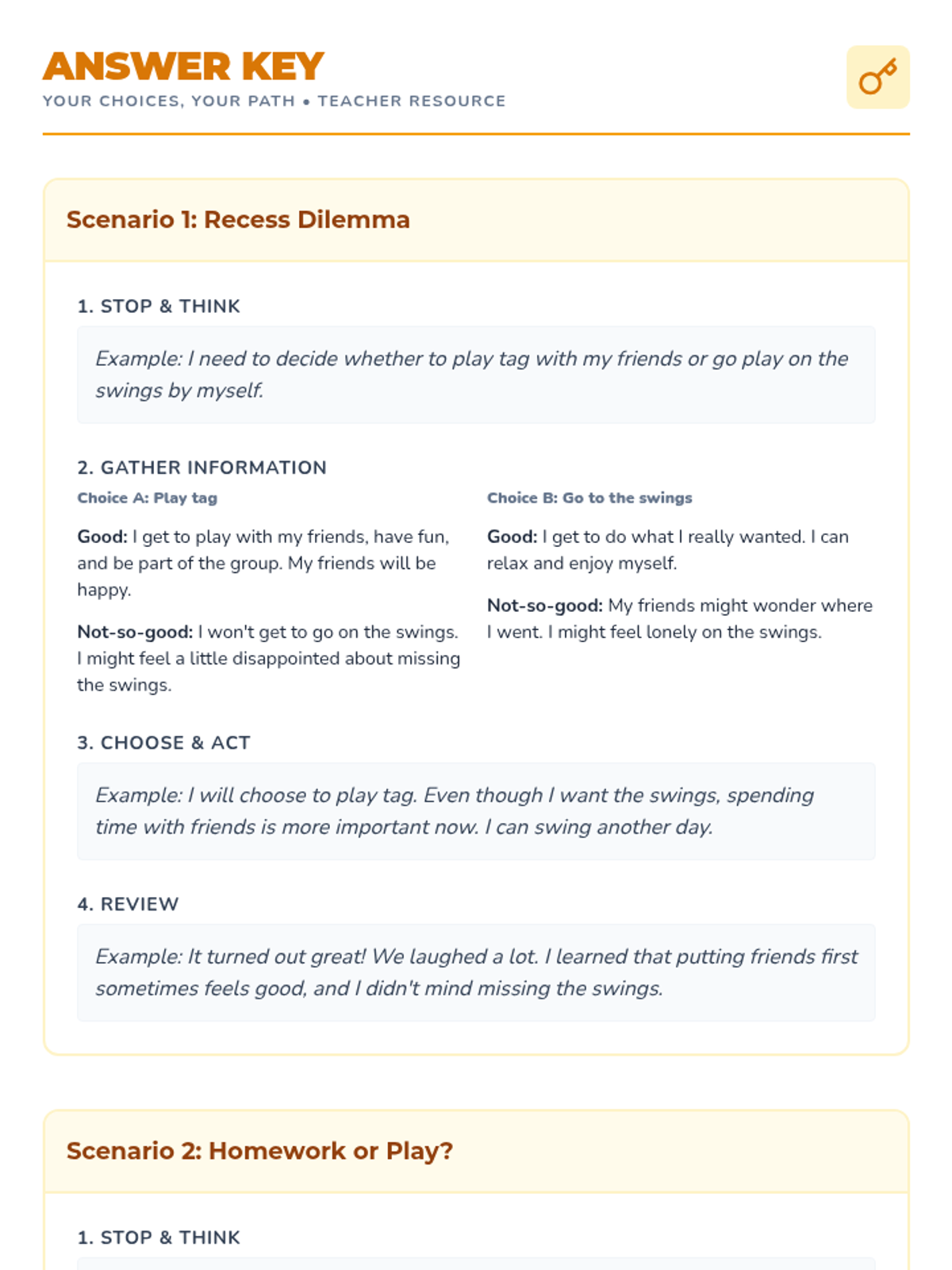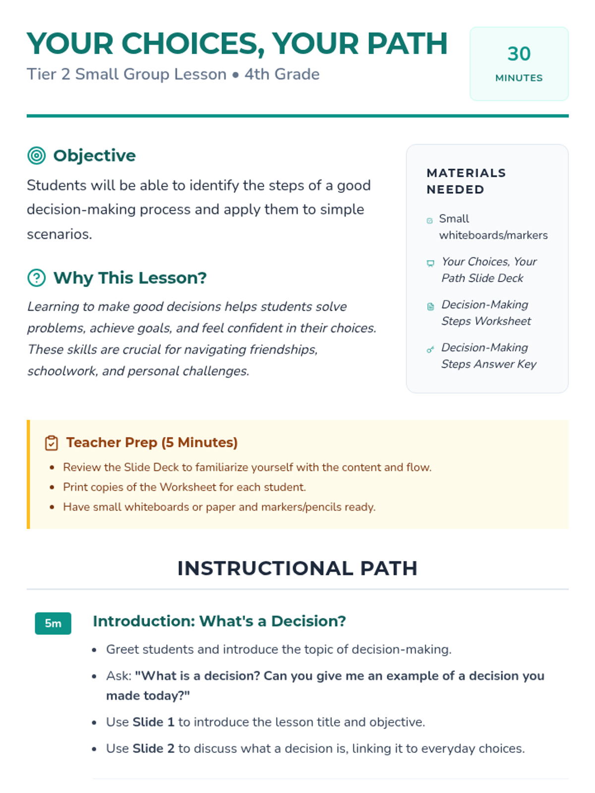 A small-group lesson for 4th graders focused on developing a four-step decision-making process to navigate everyday choices with confidence and clarity.