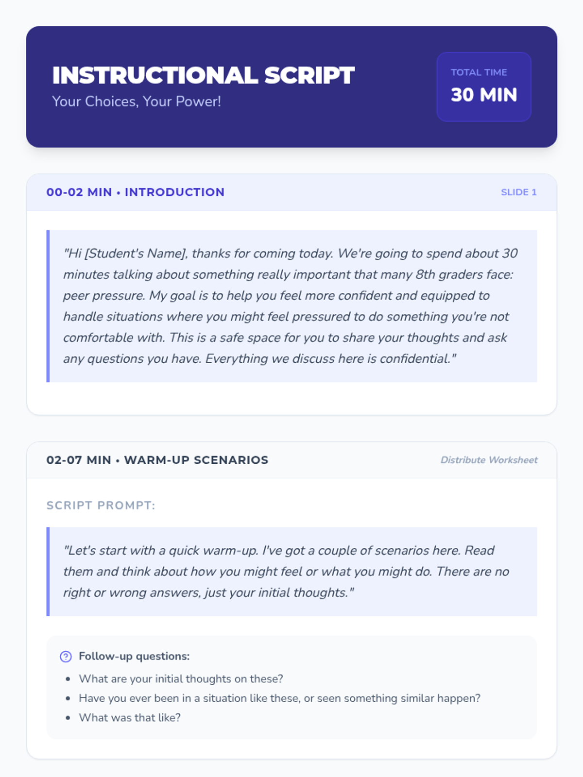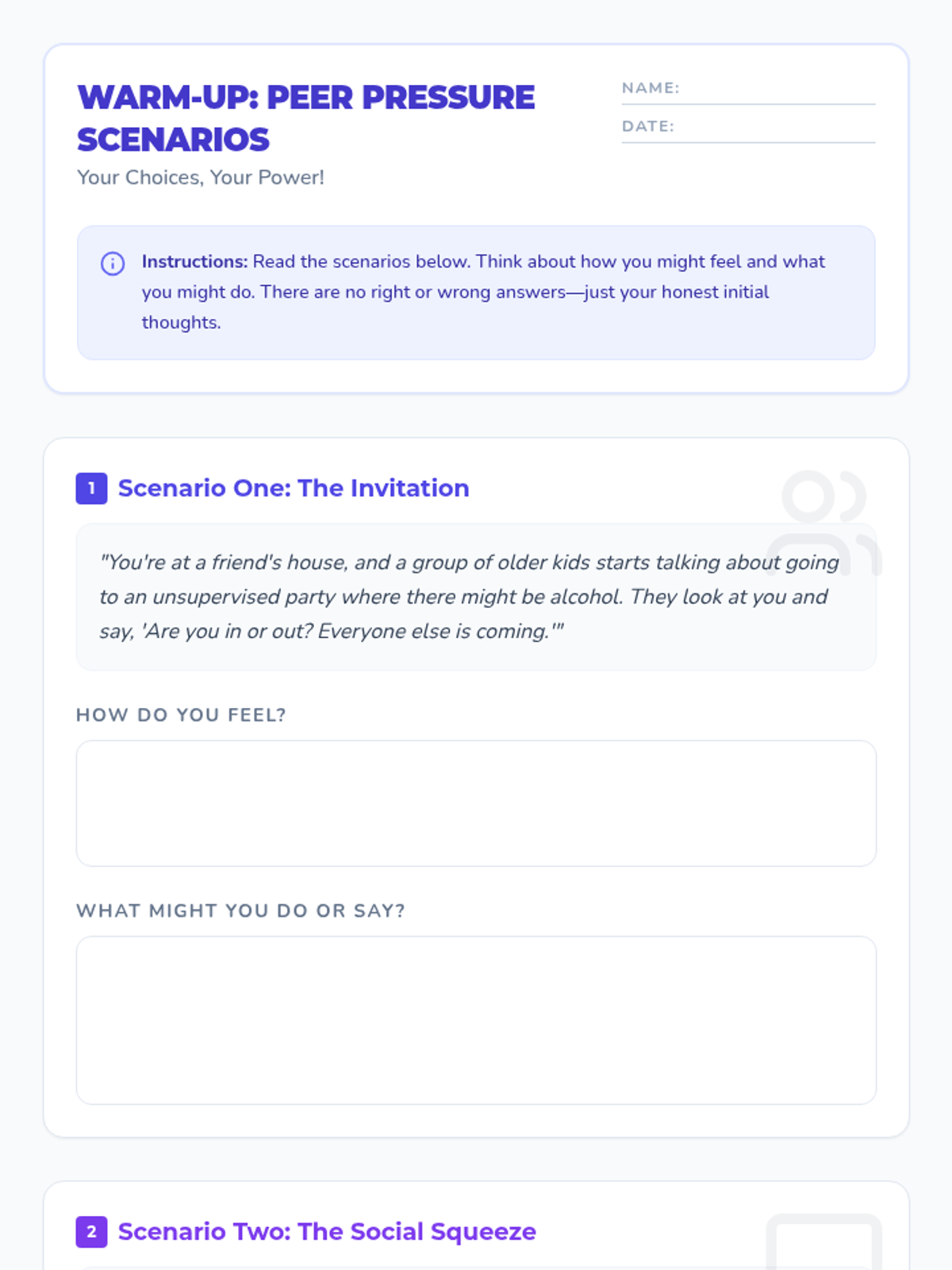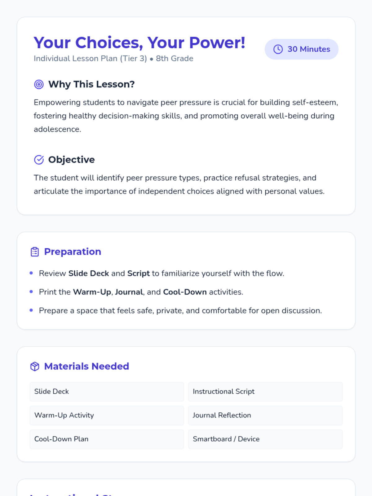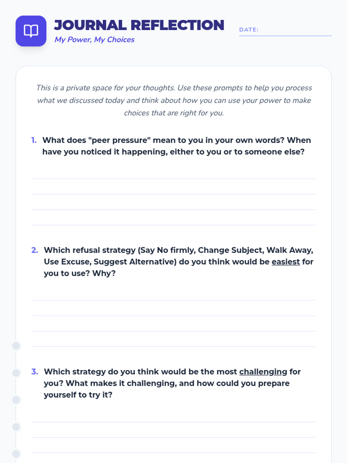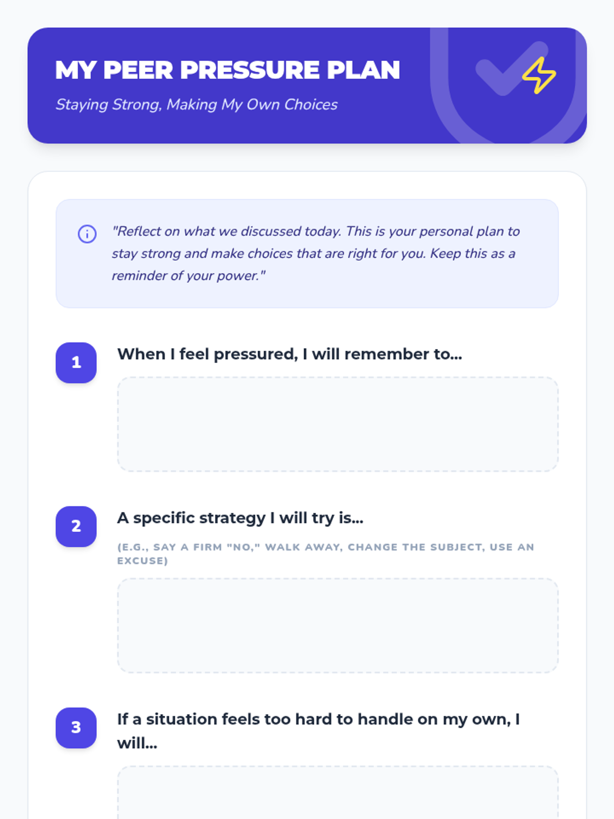 This 30-minute individual lesson empowers an 8th-grade girl to confidently navigate peer pressure by understanding its types, practicing refusal strategies, and building self-assurance. It involves interactive discussion, role-playing, and guided reflection.
