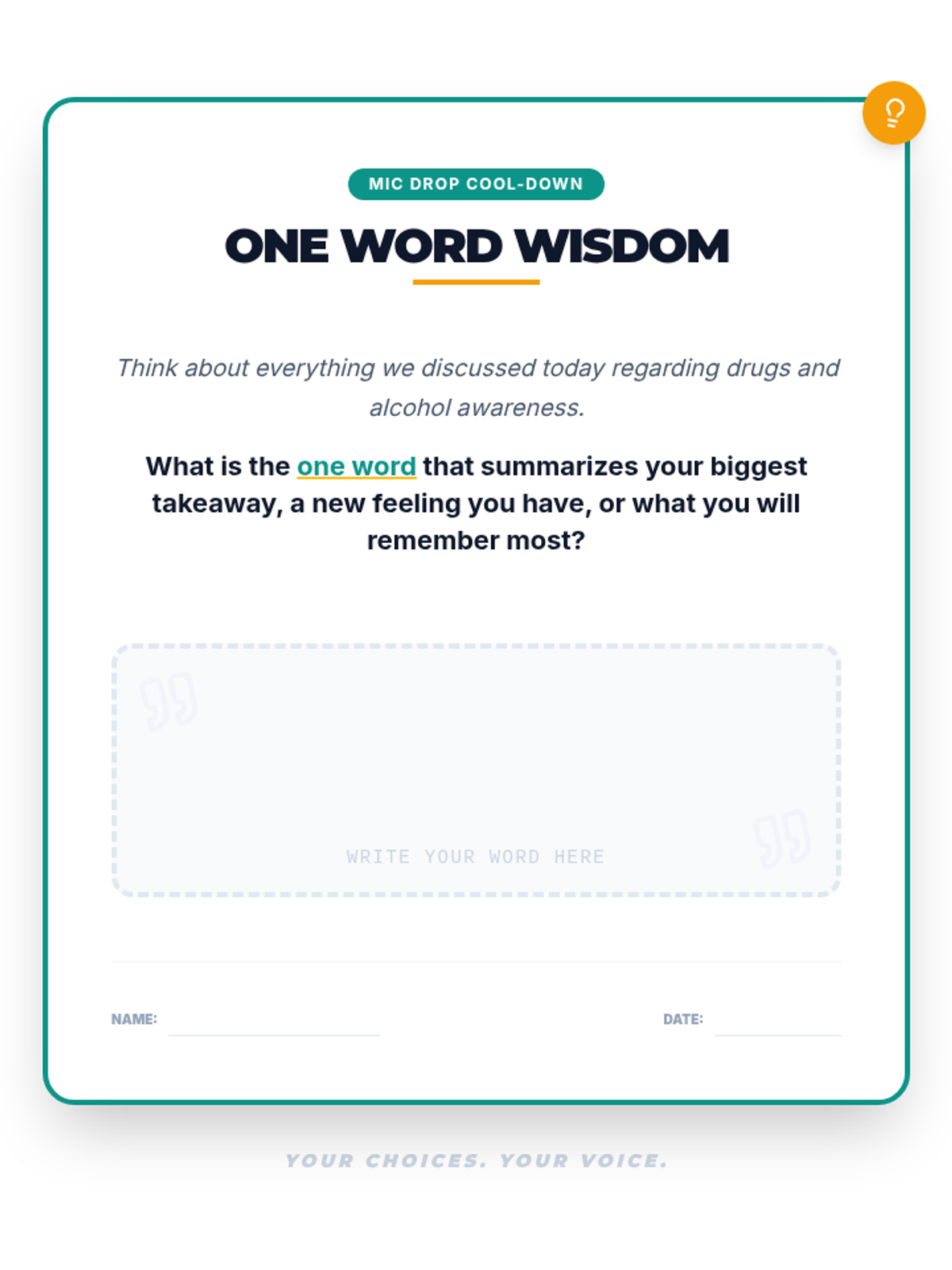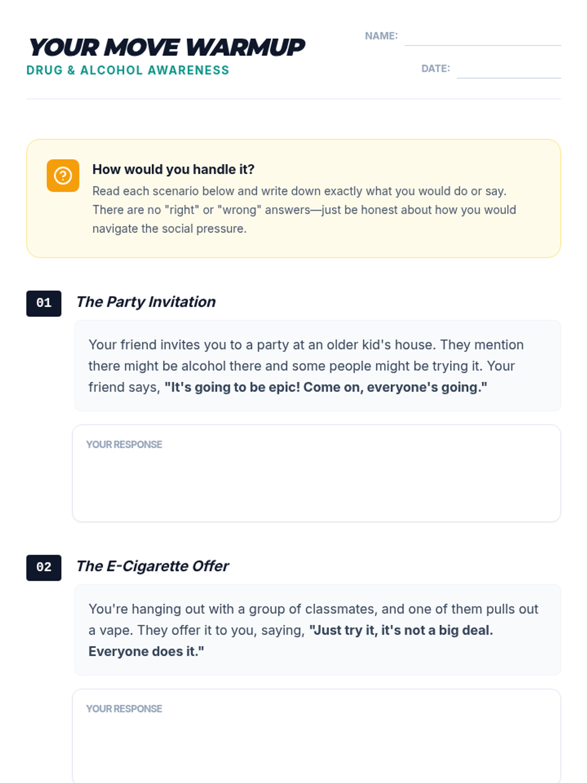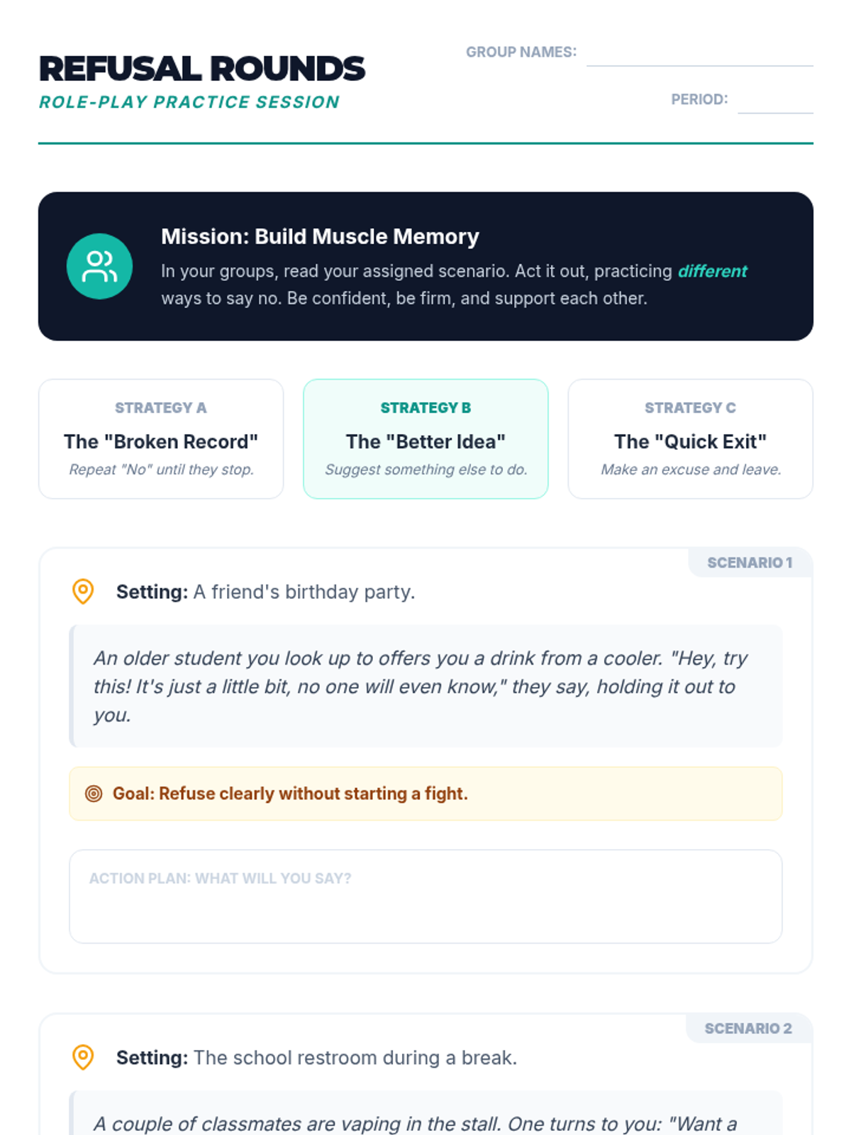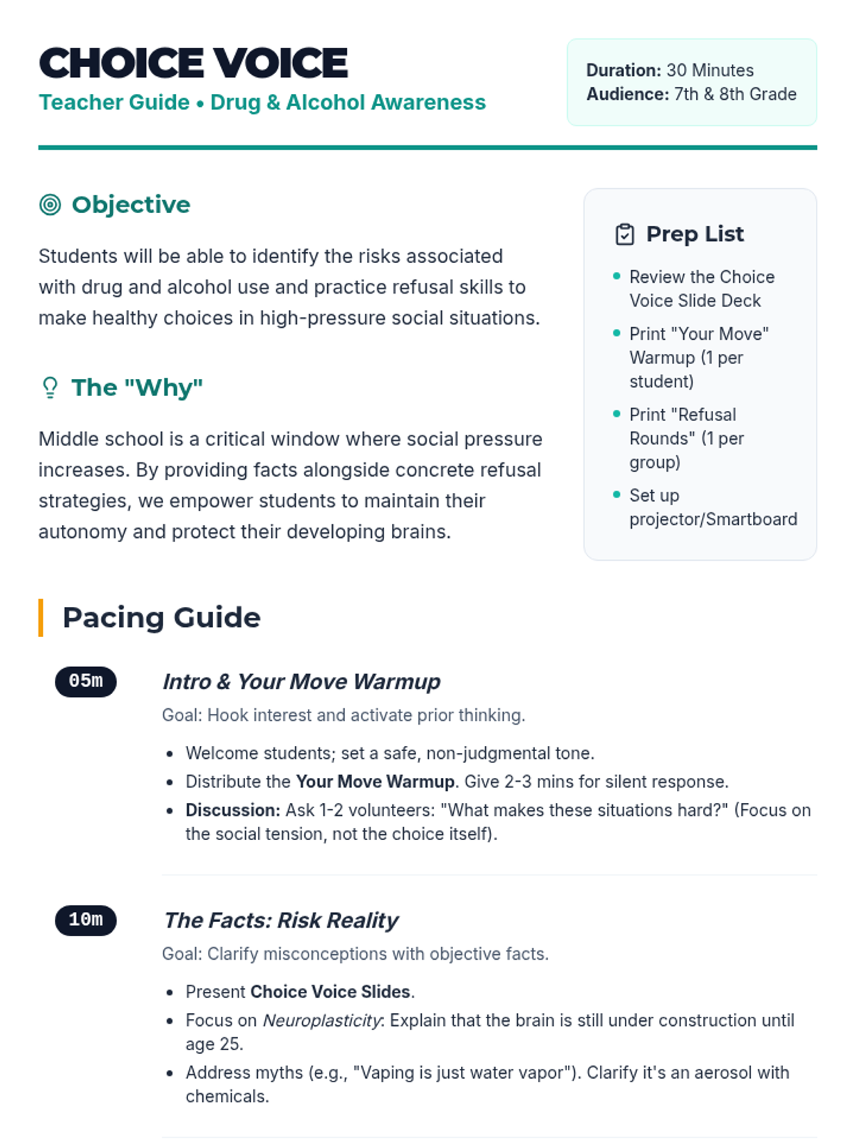 A 30-minute empowerment-focused lesson for 7th and 8th graders to navigate social pressure regarding drugs and alcohol through risk awareness and refusal skill-building.