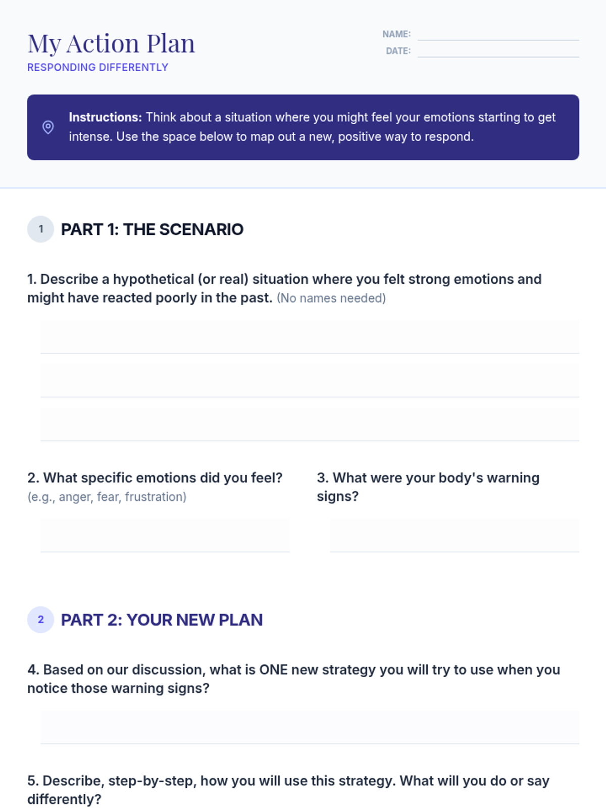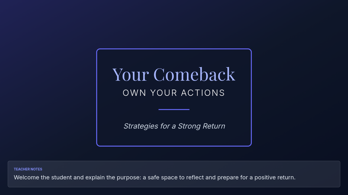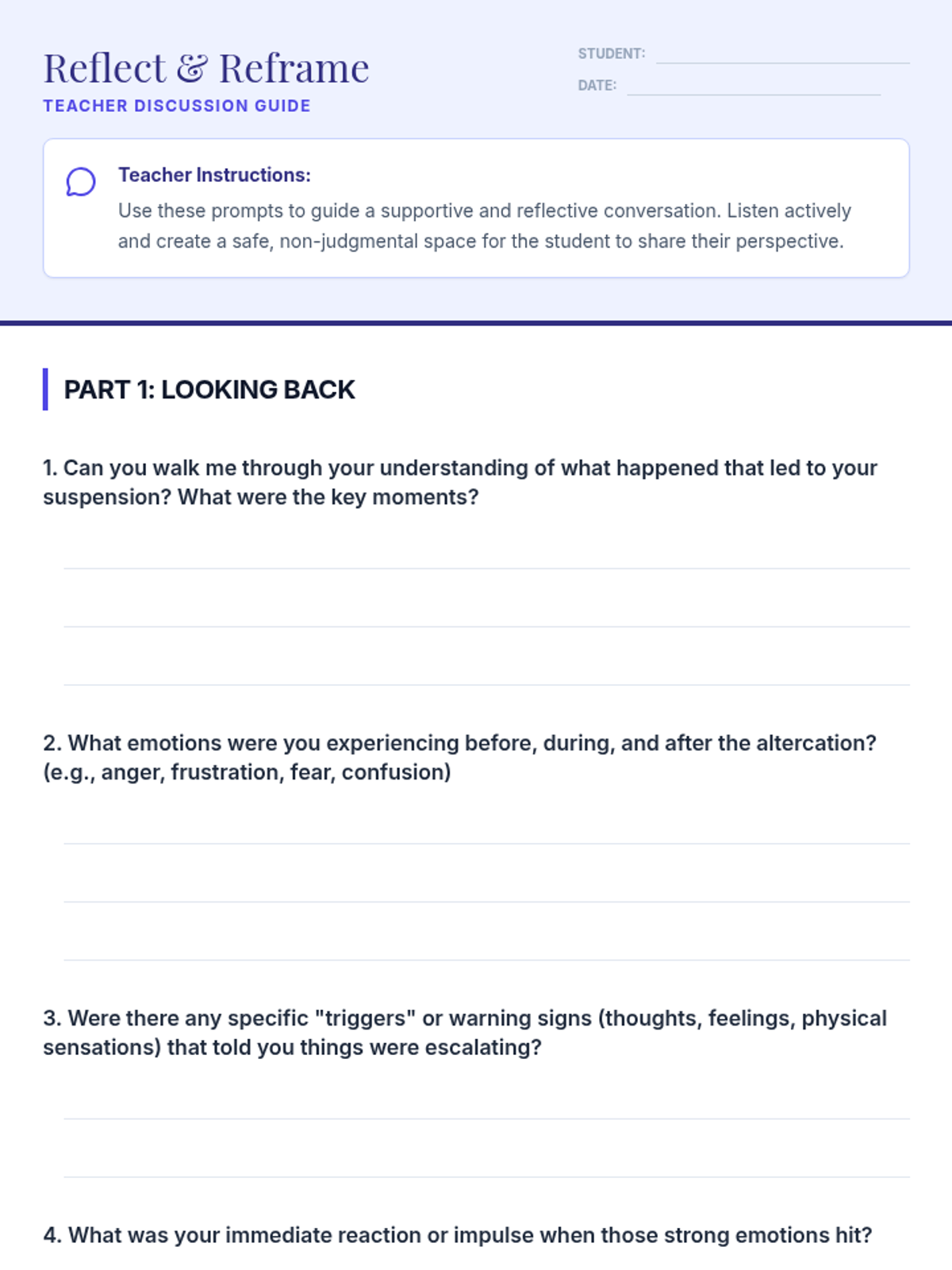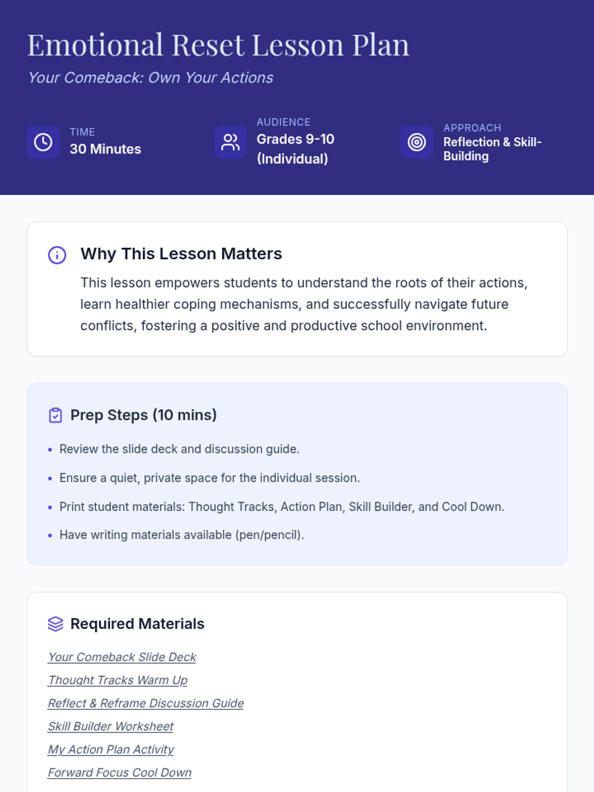 A 30-minute individual Tier 3 restorative lesson for high schoolers returning from suspension. It focuses on identifying emotional triggers, practicing the 'power of pause', and creating a concrete action plan for positive conflict resolution.