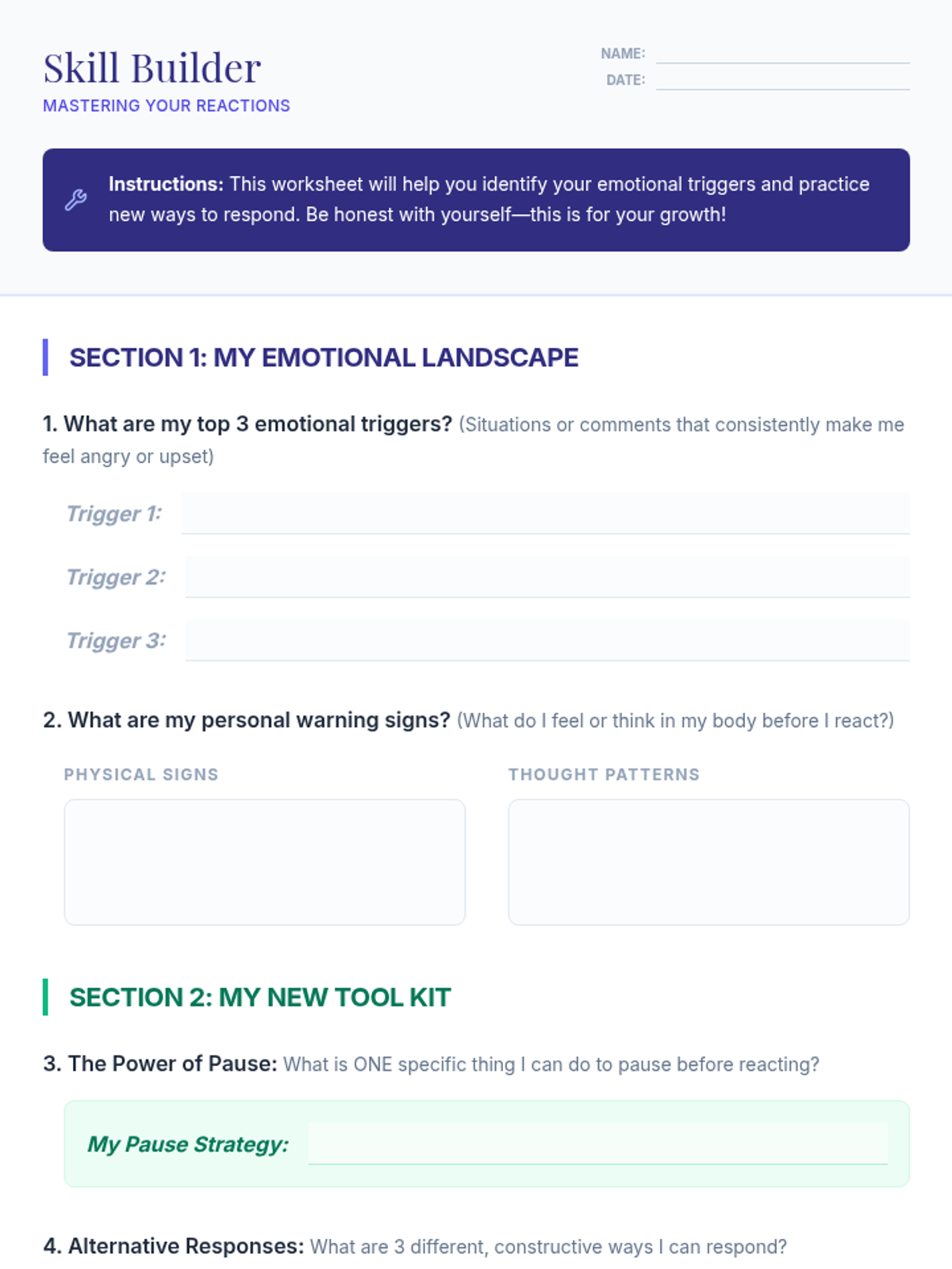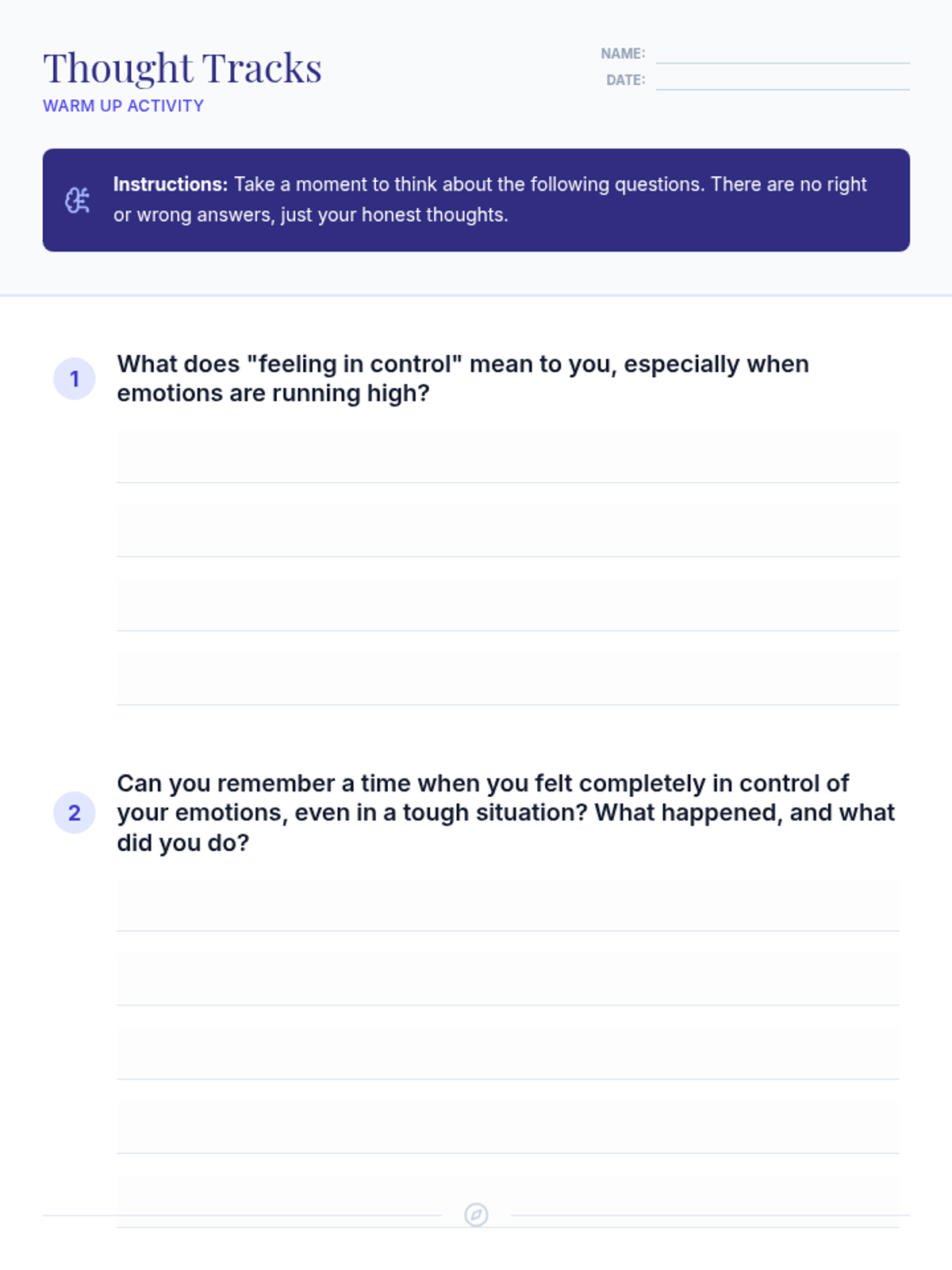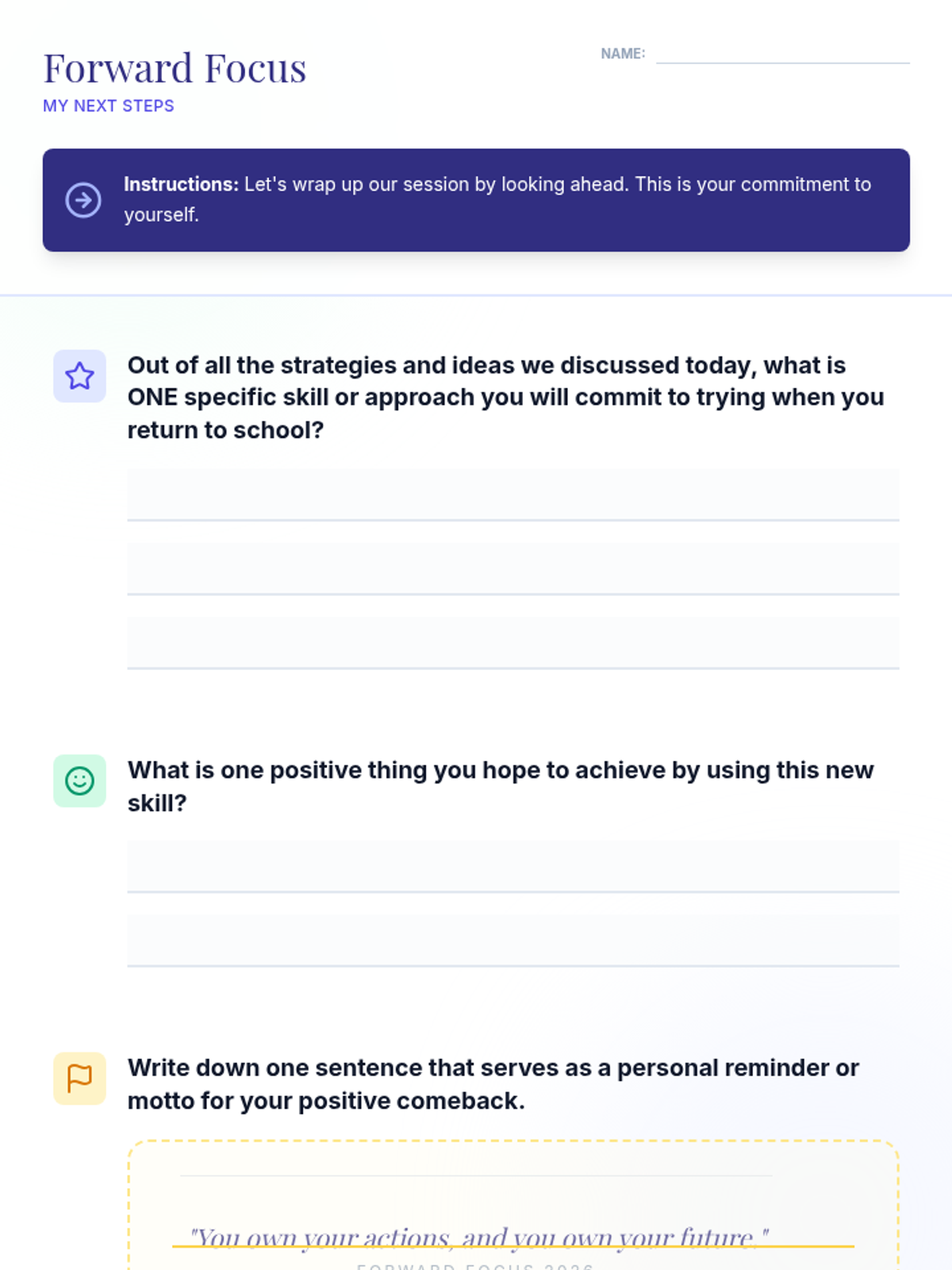 A 30-minute individual Tier 3 restorative lesson for high schoolers returning from suspension. It focuses on identifying emotional triggers, practicing the 'power of pause', and creating a concrete action plan for positive conflict resolution.