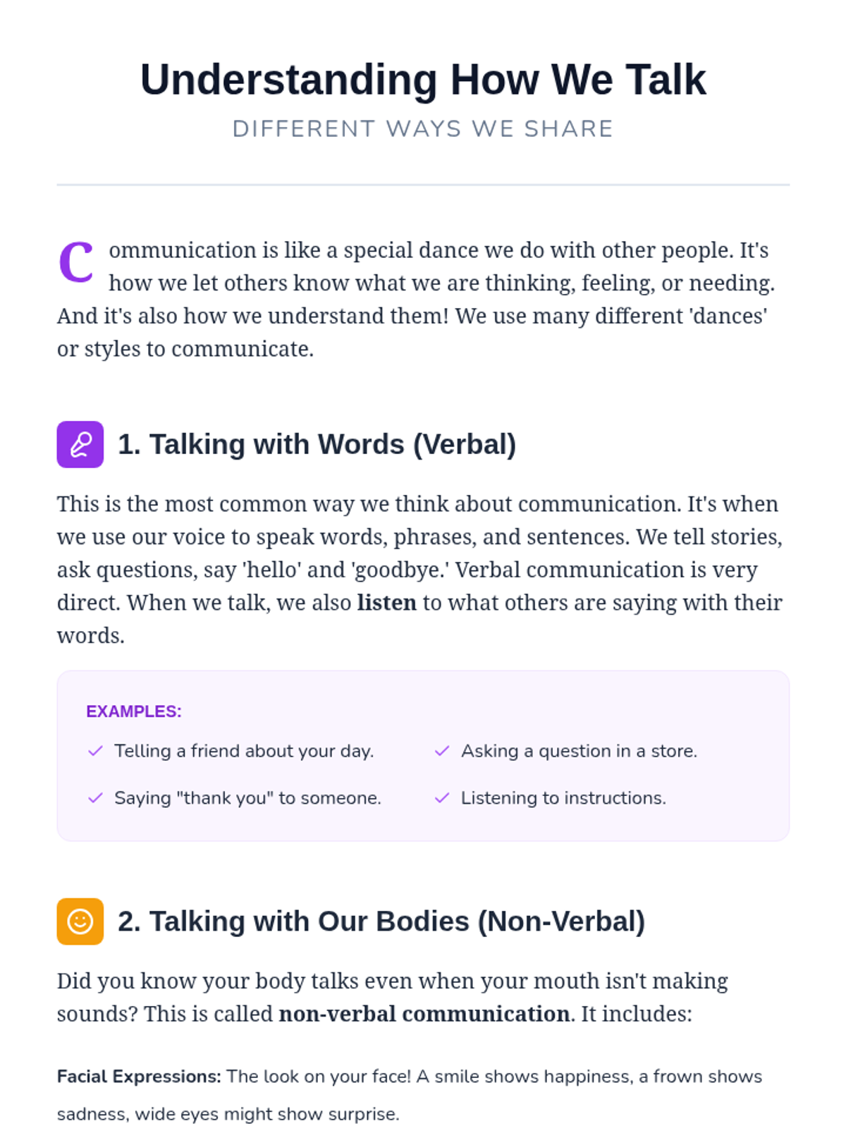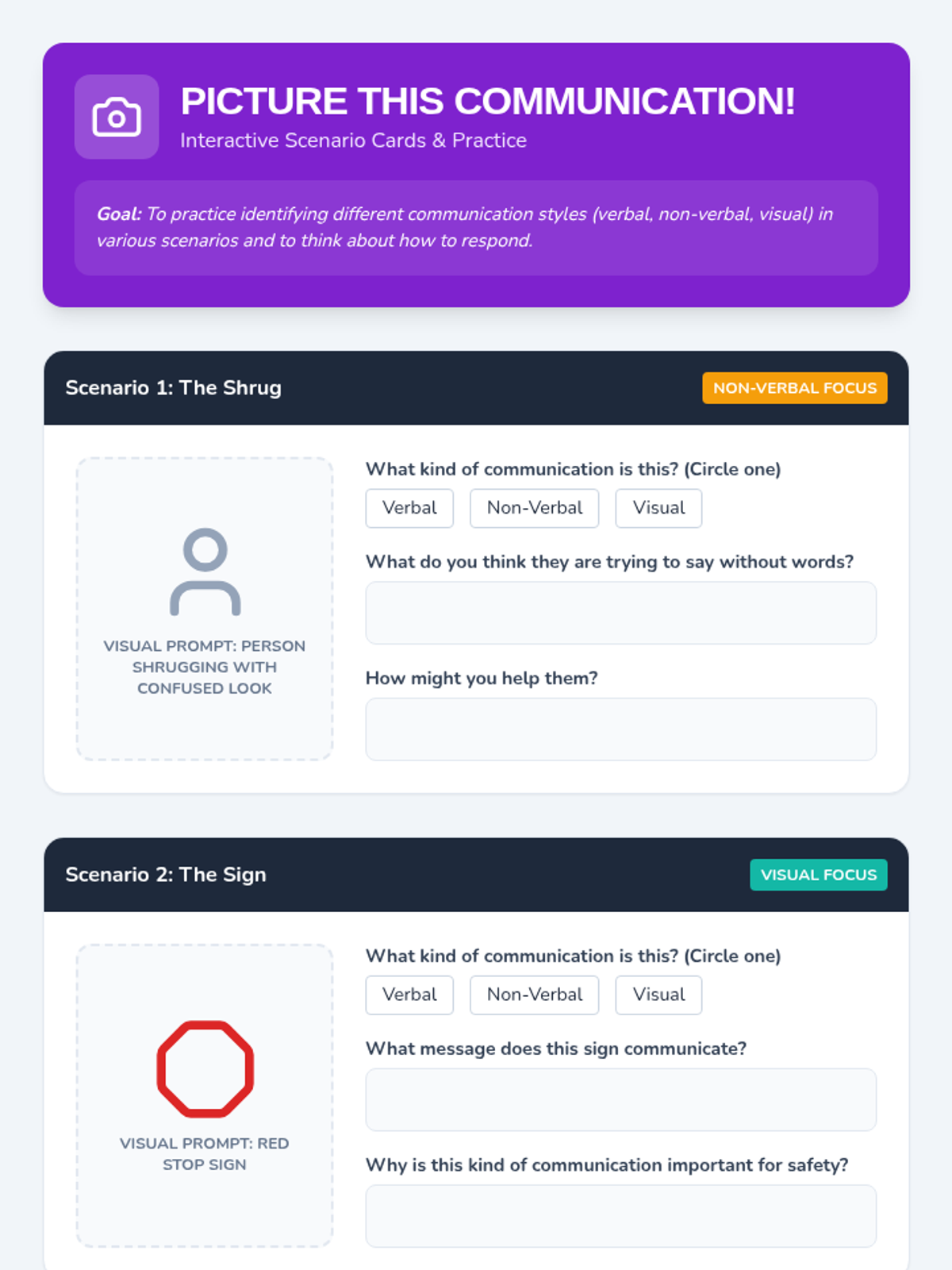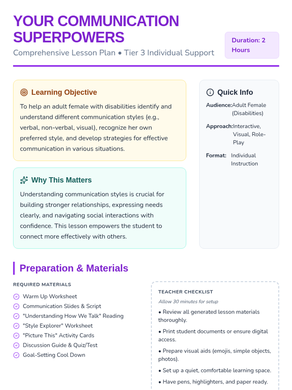 A 2-hour, Tier 3 individual lesson for an adult female with disabilities to explore and master different communication styles, focusing on verbal, non-verbal, and visual strategies for daily life.