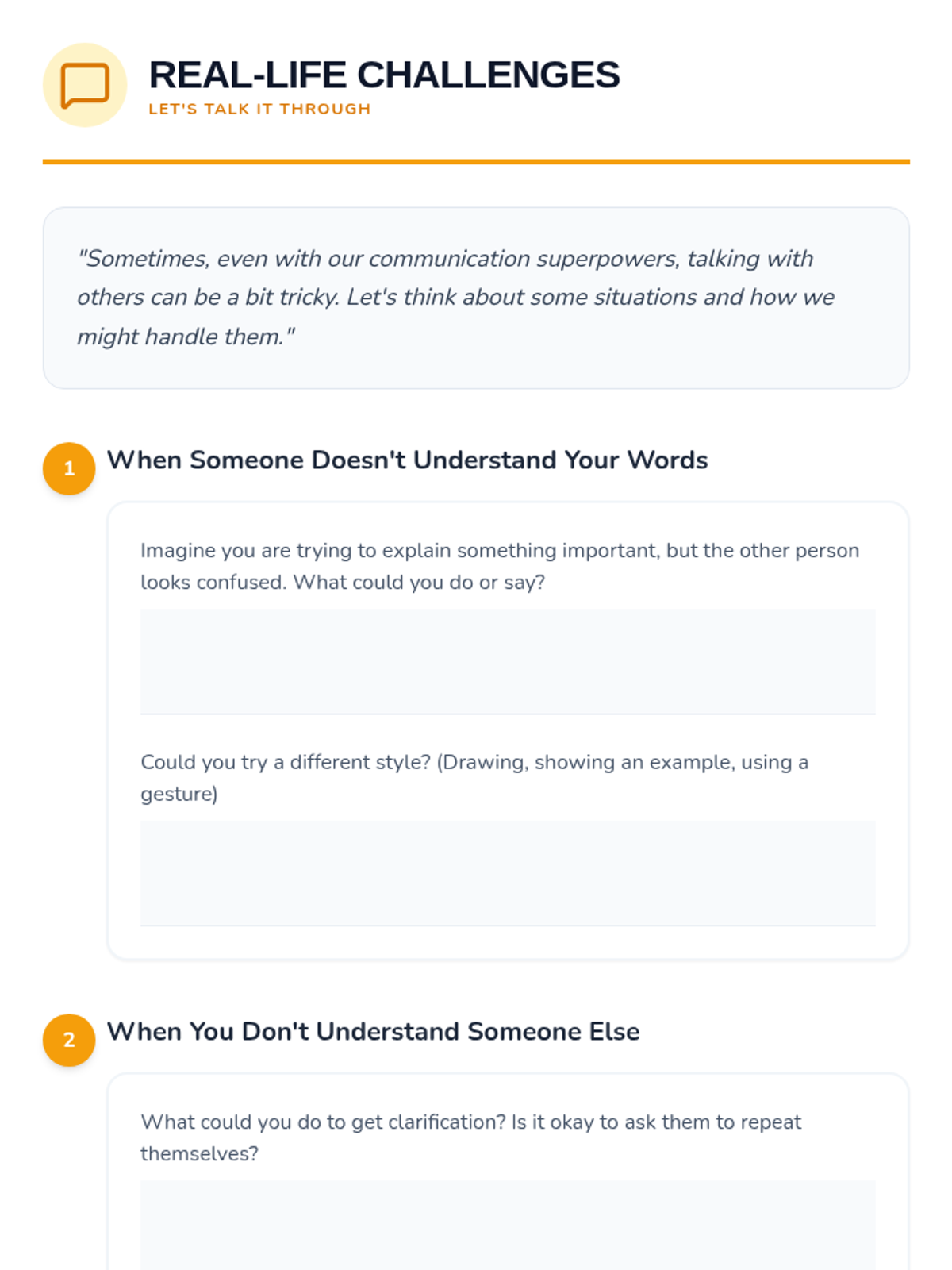 A high-energy, 30-minute coaching session focused on five critical self-advocacy scenarios. Includes role-play, visual aids, and practical toolkits for immediate application in real-world settings.