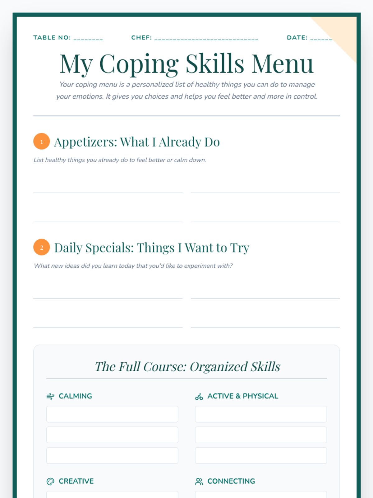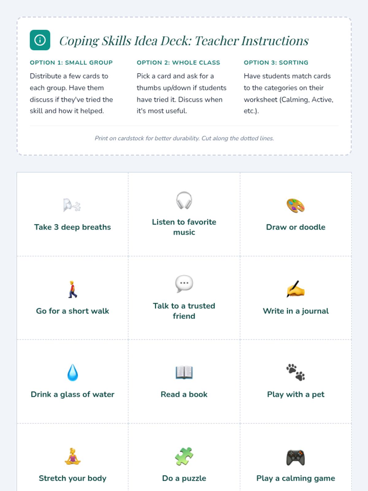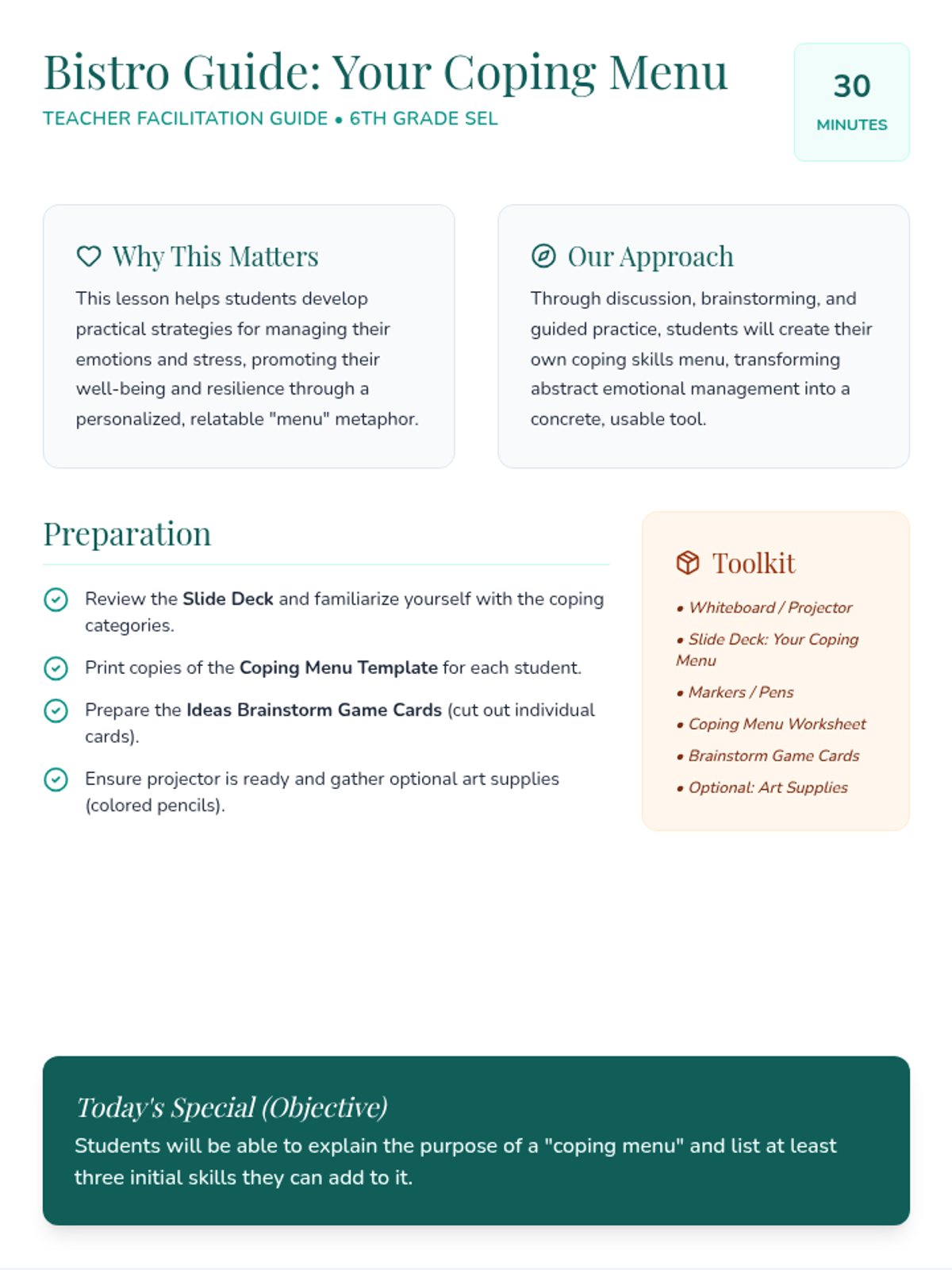 A 30-minute lesson for 6th graders to identify and categorize personalized coping strategies using a 'menu' metaphor to manage emotions and build resilience.