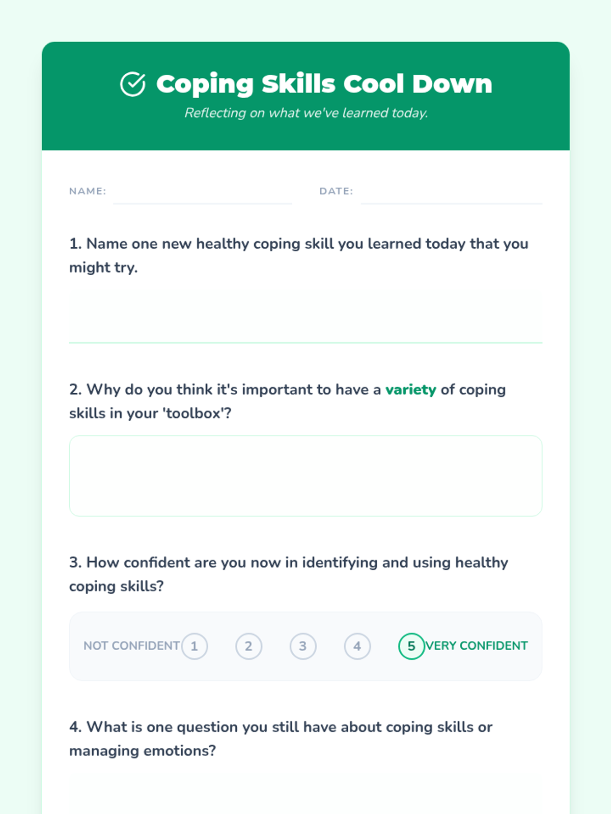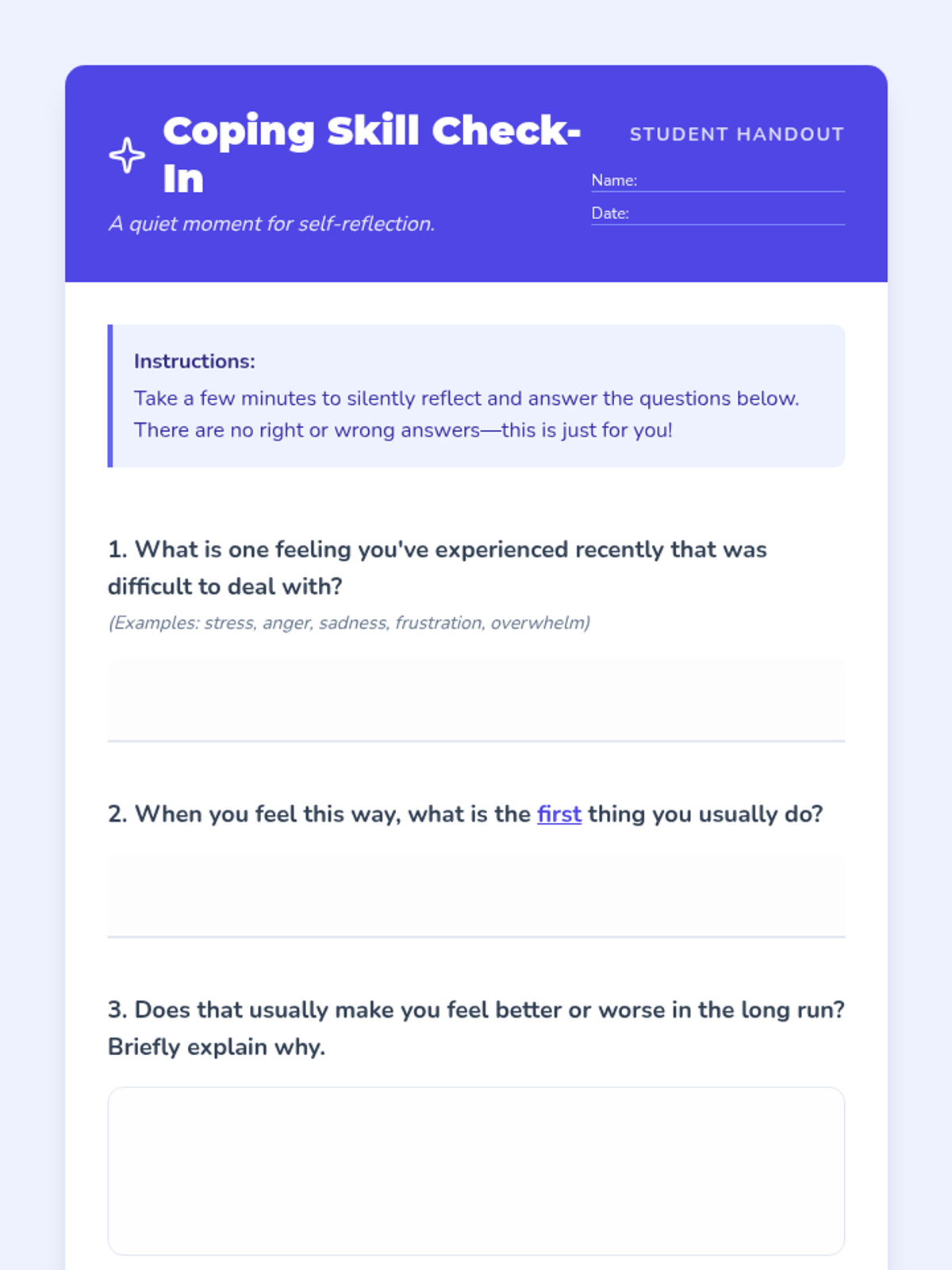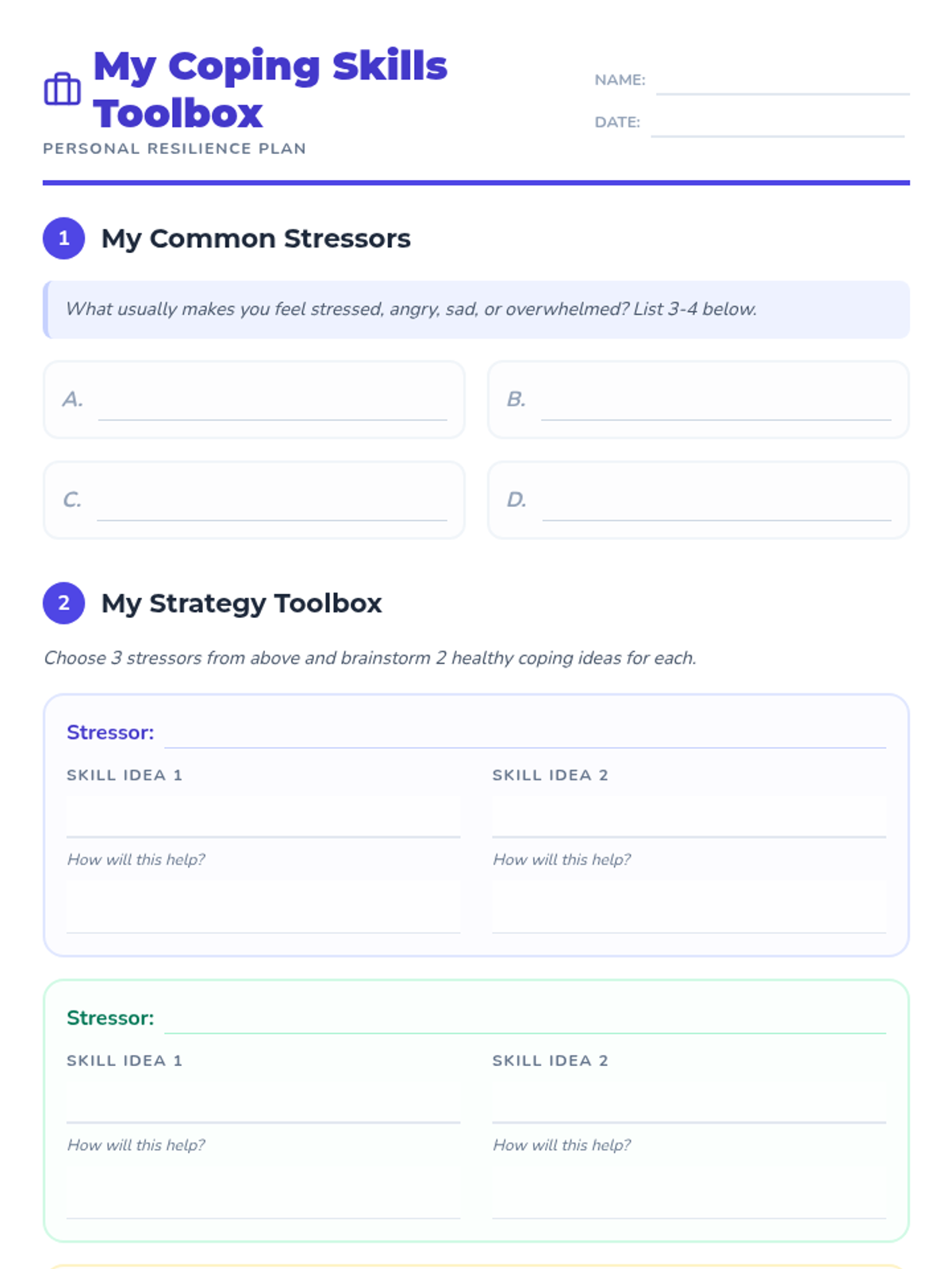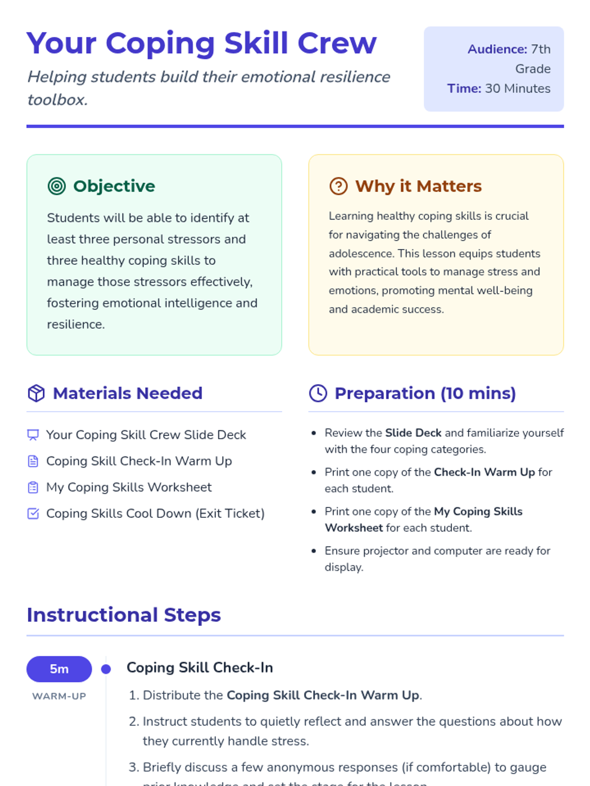 A 30-minute SEL lesson for 7th graders to identify stressors and build a personal toolbox of healthy coping skills across physical, creative, social, and cognitive categories.