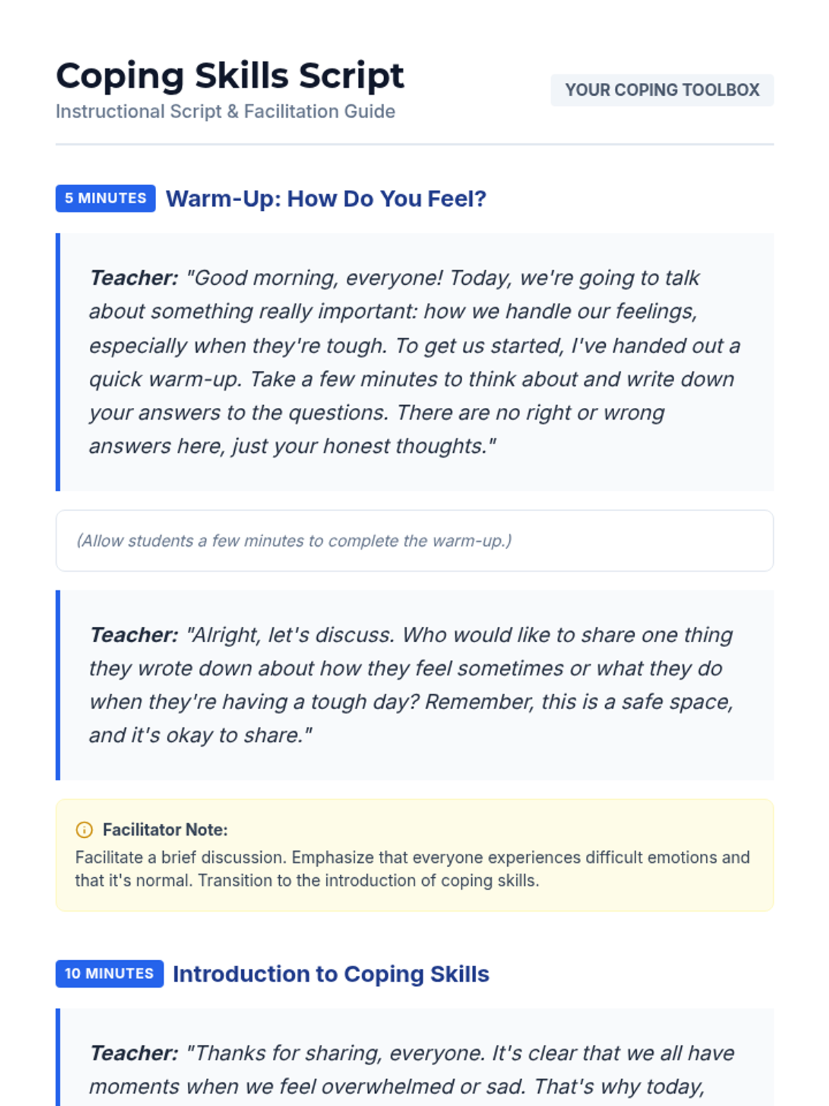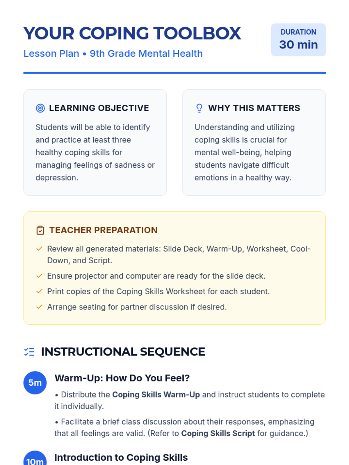 A 30-minute mental health lesson for 9th graders focused on identifying and practicing healthy coping strategies for managing sadness and depression through the metaphor of a personal toolbox.