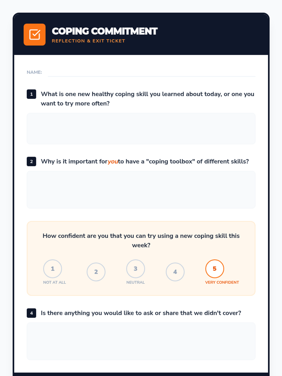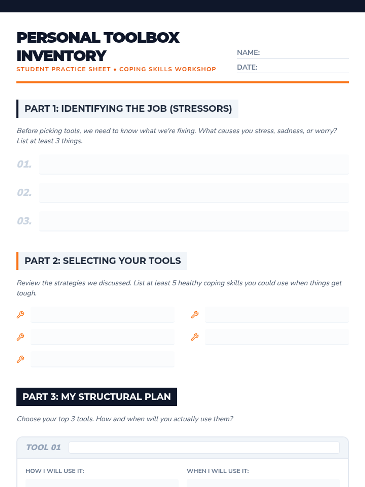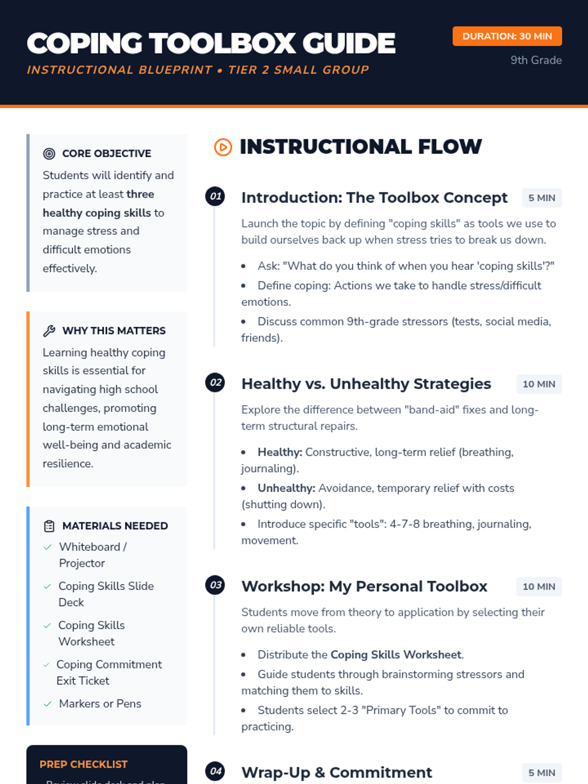 A 30-minute Tier 2 small group lesson for 9th-grade students to identify and practice healthy coping skills for managing stress and emotions. Students build a personal 'coping toolbox' through discussion and interactive activities.