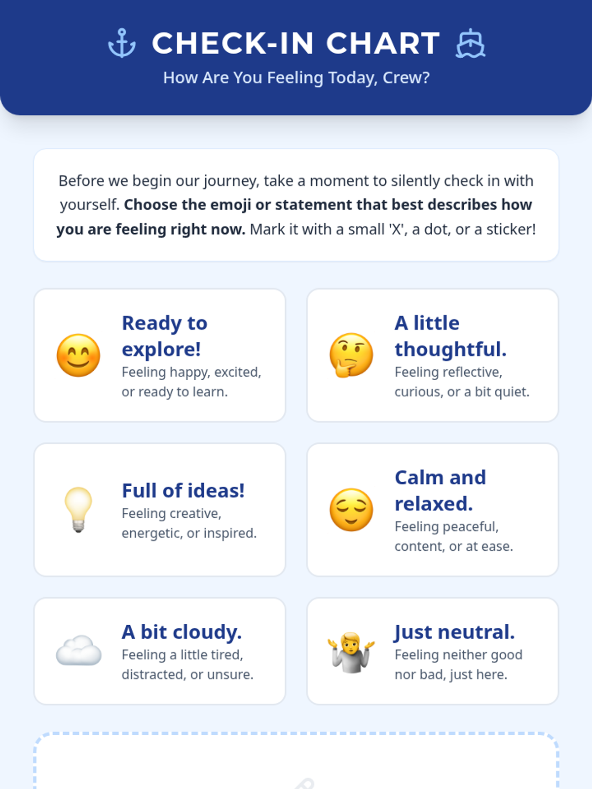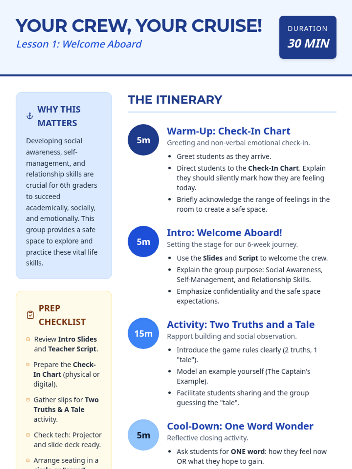This introductory lesson sets the stage for a 6-week SEL group for 6th graders, focusing on social awareness, self-management, and relationship skills through maritime-themed rapport-building.
