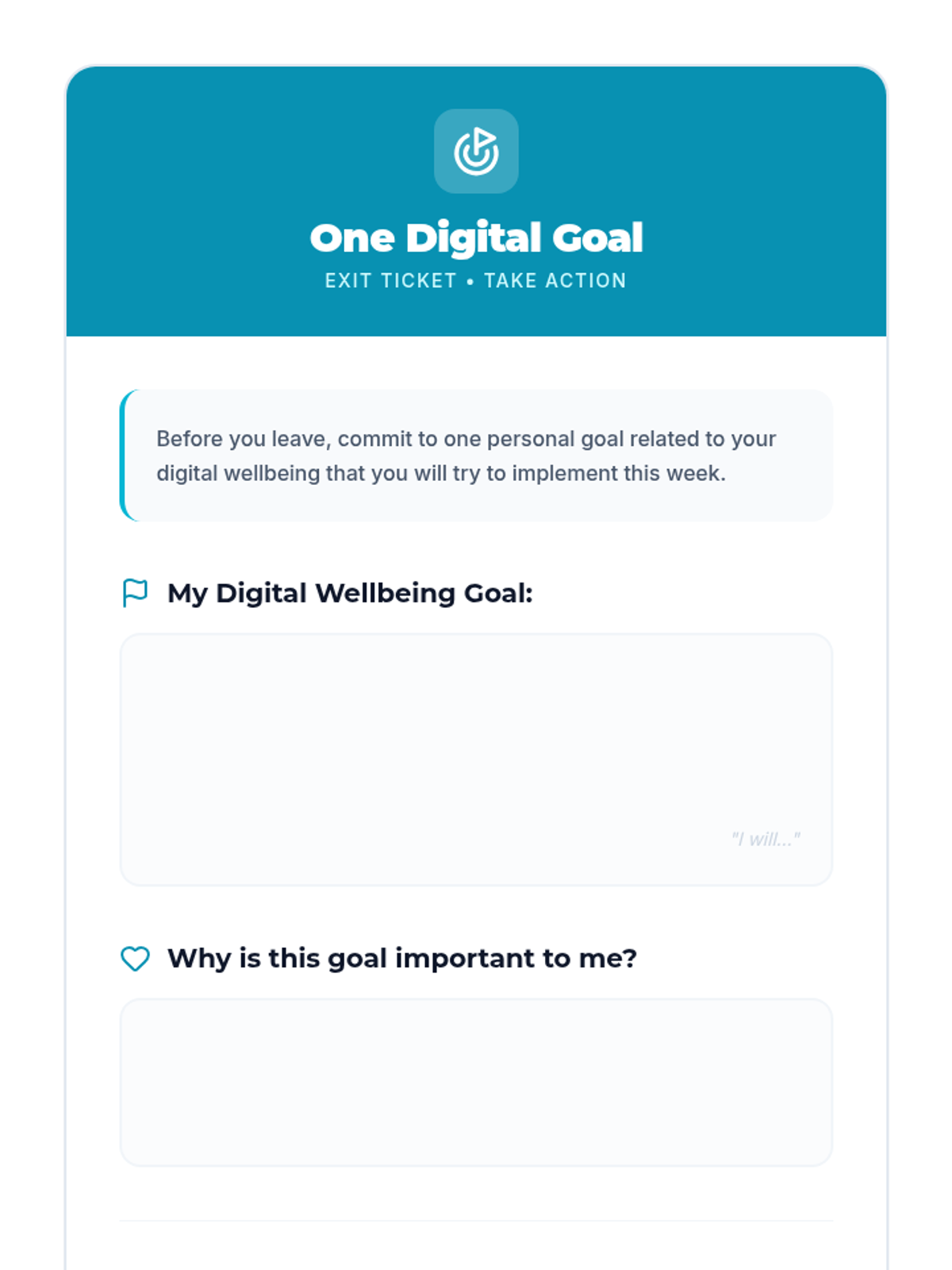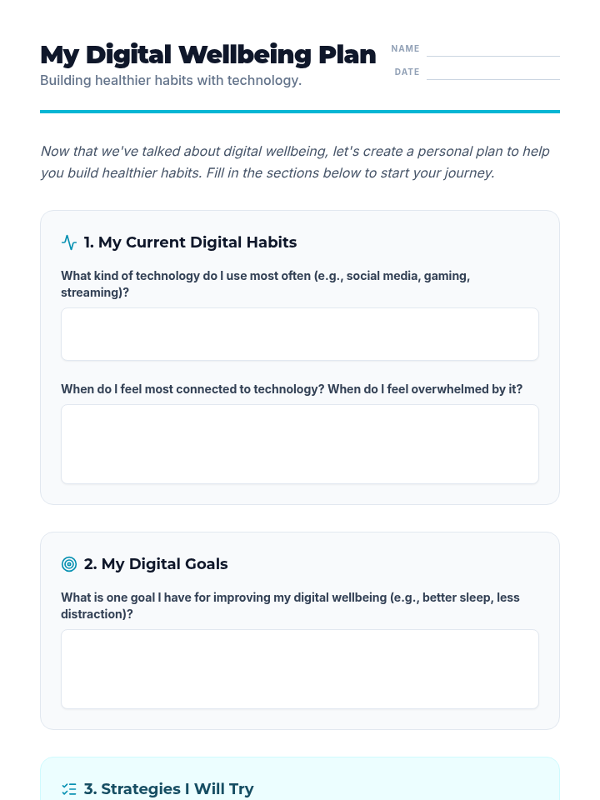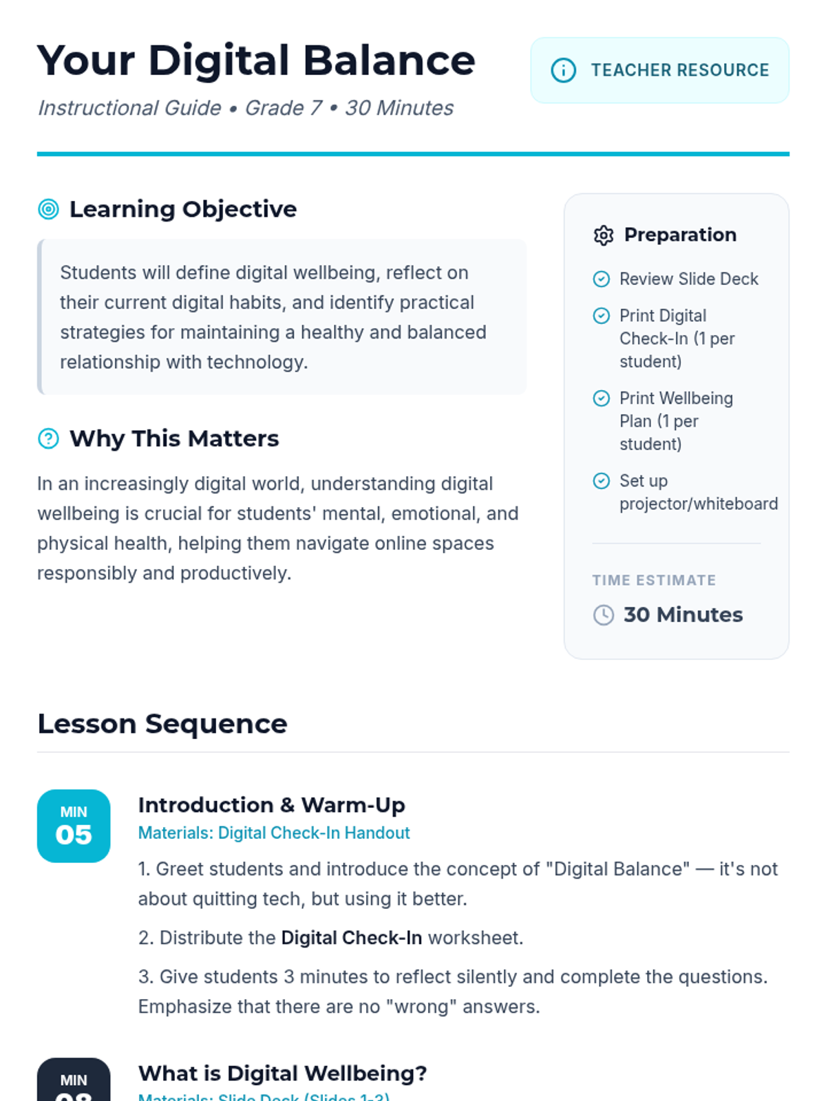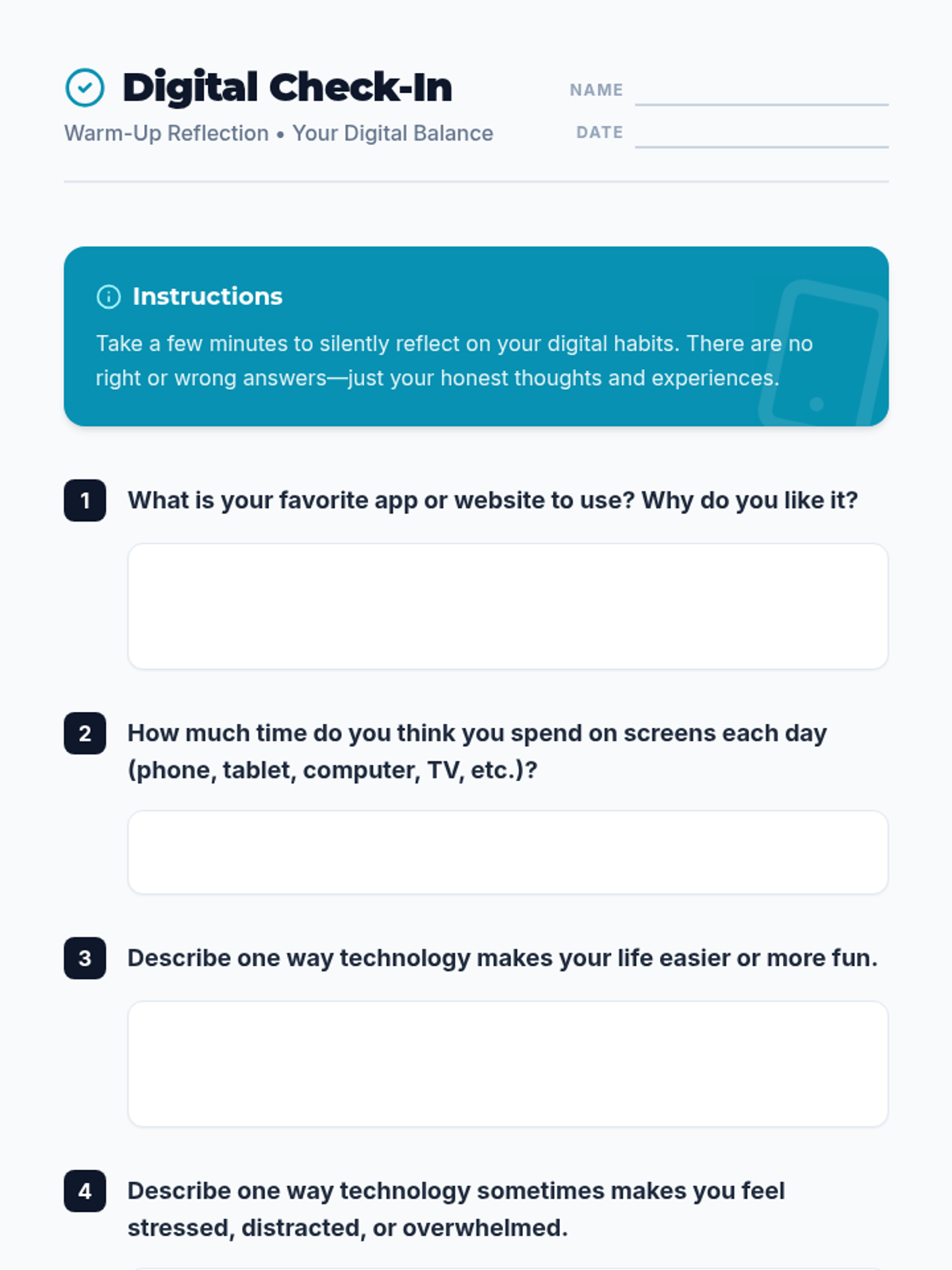 A 30-minute lesson for 7th graders to explore digital wellbeing, reflect on their technology habits, and create a personal balance plan.