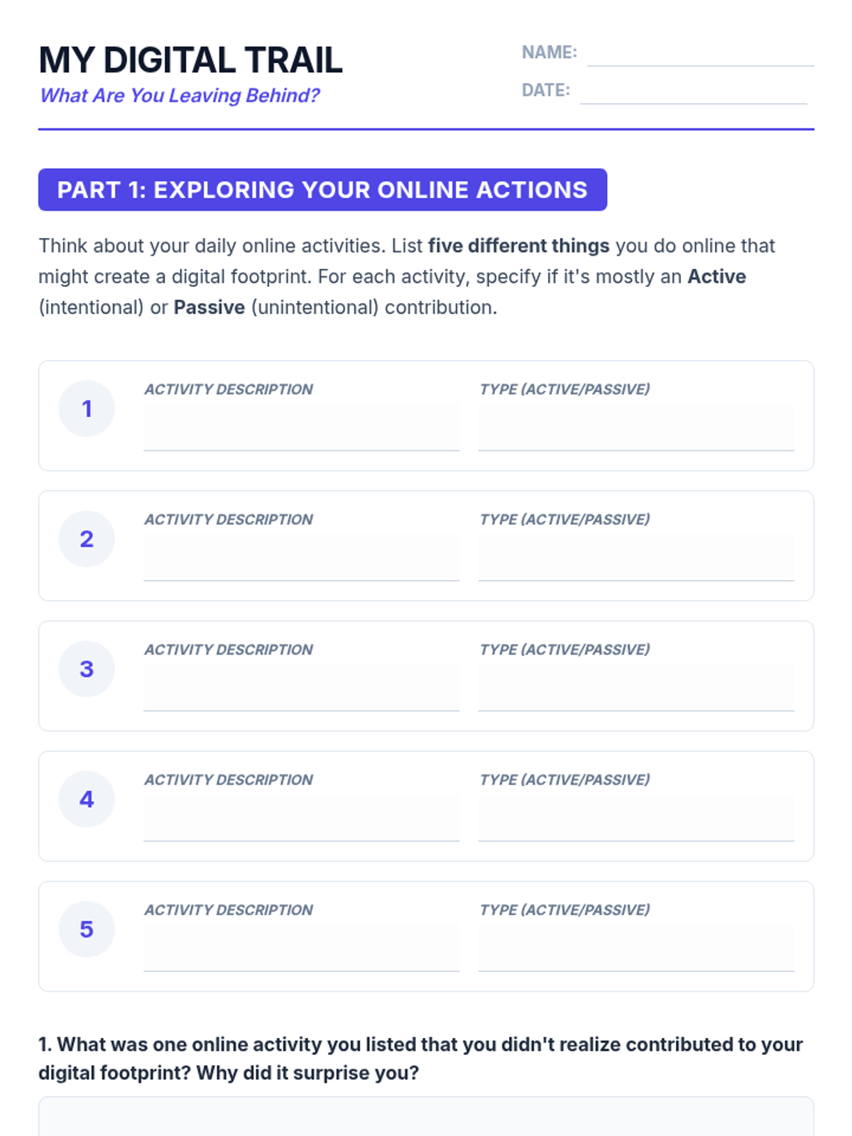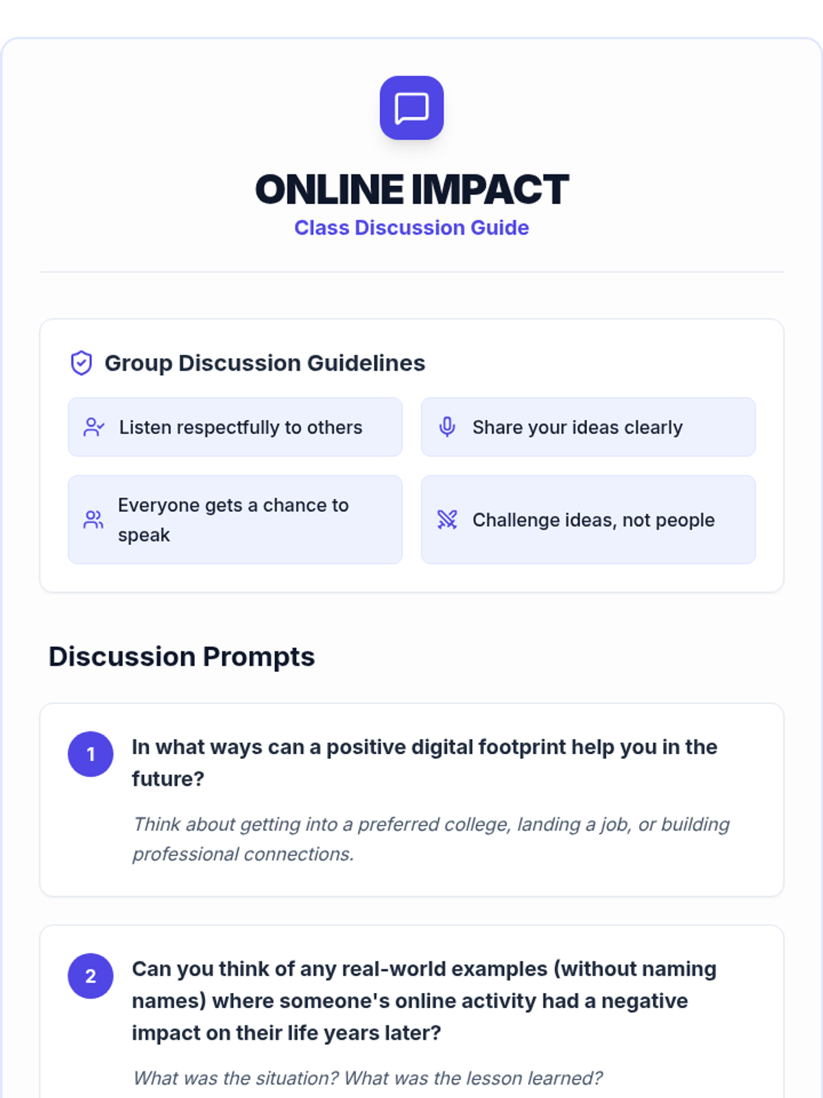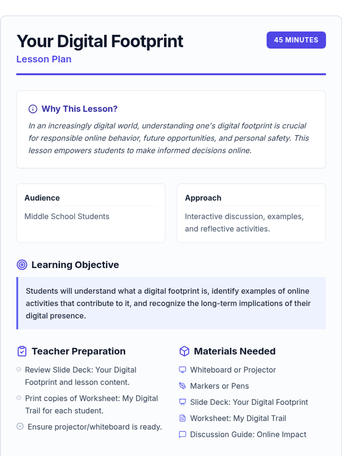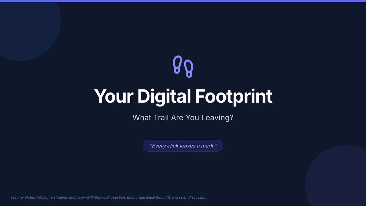 Teaches students about their digital footprint and the lasting impact of their online actions, emphasizing responsible behavior and digital citizenship.