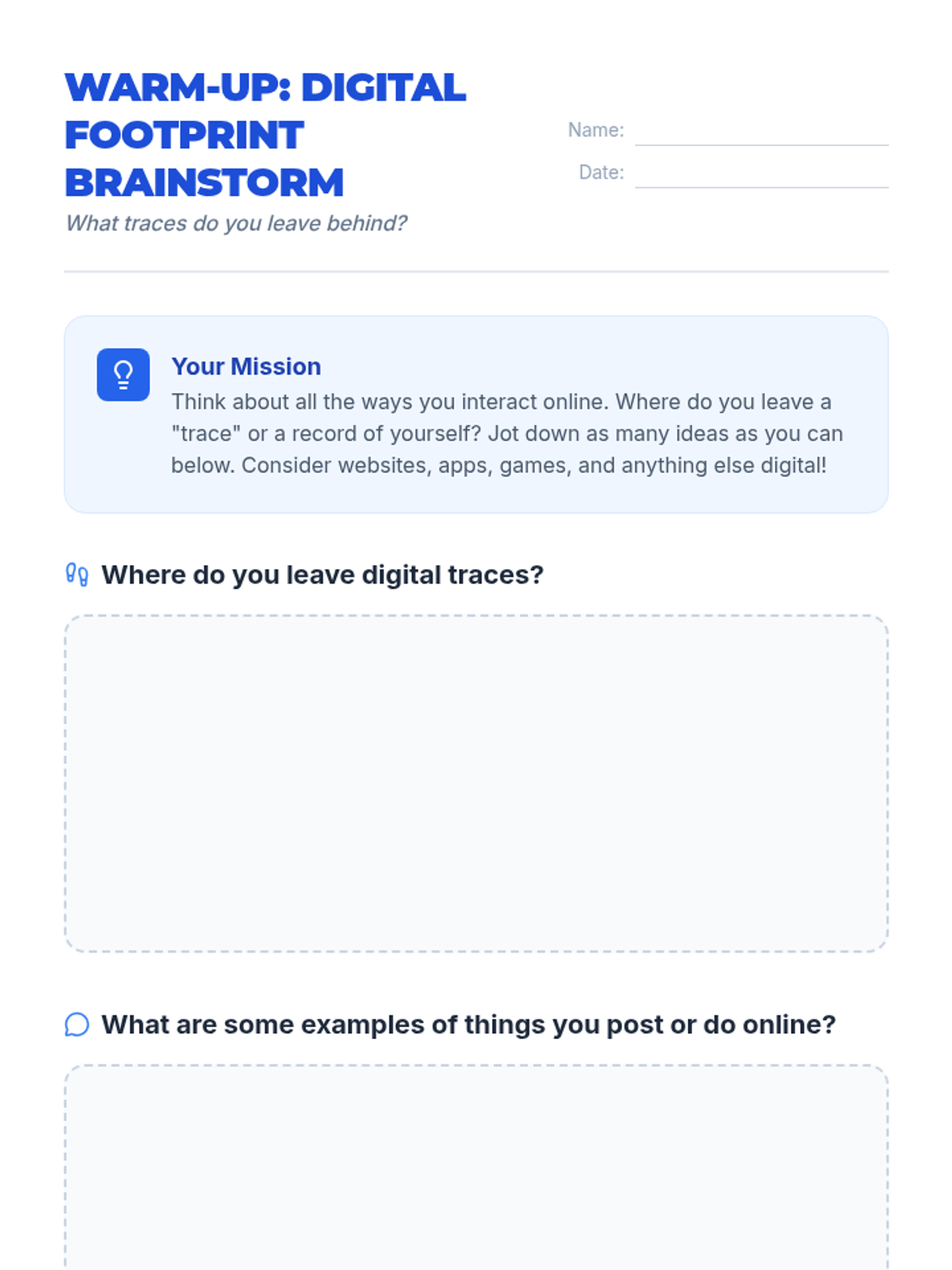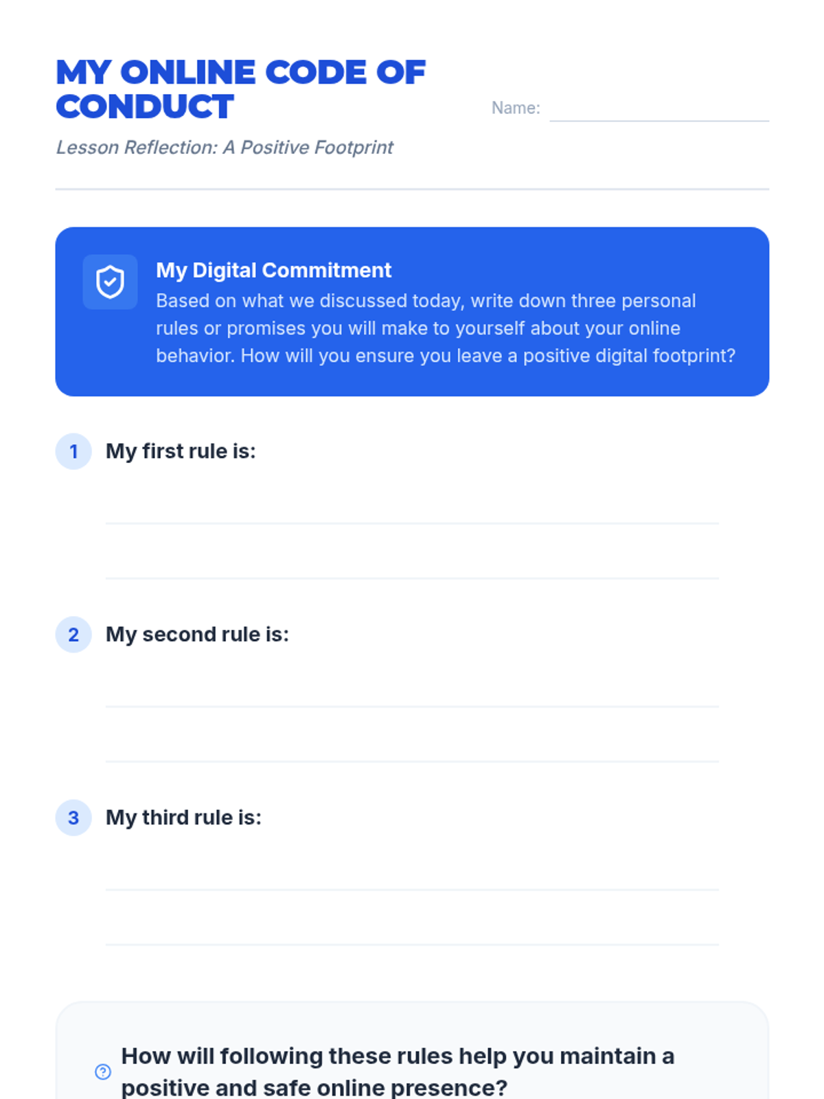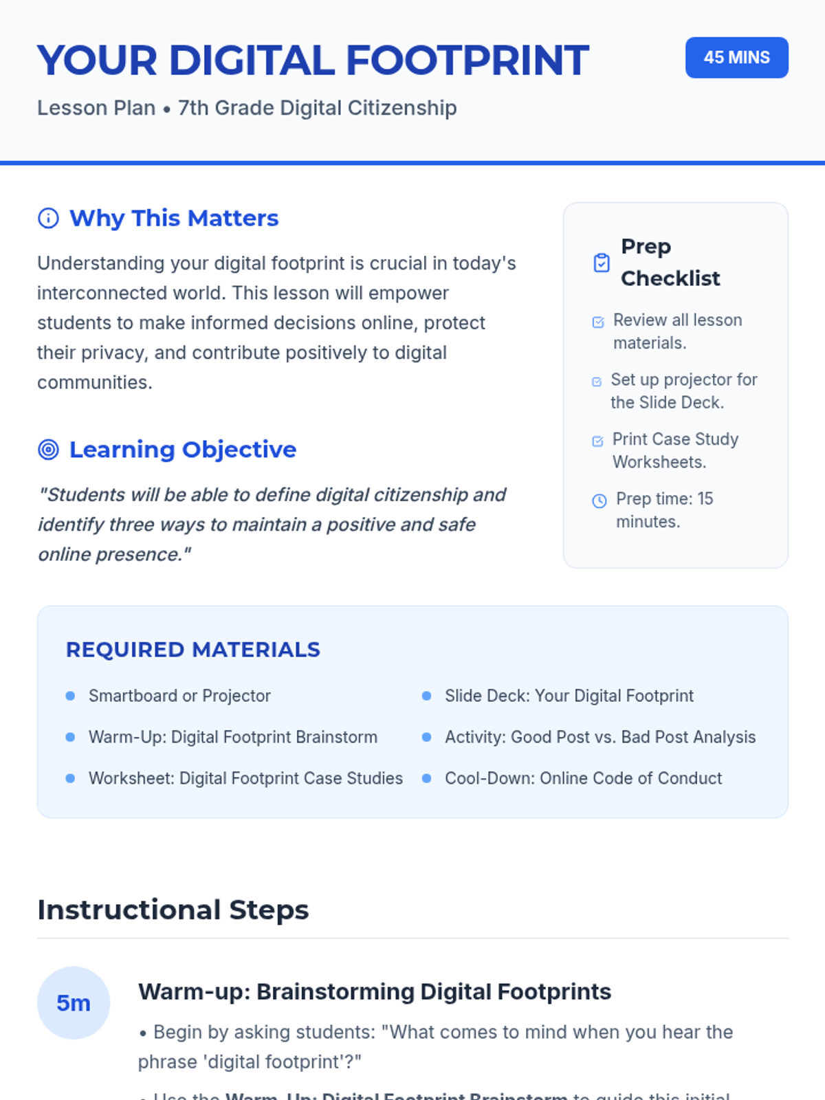 A 45-minute lesson for 7th graders to understand digital footprints, online safety, and netiquette through interactive analysis and personal reflection.