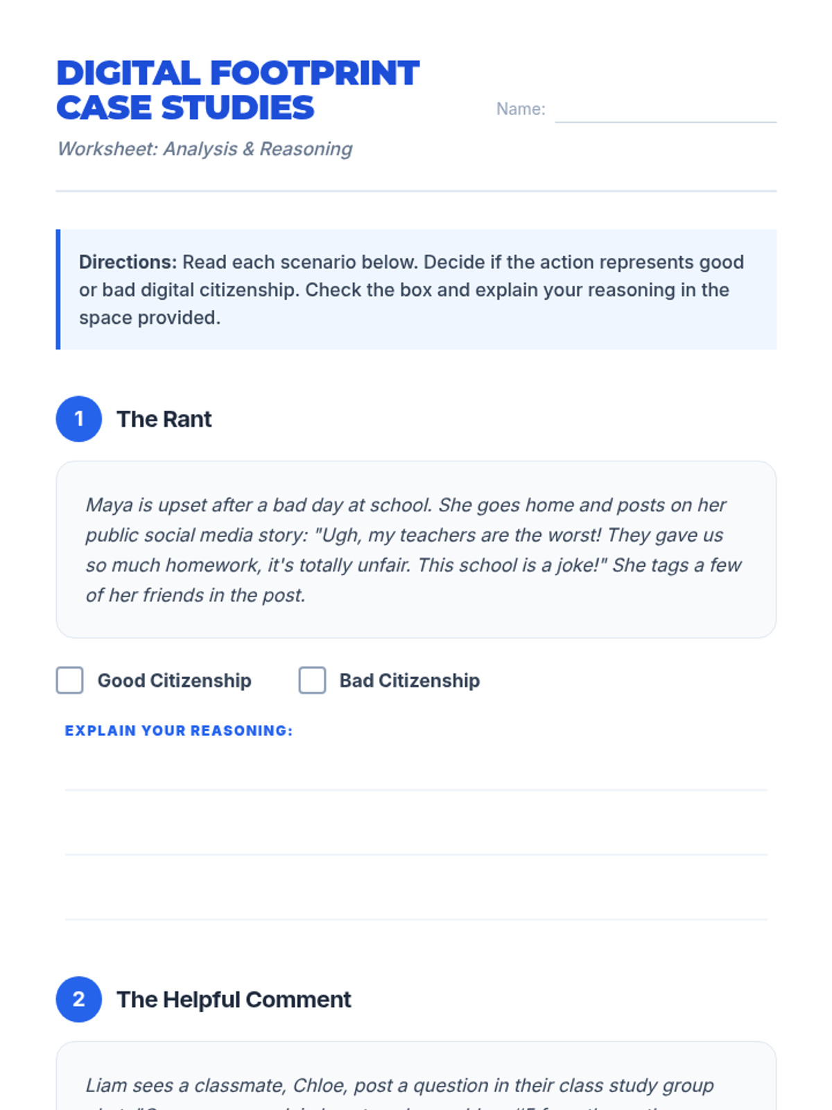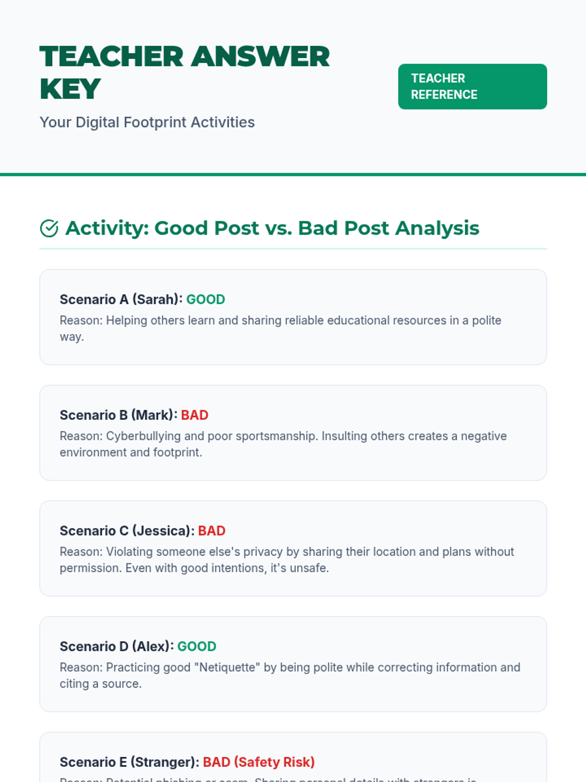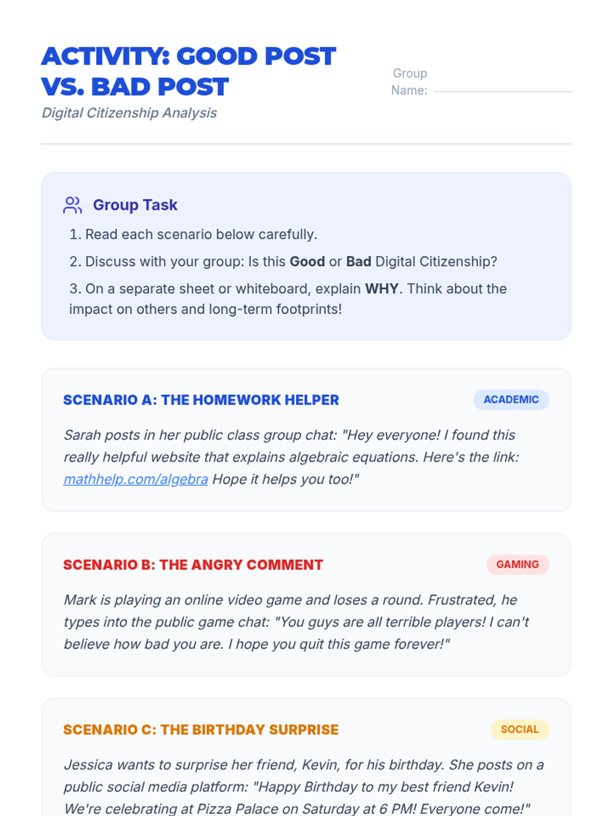 A 45-minute lesson for 7th graders to understand digital footprints, online safety, and netiquette through interactive analysis and personal reflection.