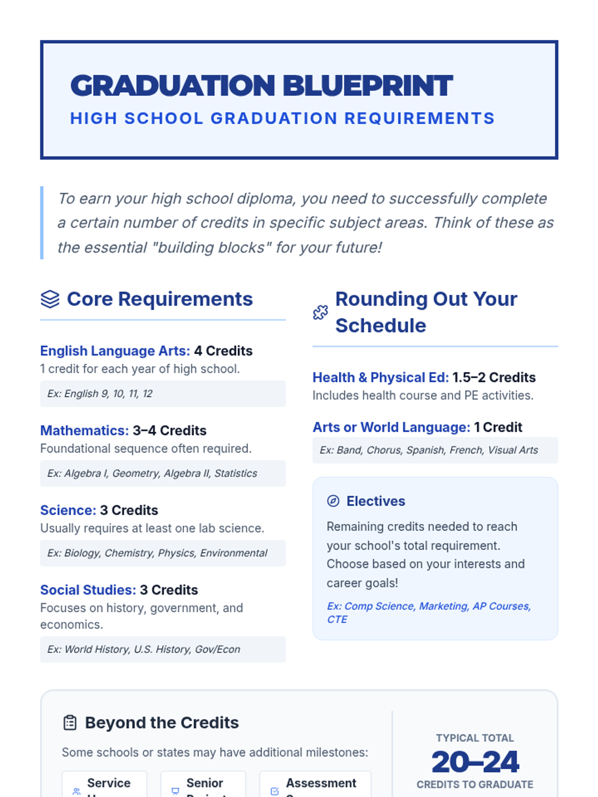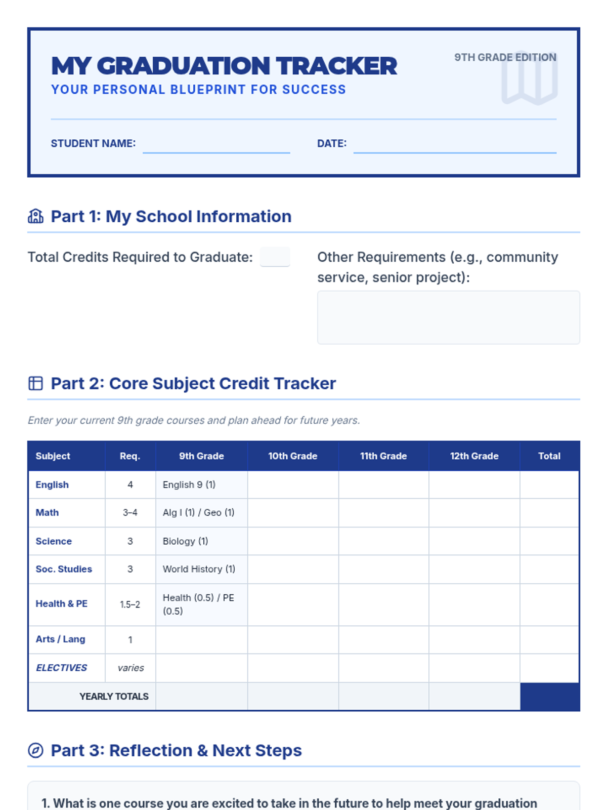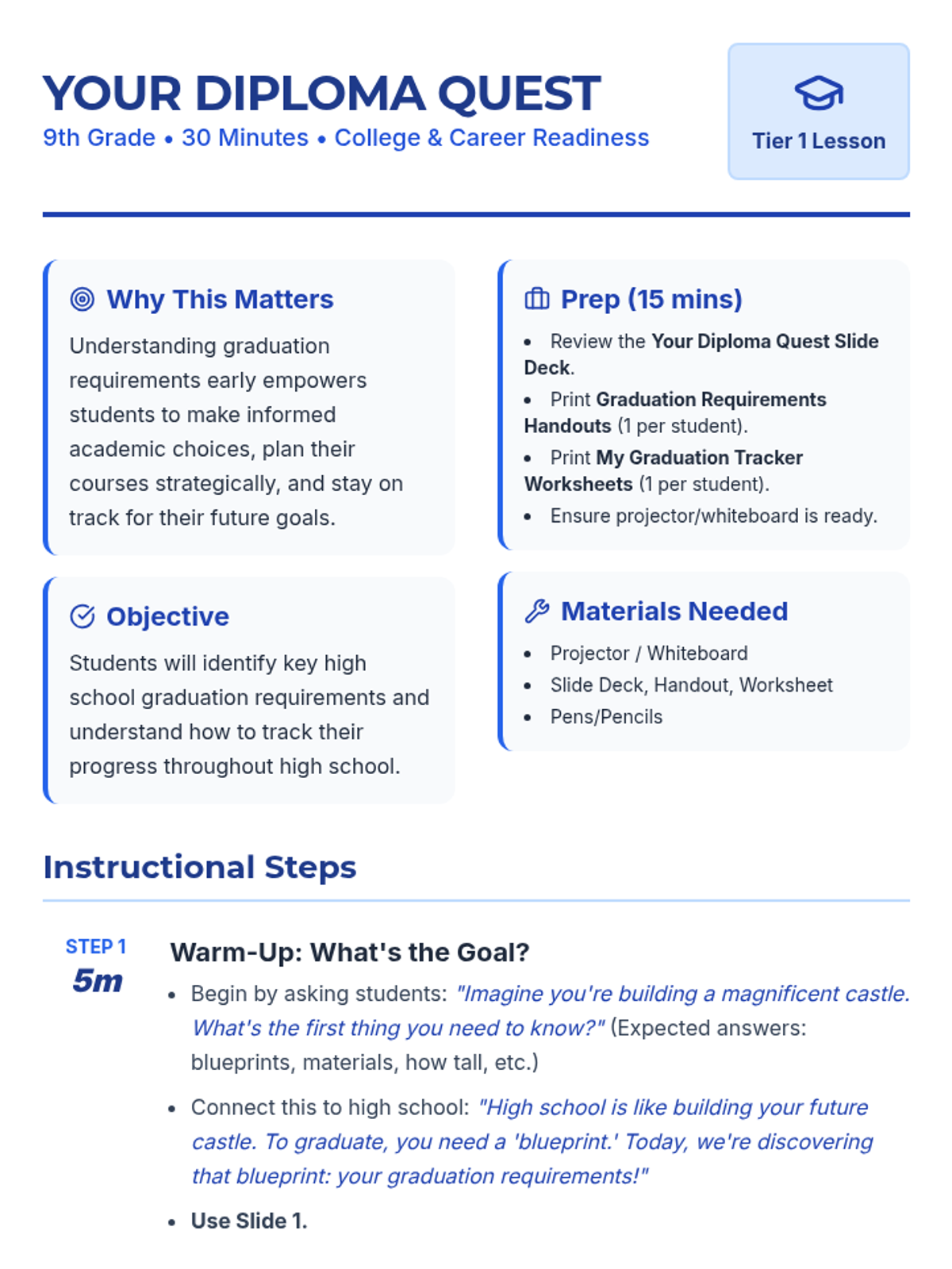 This lesson guides 9th-grade students through their high school graduation requirements in a fun, interactive 'quest' format. Students will explore their 'blueprint' for success, identifying core credit requirements and beginning to track their personal progress towards a diploma.