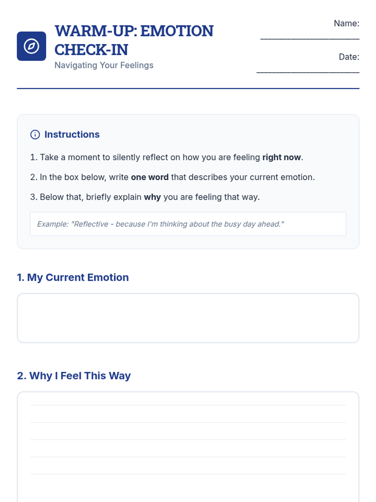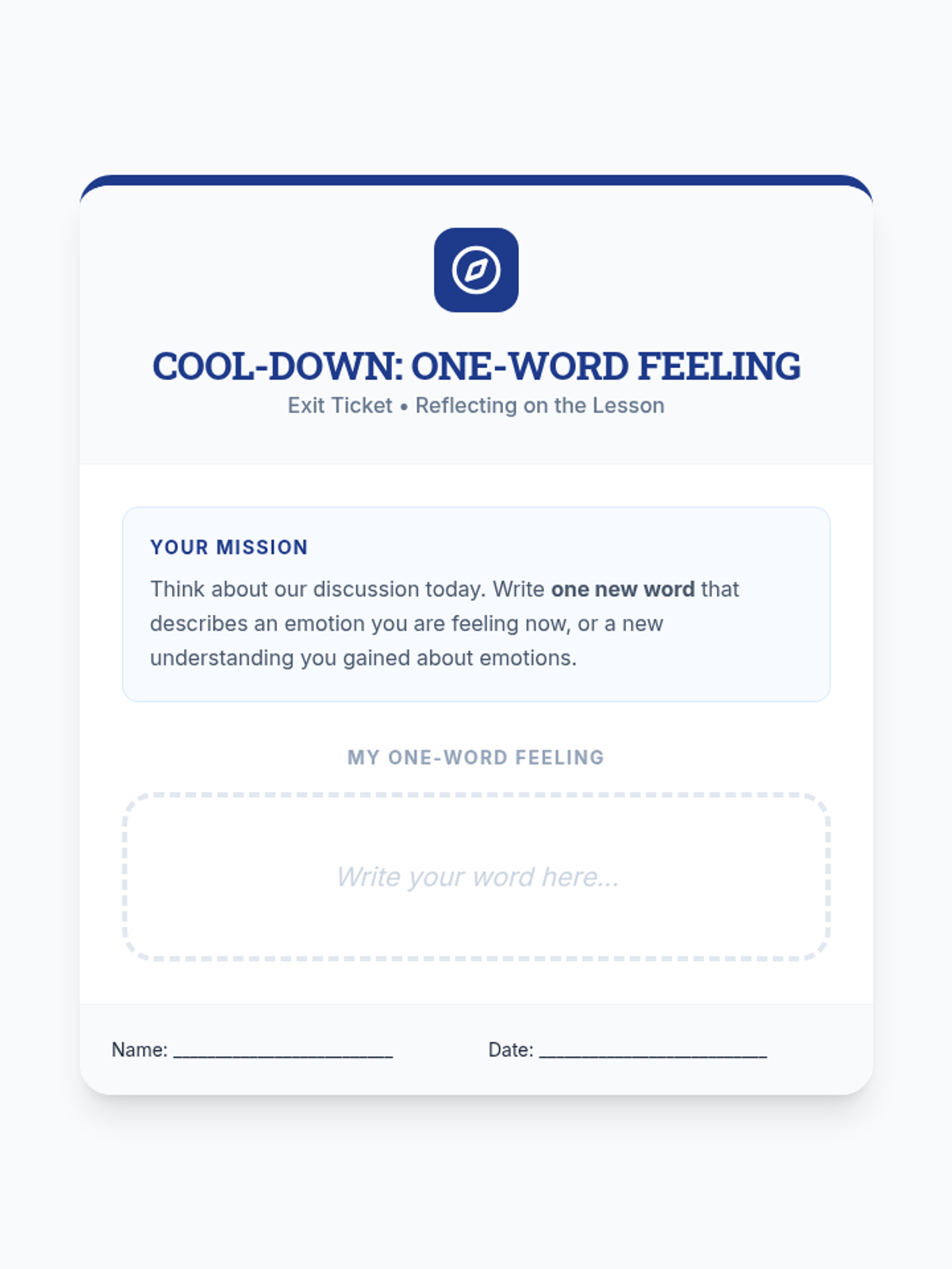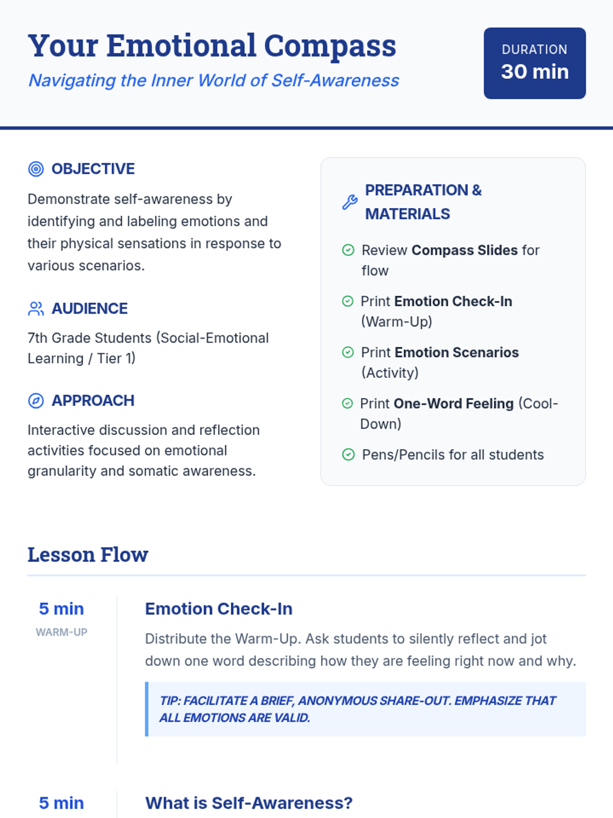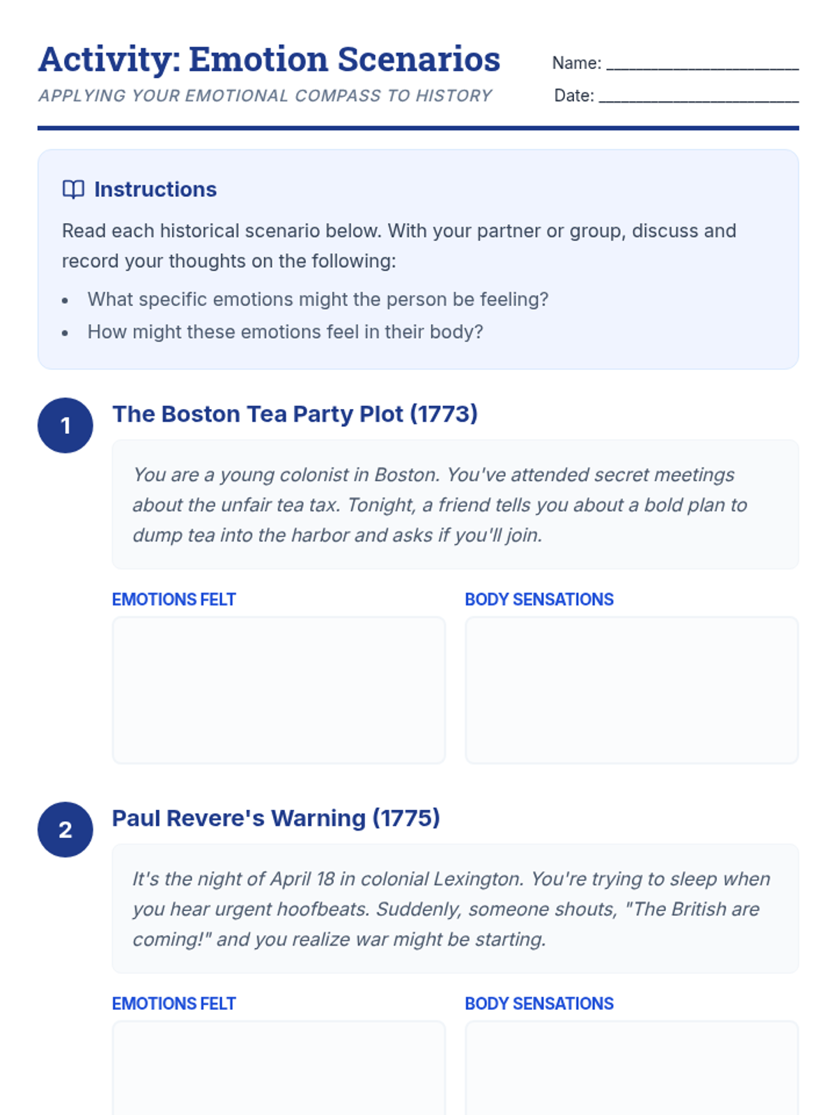 A 30-minute session for 7th-grade students to explore self-awareness through the lens of emotional recognition and physical sensations. Students will analyze historical scenarios to identify complex feelings and expand their emotional vocabulary.