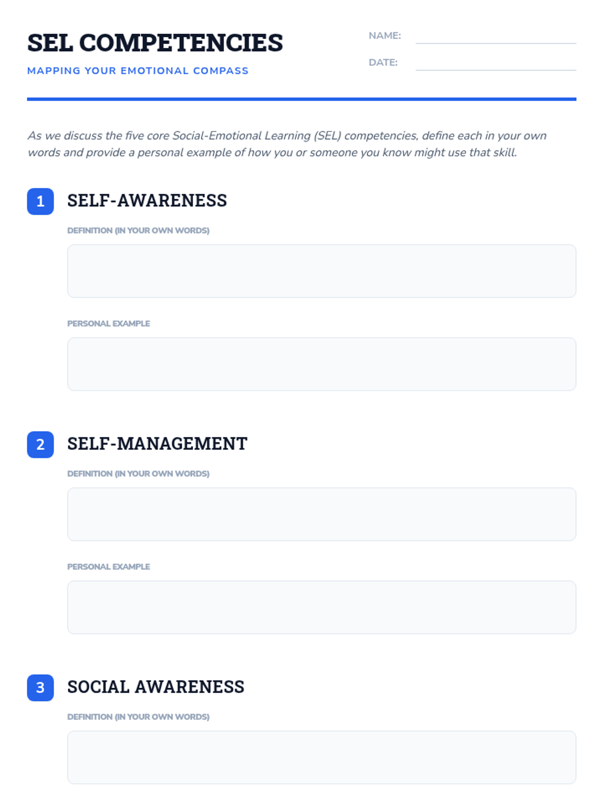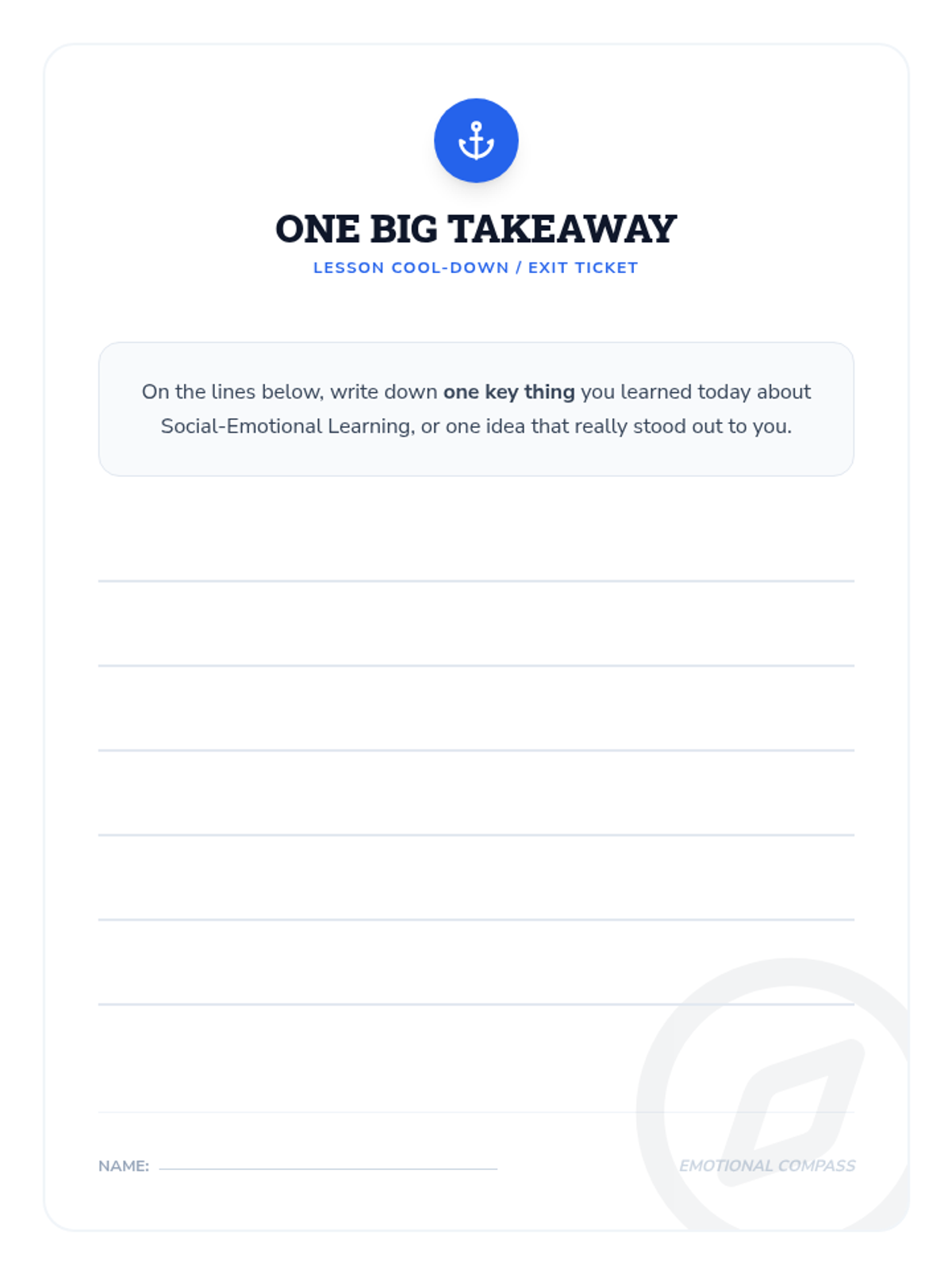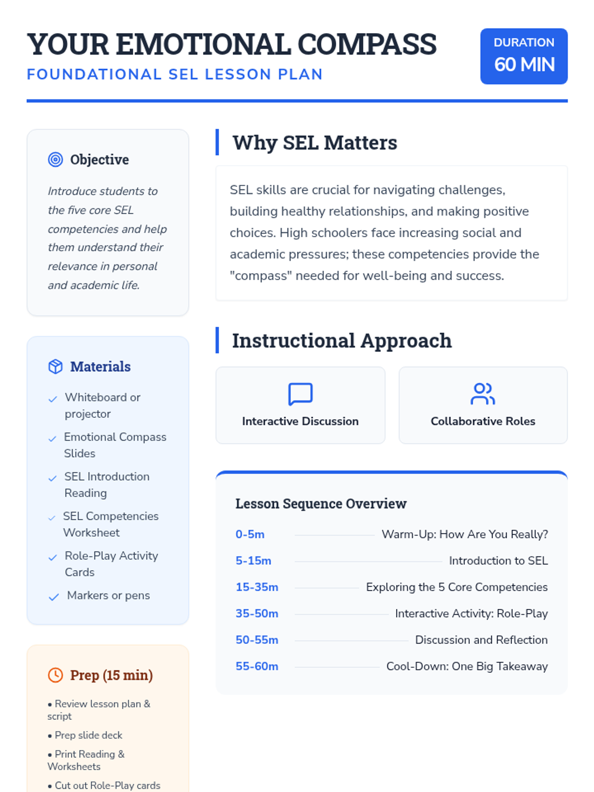 A foundational SEL lesson for 9th-10th graders exploring the five core competencies (Self-Awareness, Self-Management, Social Awareness, Relationship Skills, Responsible Decision-Making) using a navigation-themed 'Emotional Compass' metaphor.