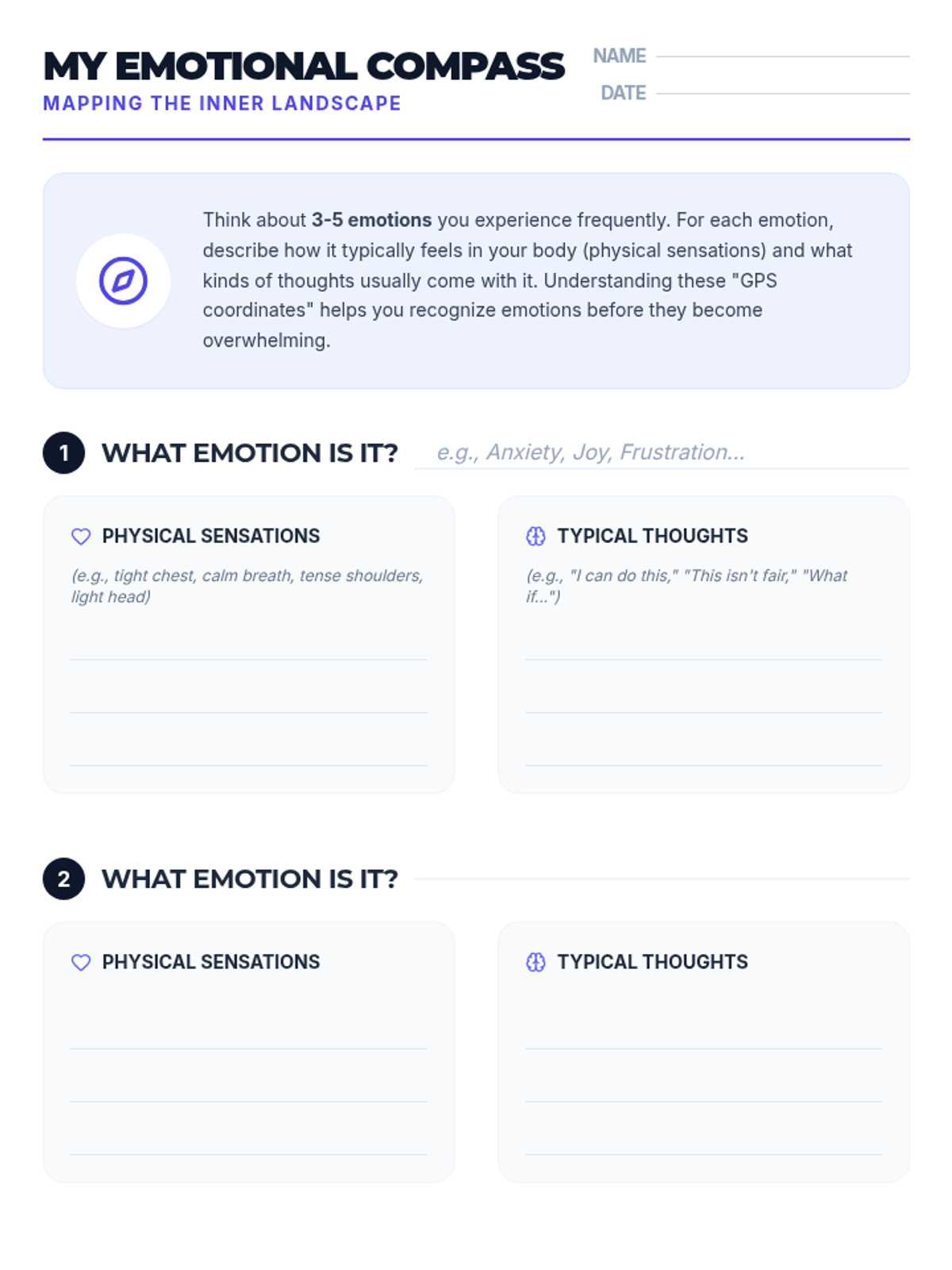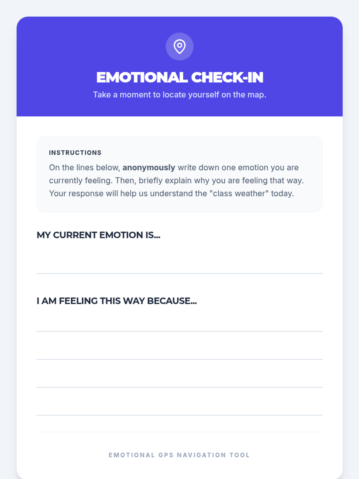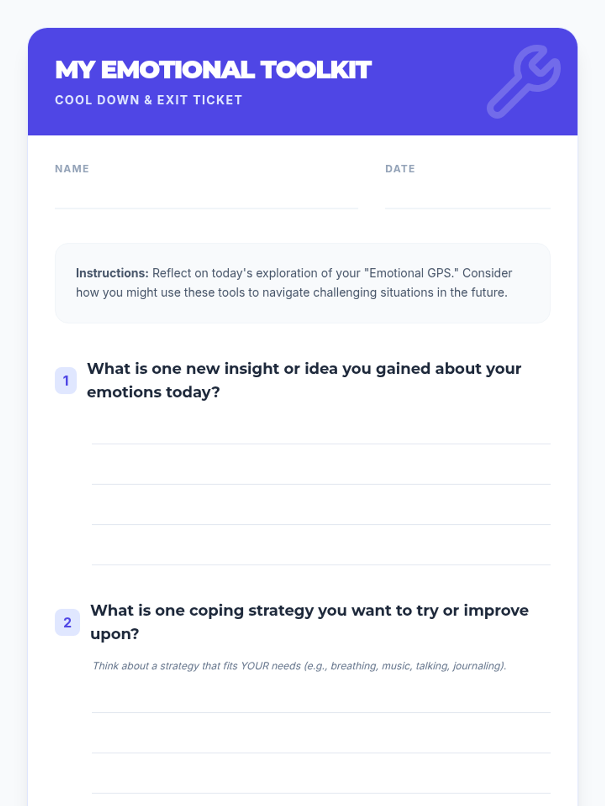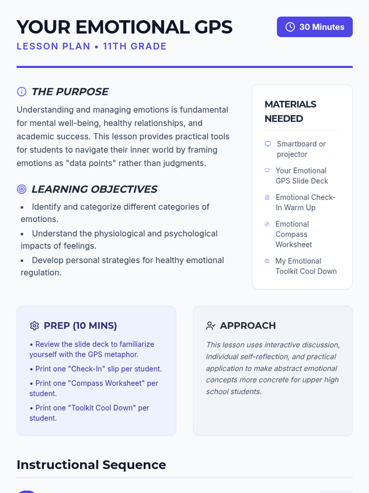 This 30-minute lesson helps 11th-grade students recognize and manage their emotions by framing them as an 'Emotional GPS'—signals that provide information about their needs and environment. Students will identify physical and mental manifestations of emotions and build a personalized toolkit of coping strategies.