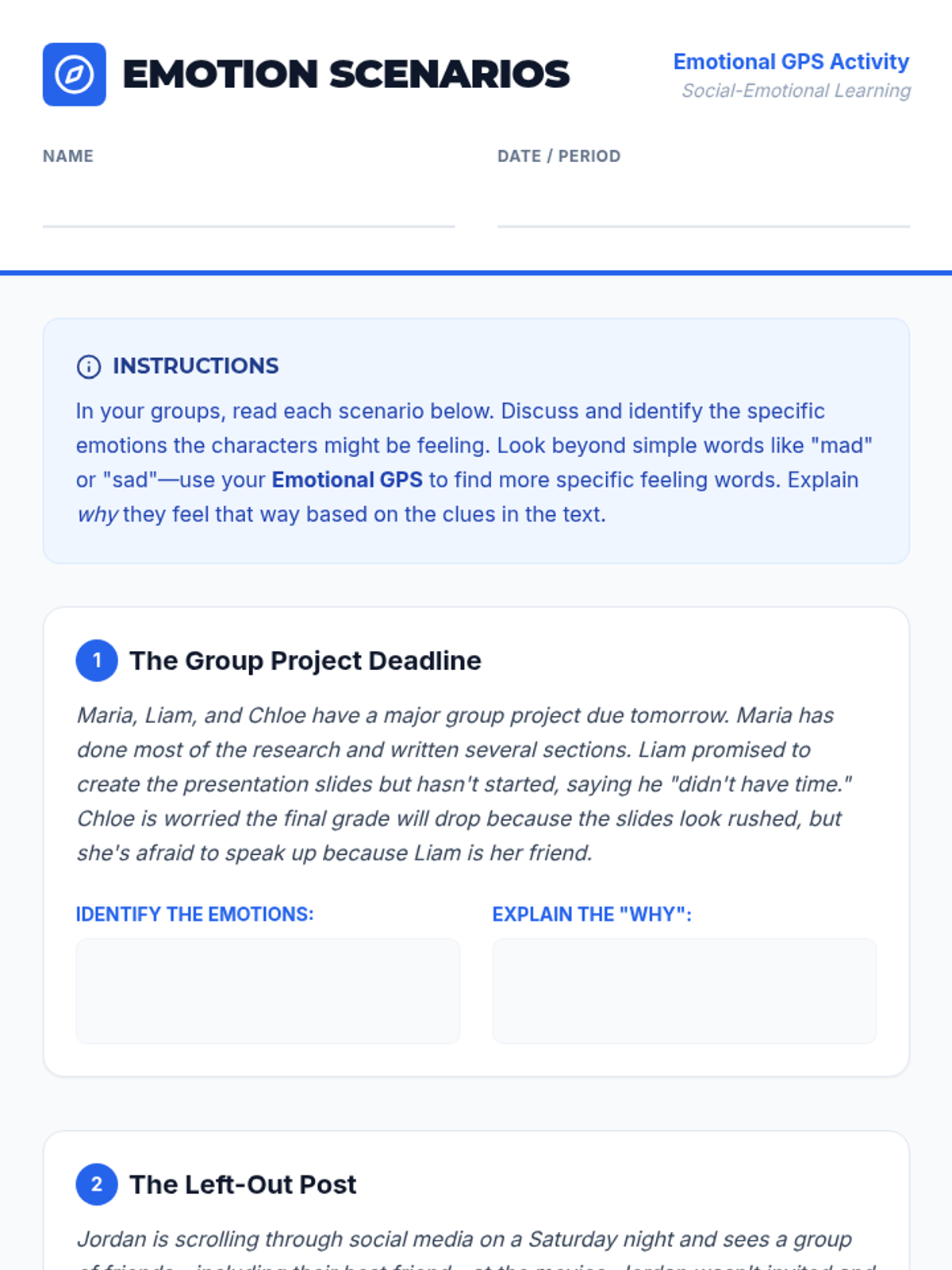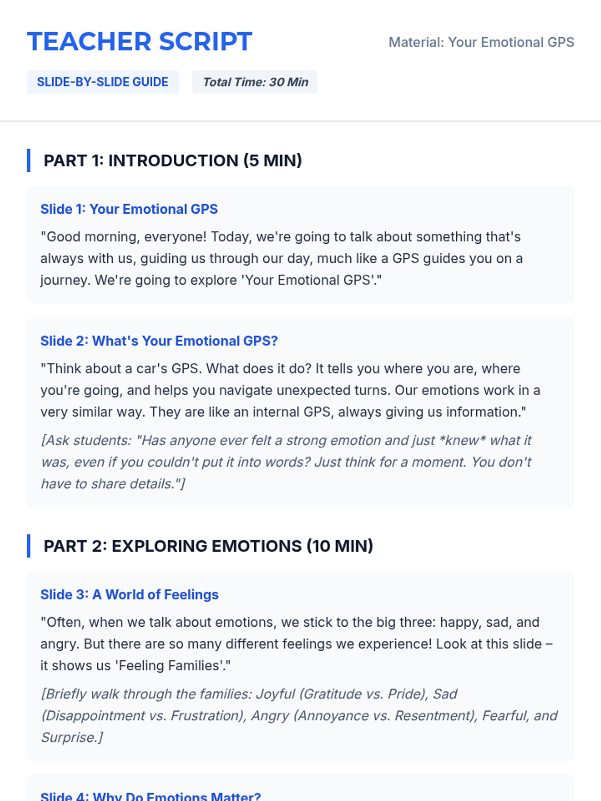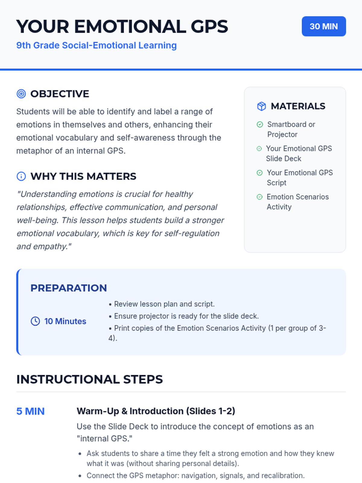 This interactive 30-minute lesson for 9th graders uses a 'GPS' metaphor to help students build emotional literacy and self-awareness. Students explore the nuances of feeling families and practice identifying complex emotions in real-world scenarios.