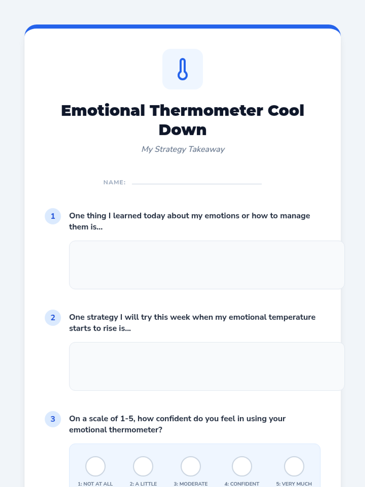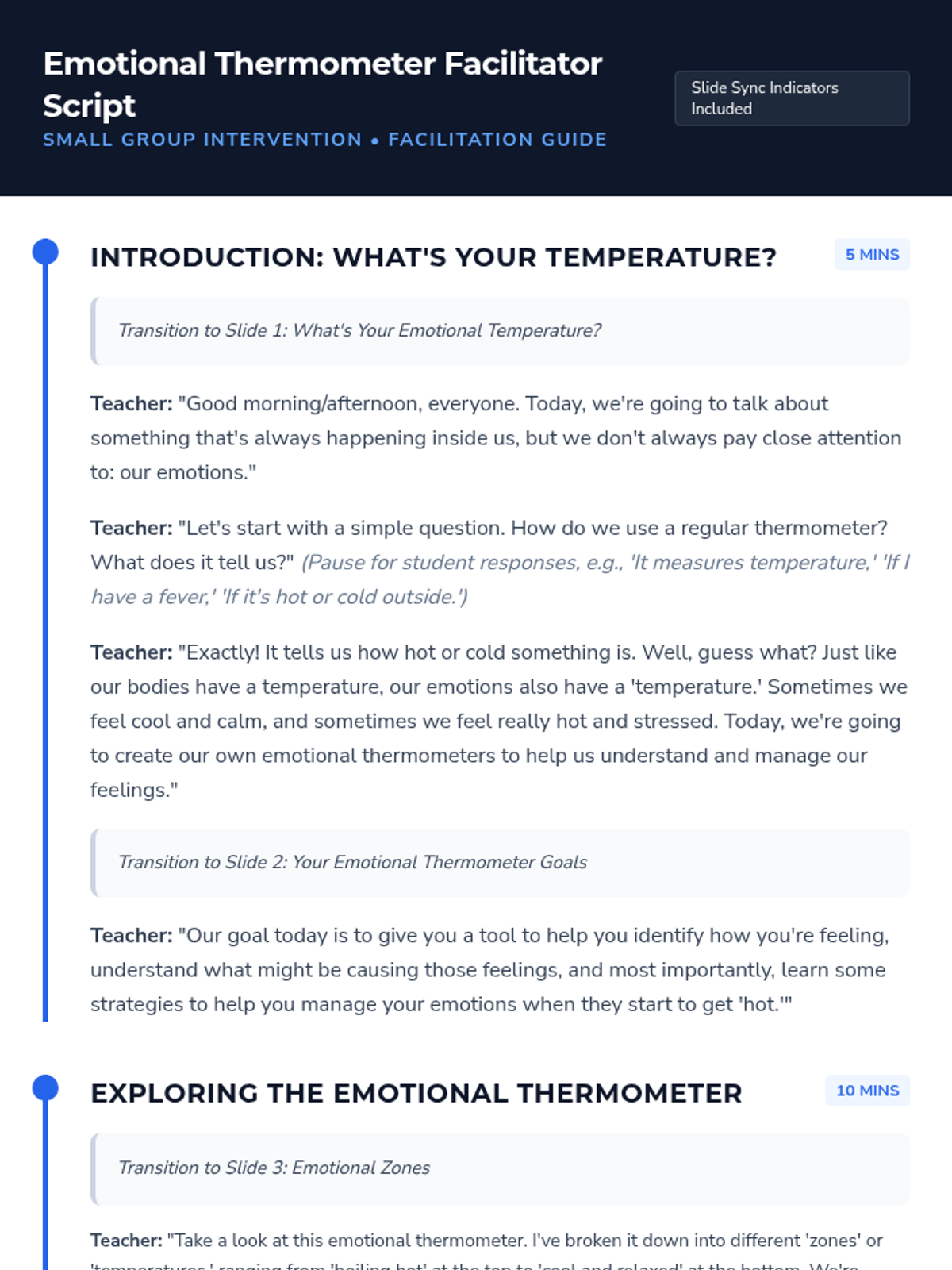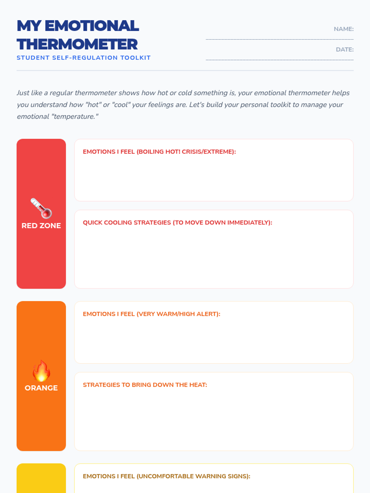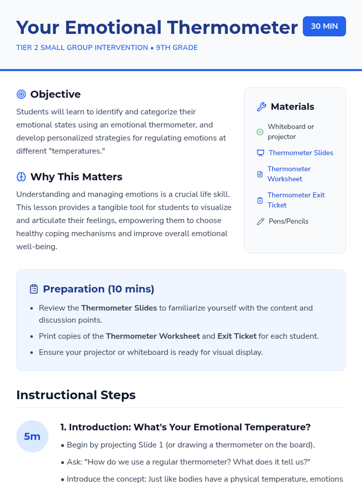 A 30-minute Tier 2 small group lesson for 9th graders to help them understand and regulate their emotions using an emotional thermometer metaphor. Students identify emotional zones and develop personalized coping strategies.