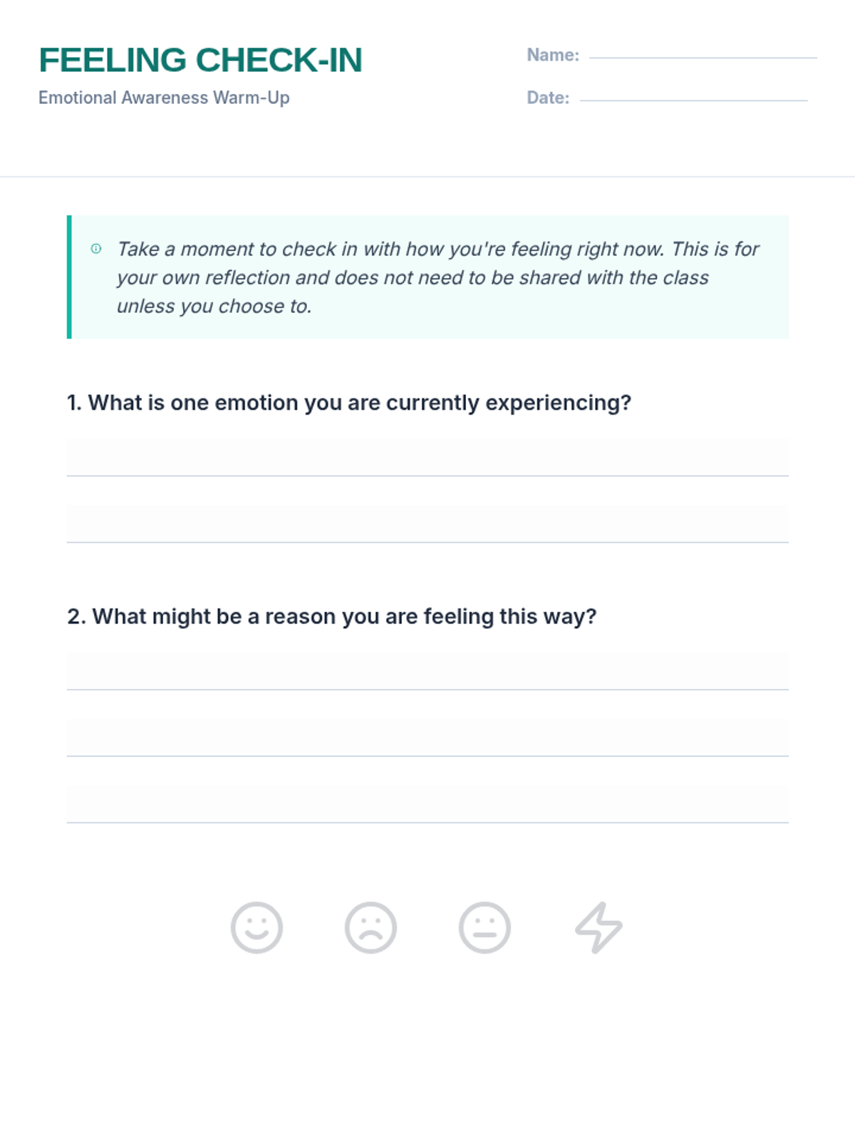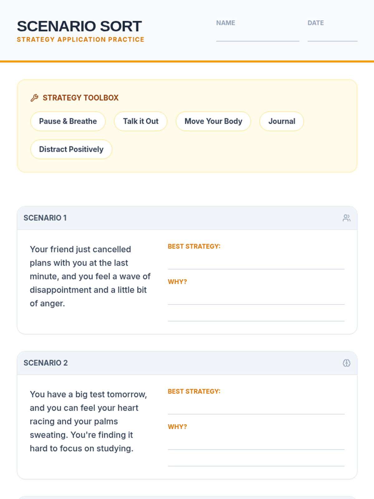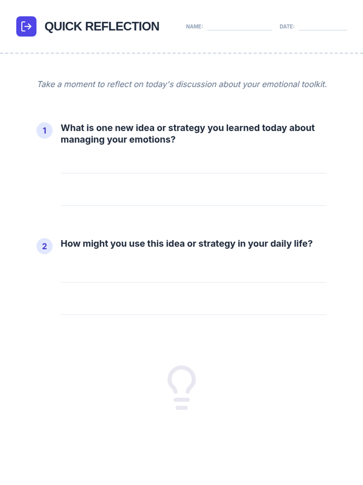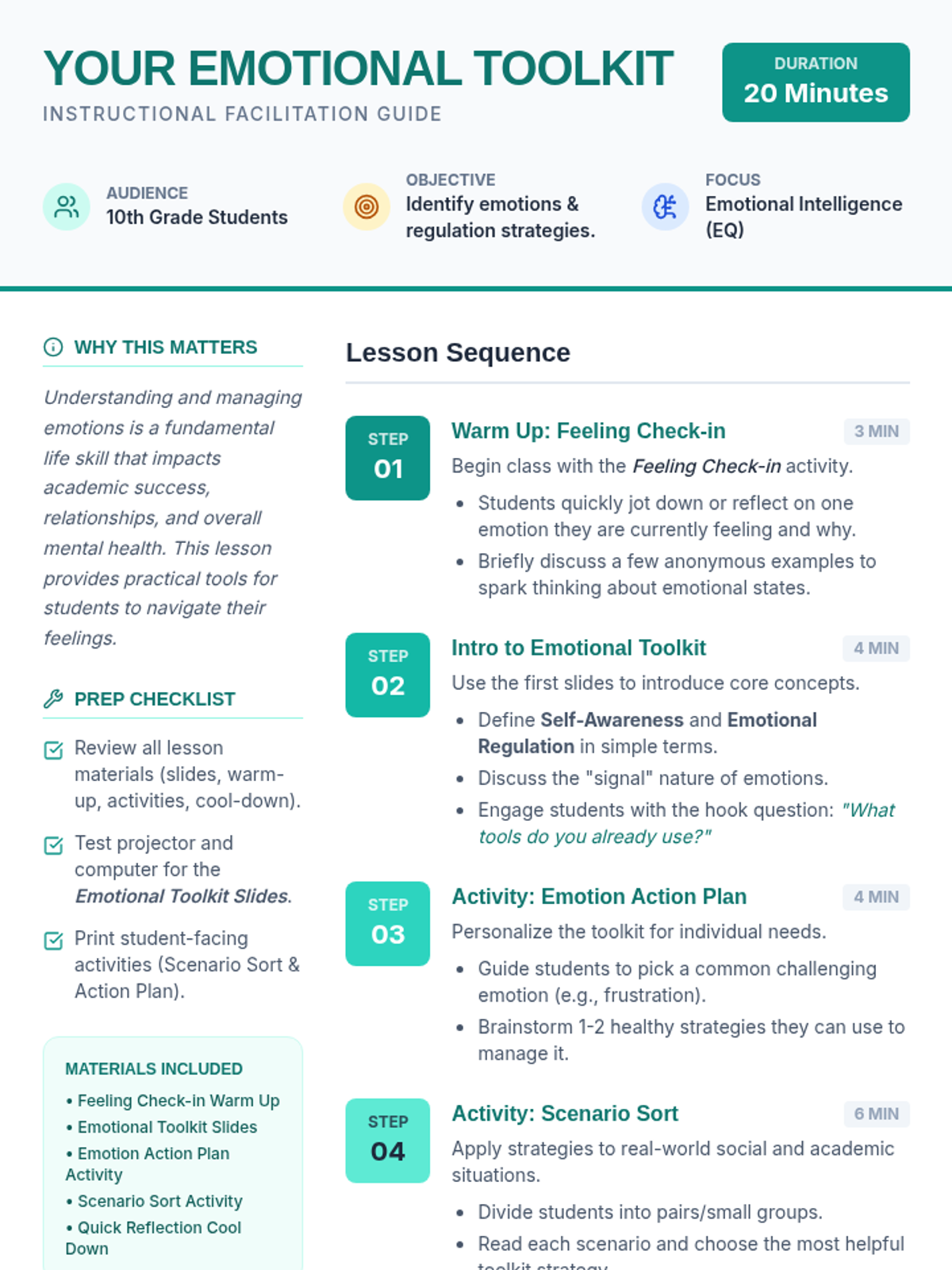 This interactive lesson helps 10th-grade students identify, understand, and regulate their emotions using a practical 'toolkit' of strategies. Students practice self-awareness through personal reflection and scenario-based activities to build resilience and emotional intelligence.
