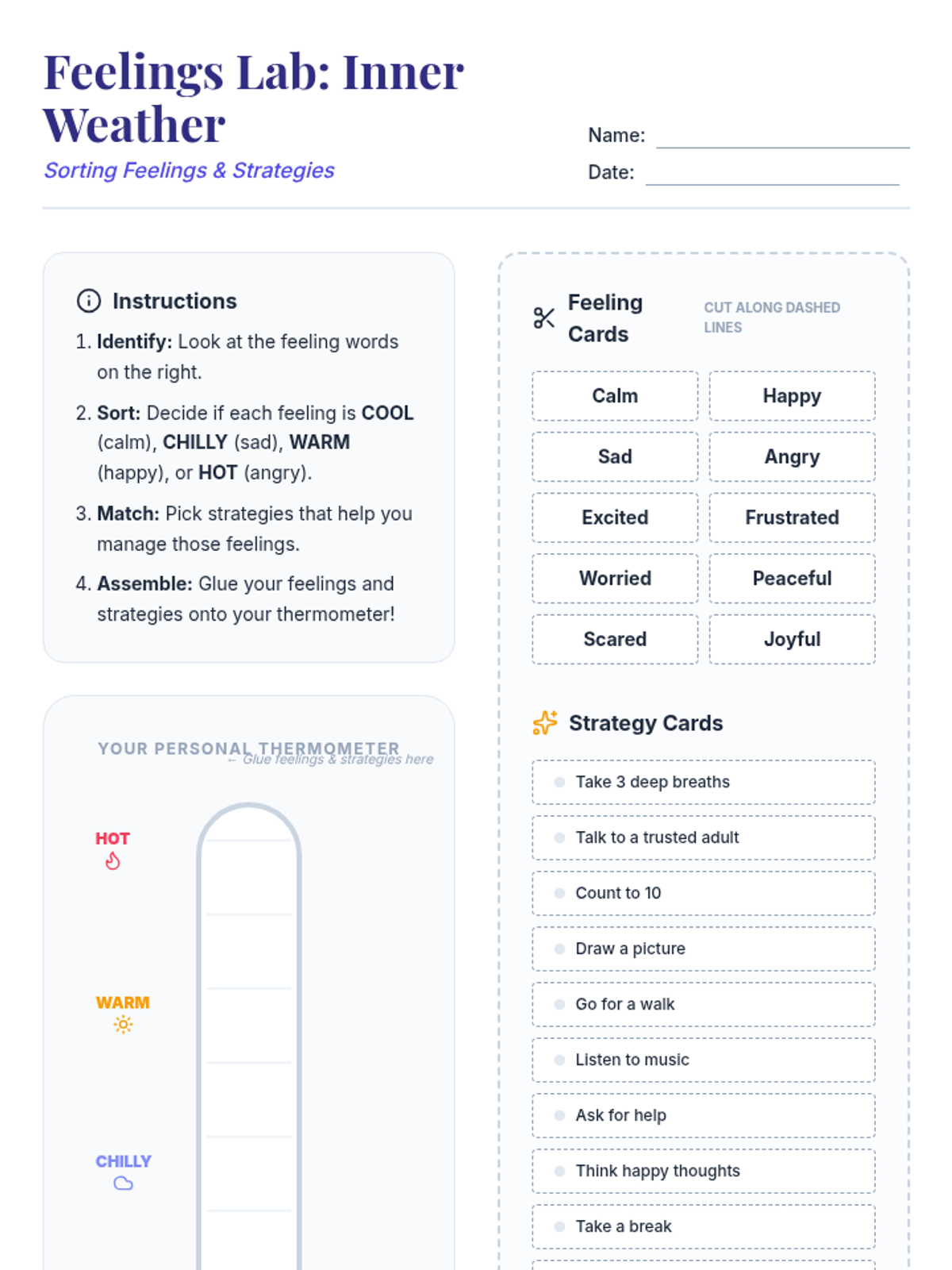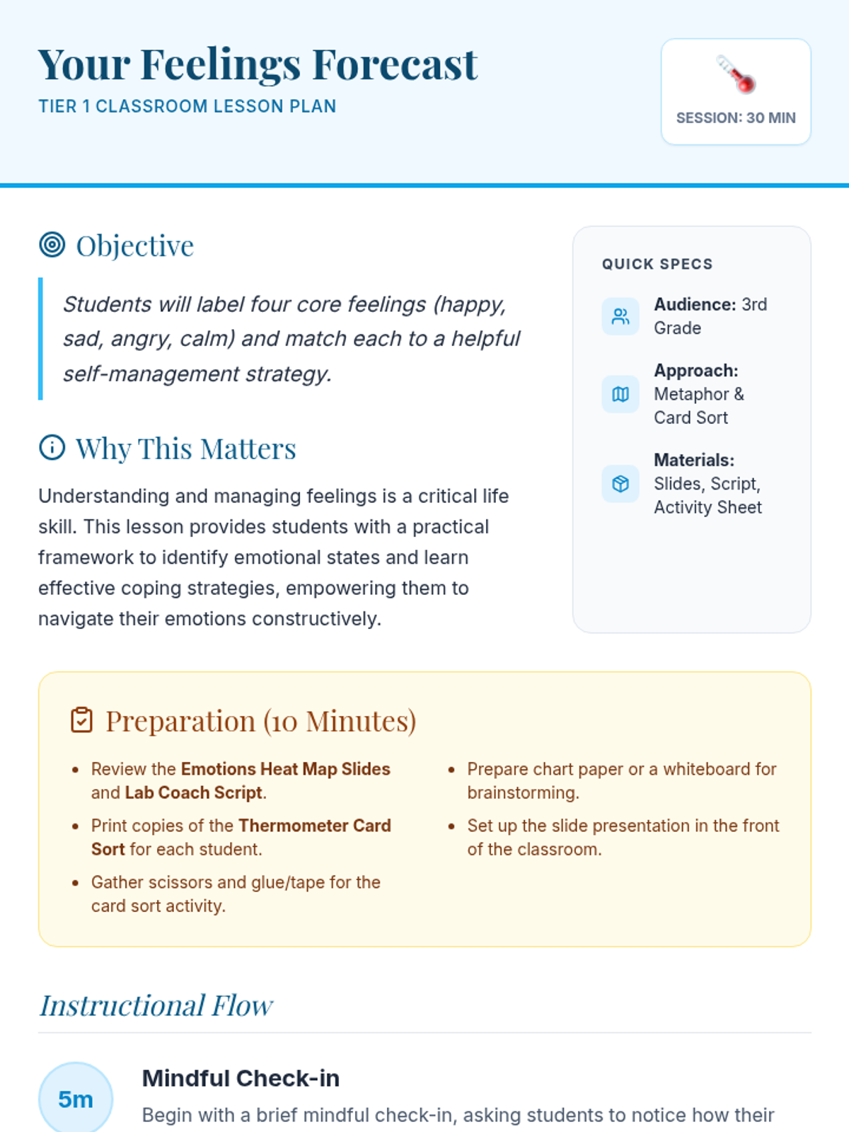 A 30-minute social-emotional learning lesson for 3rd graders that uses a weather and thermometer metaphor to help students identify emotional intensity and match feelings with effective coping strategies.