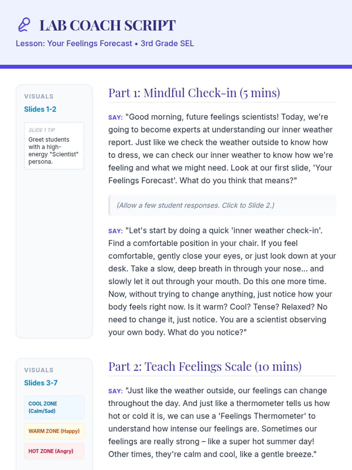 A comprehensive SEL lesson designed to help students identify triggers, name emotions, and apply specific coping strategies (breaks, self-talk, asking for help) through scenario analysis and hands-on practice.