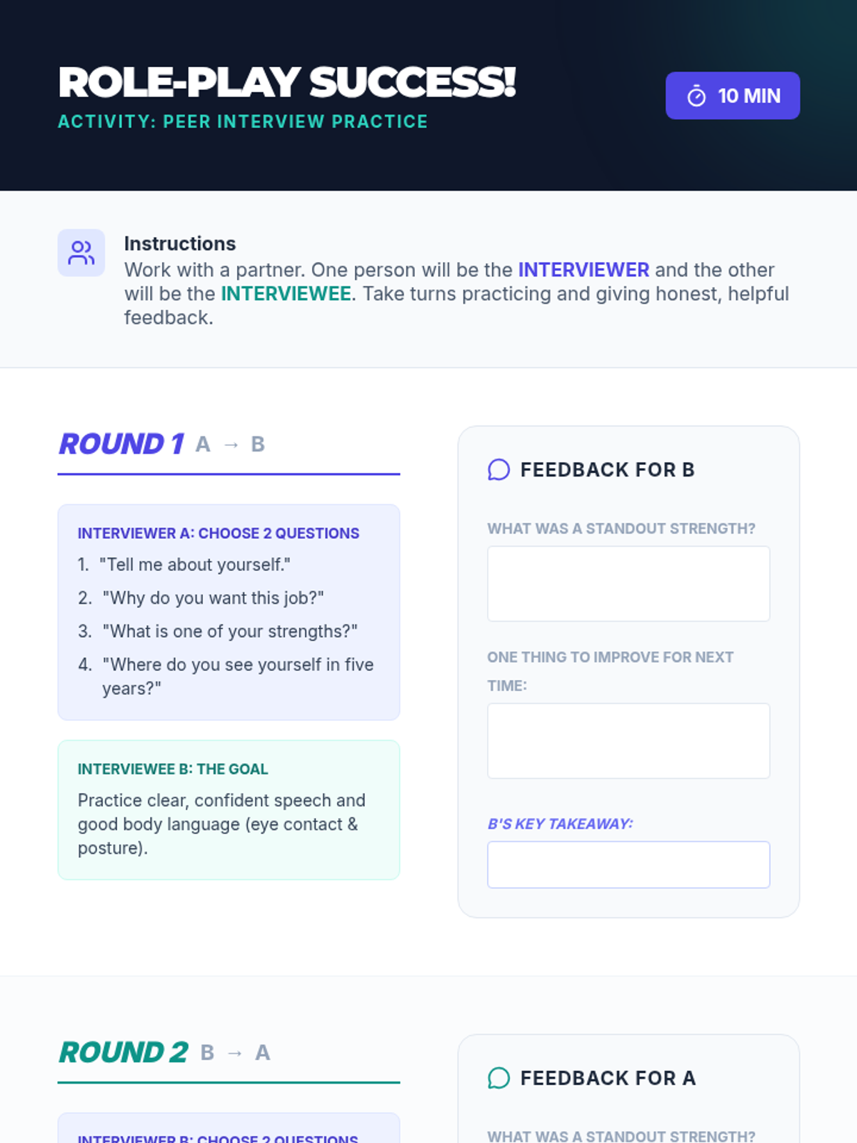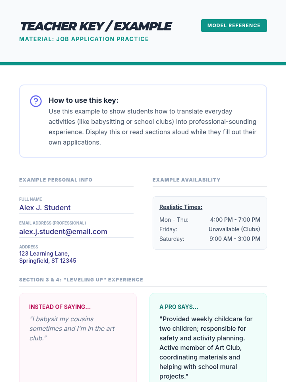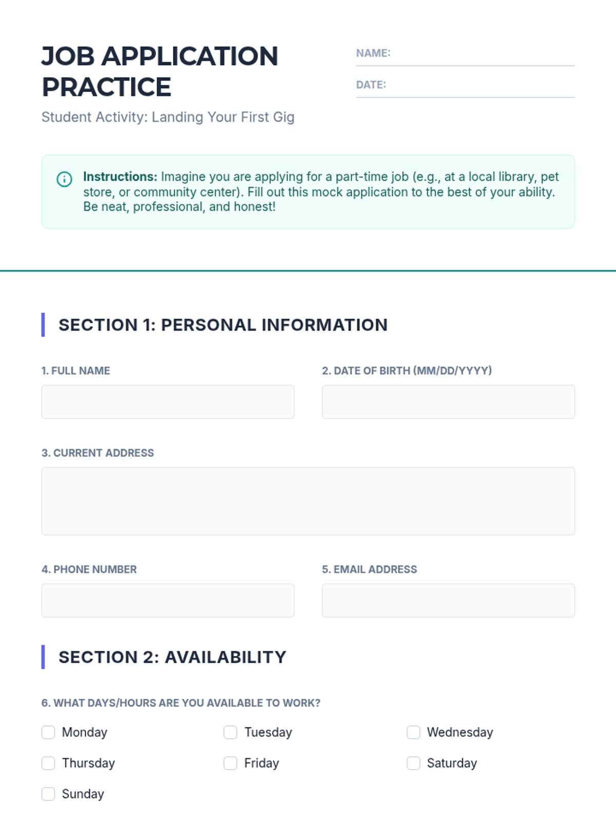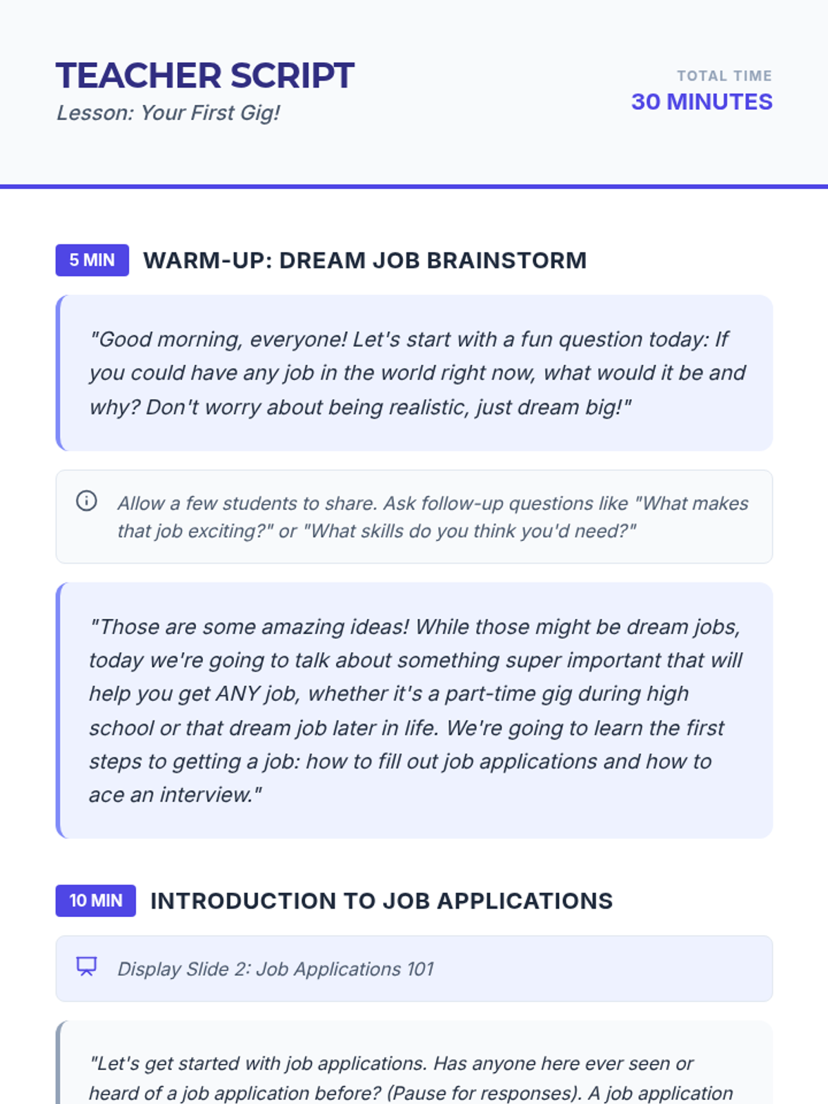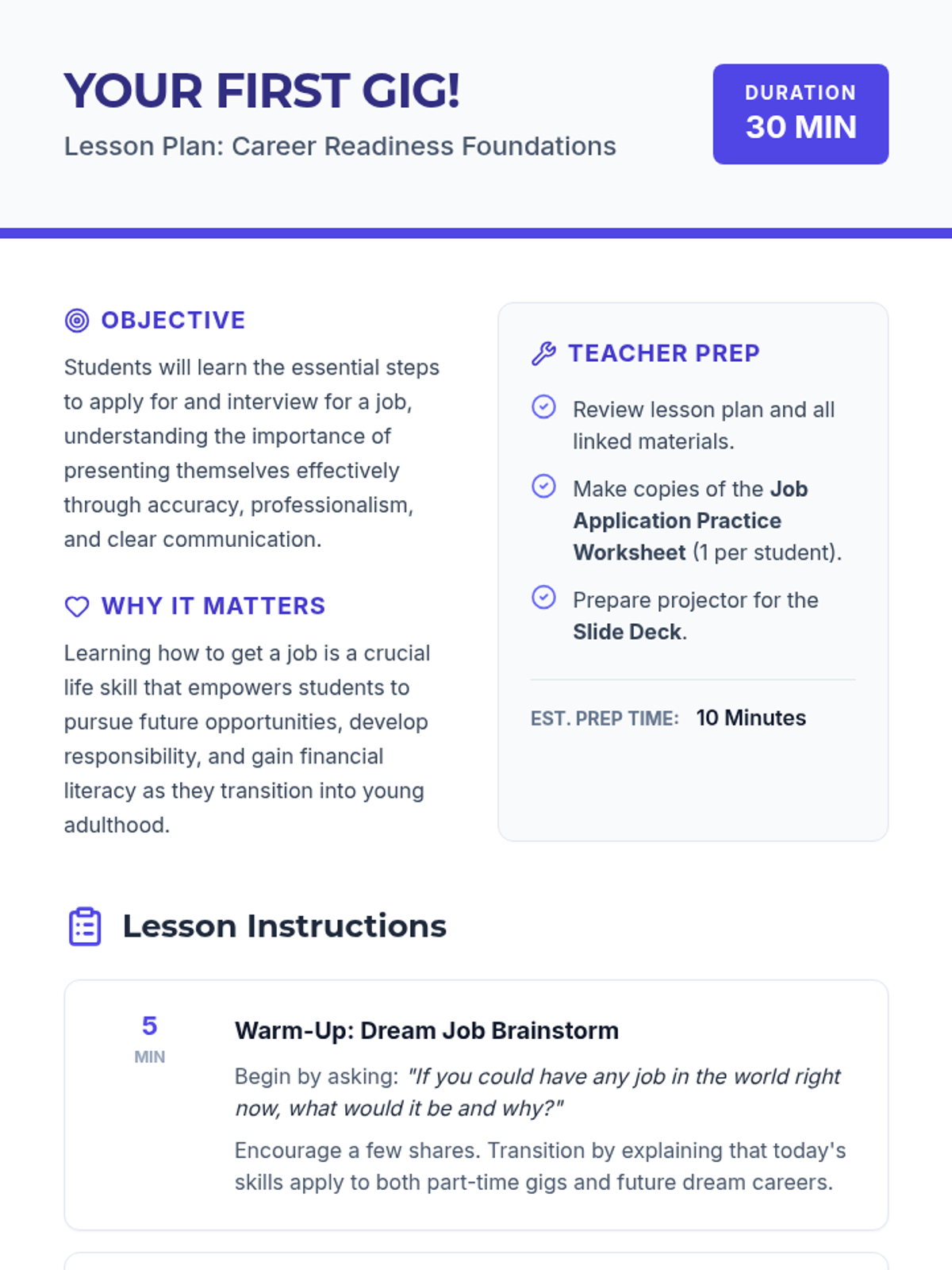 A 30-minute lesson for 8th graders on the essentials of job searching, covering application completion and interview techniques to prepare them for their first part-time jobs.