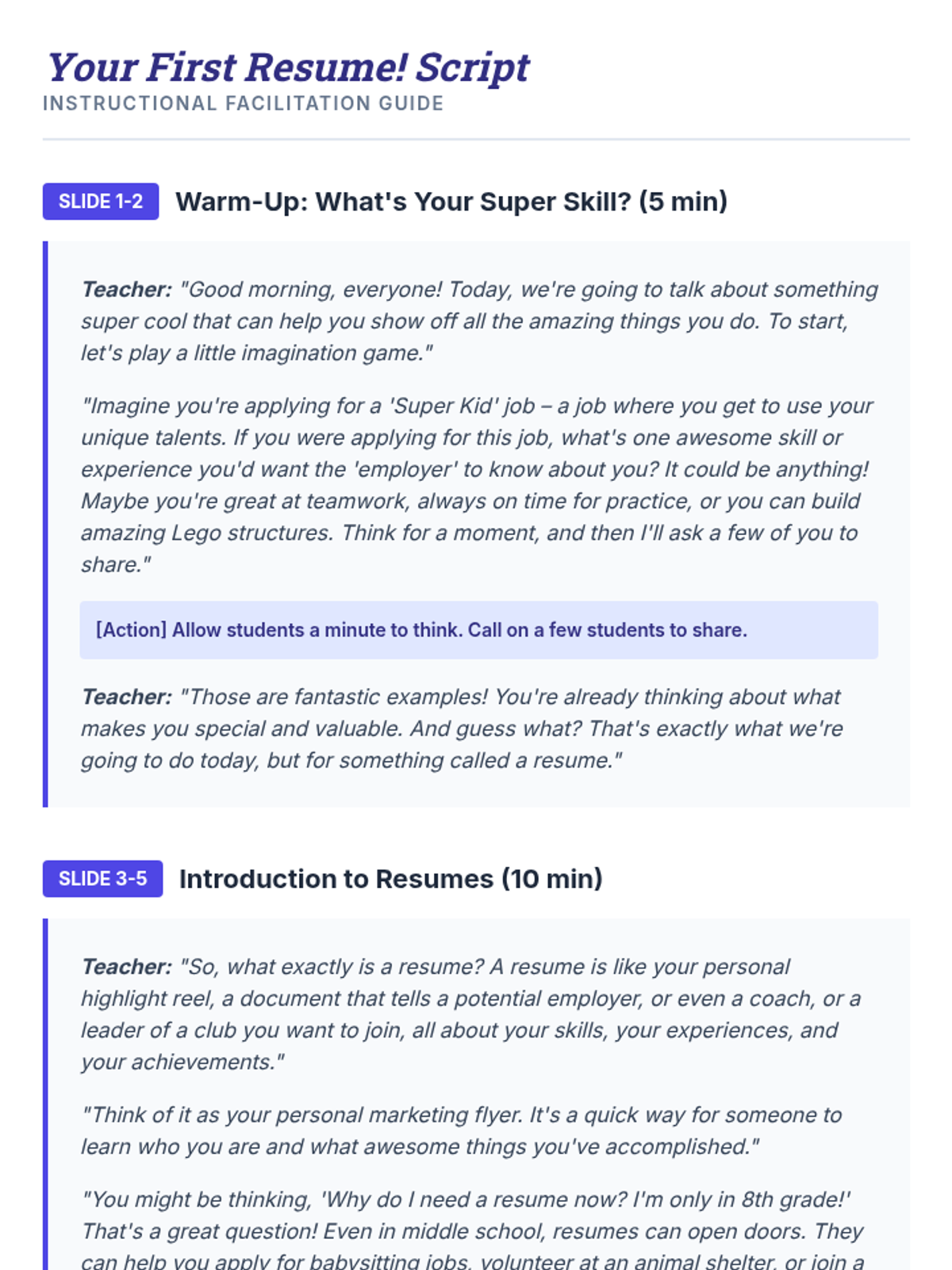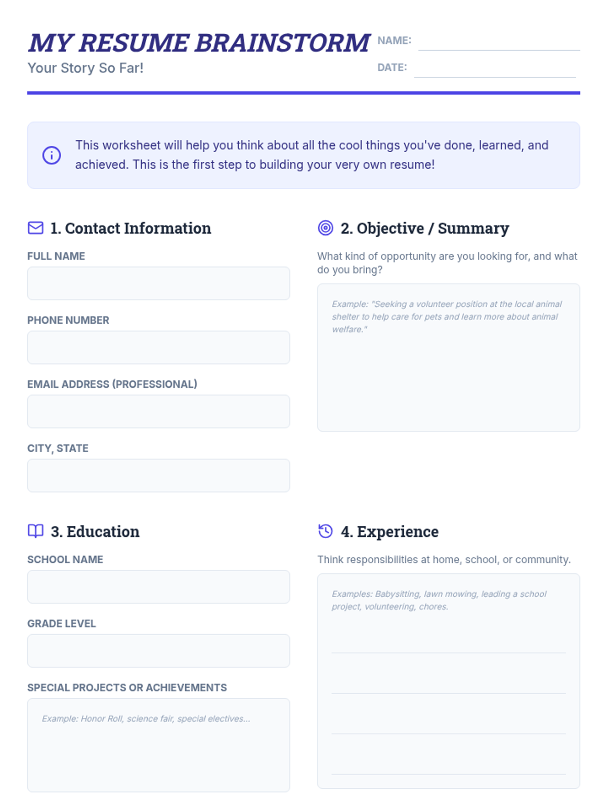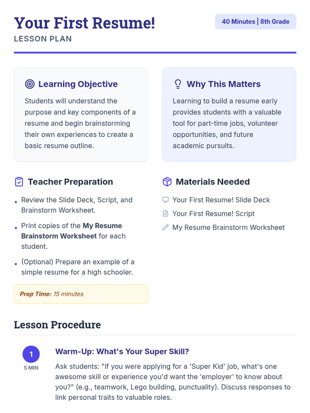 This lesson introduces 8th-grade students to the fundamentals of resume building, helping them identify their skills and experiences for future opportunities.