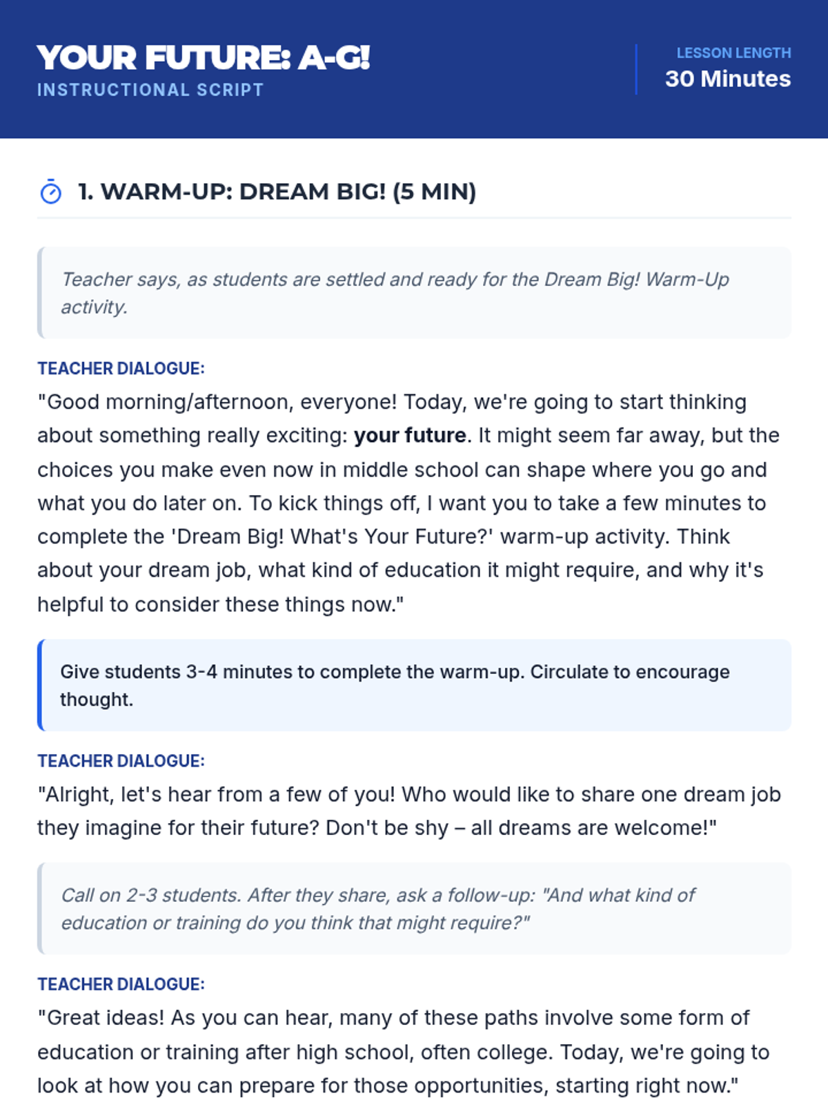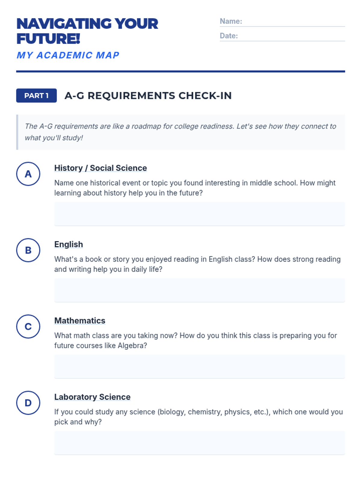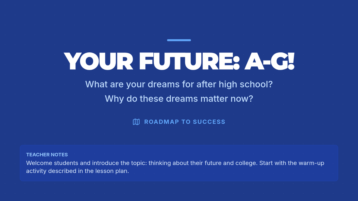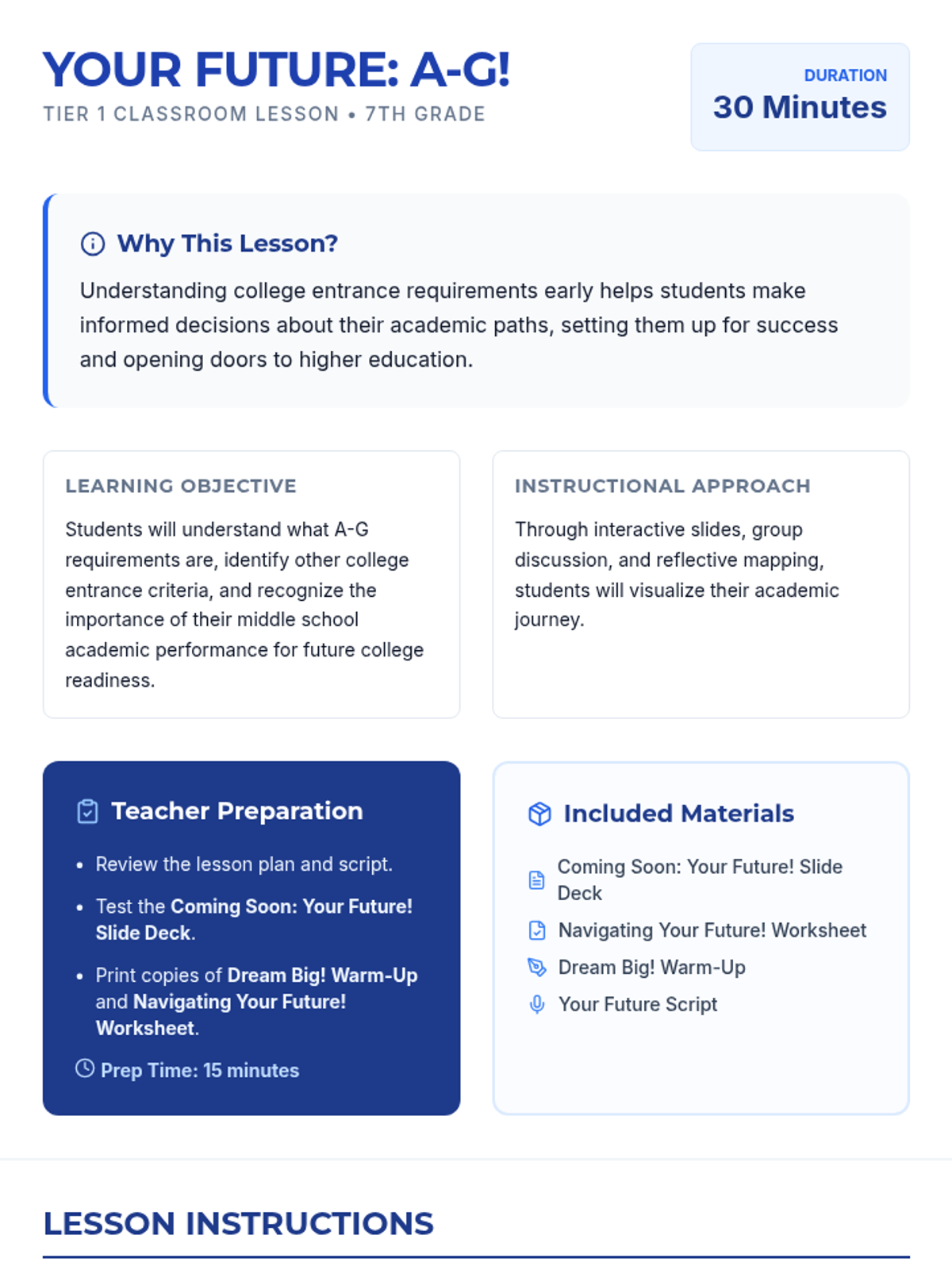 A Tier 1 classroom lesson for 7th graders that introduces A-G requirements and links middle school performance to future college eligibility and success.