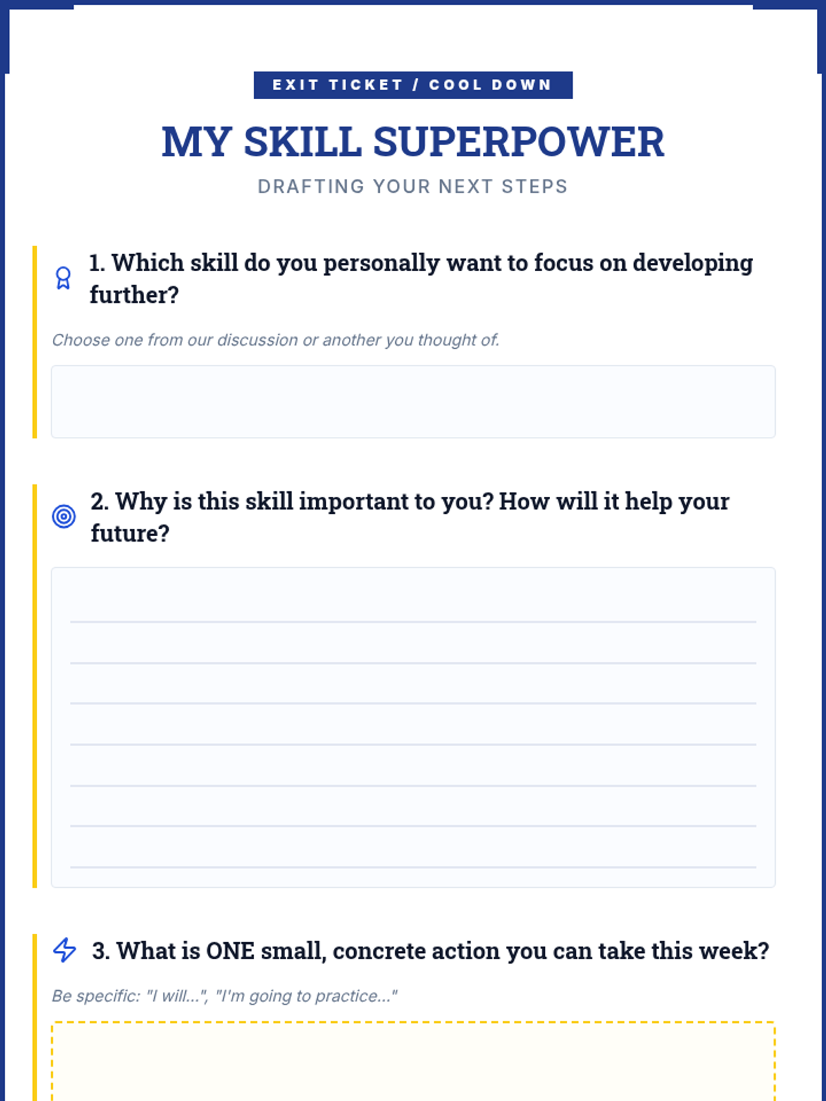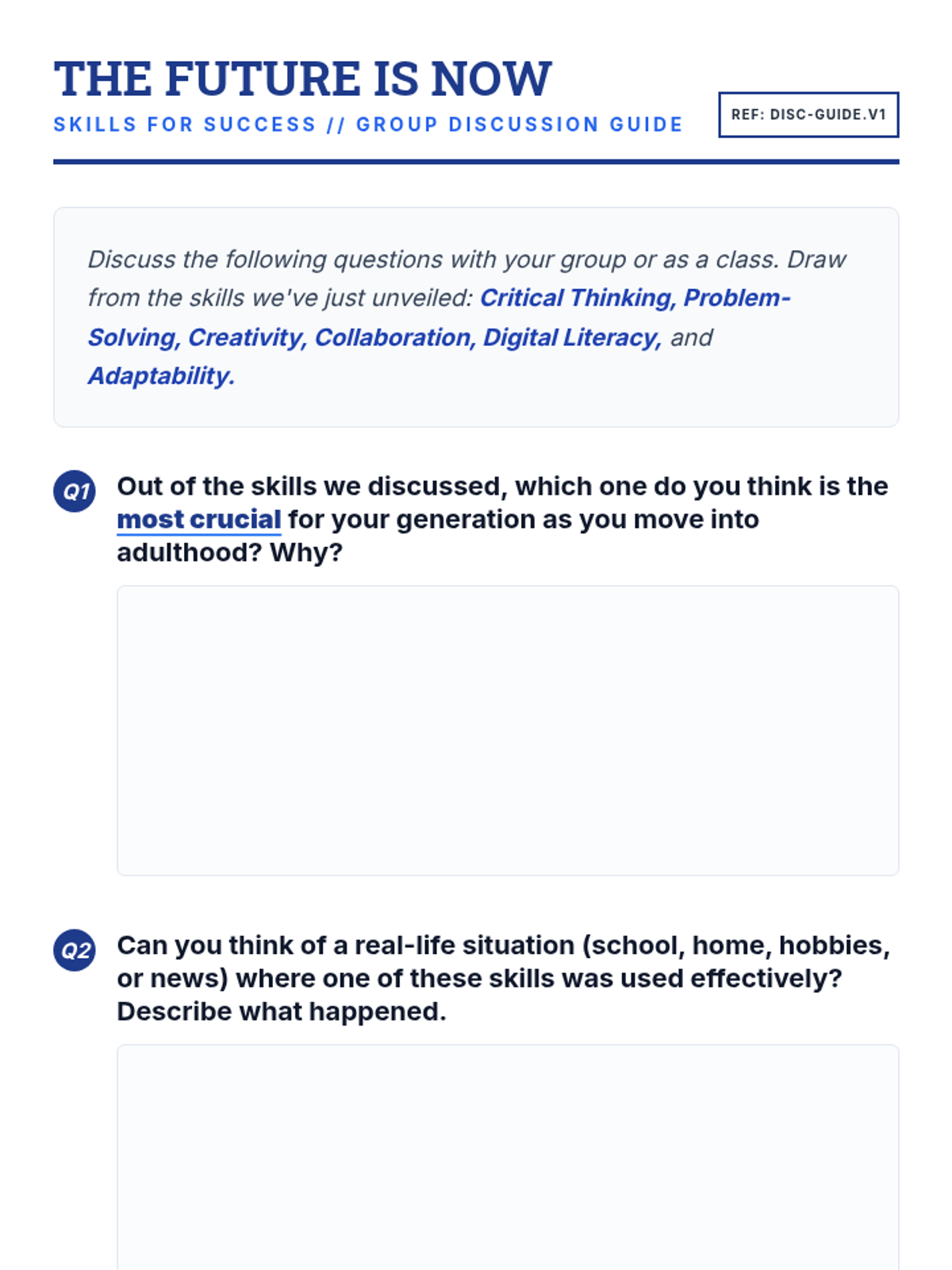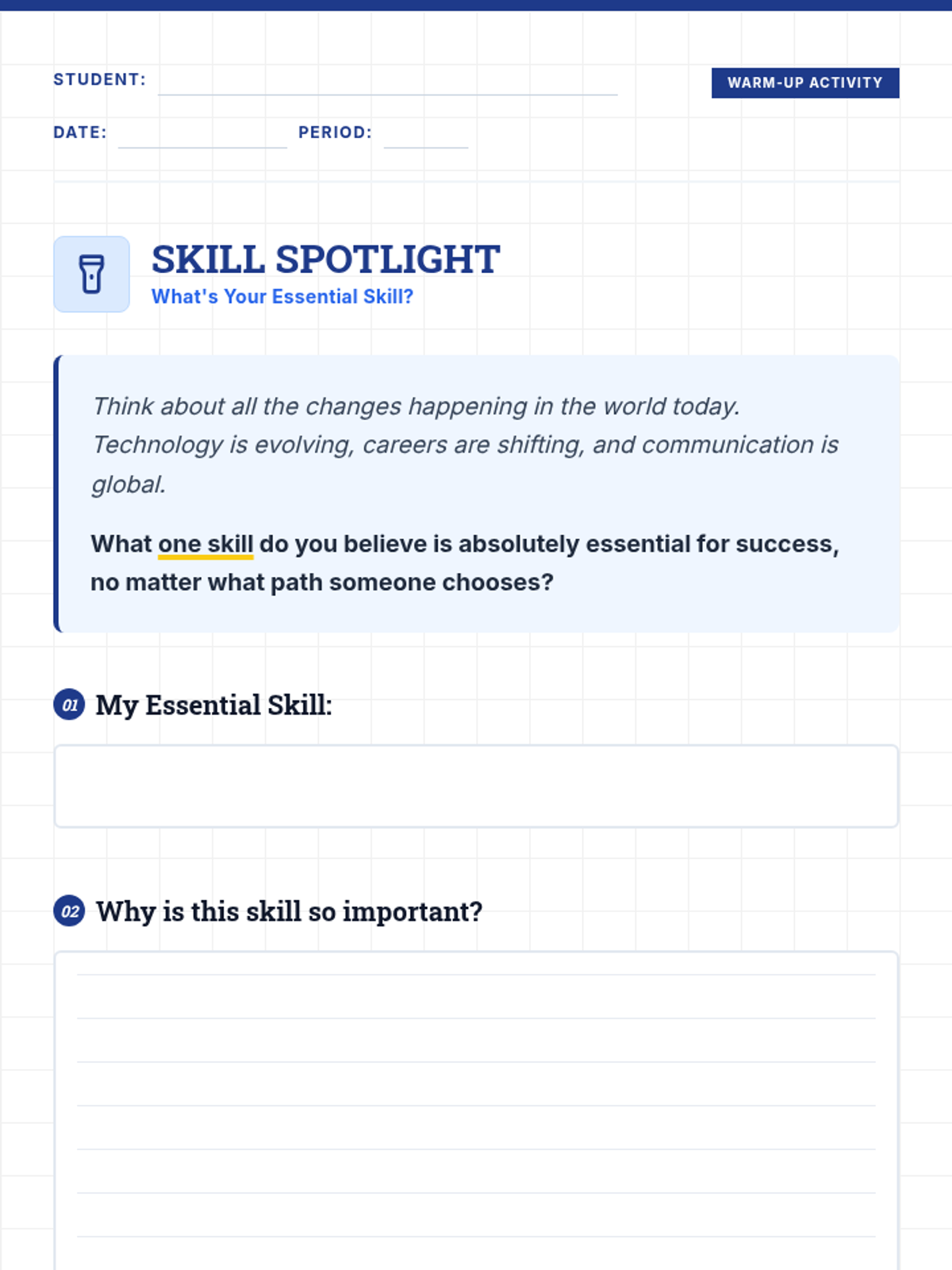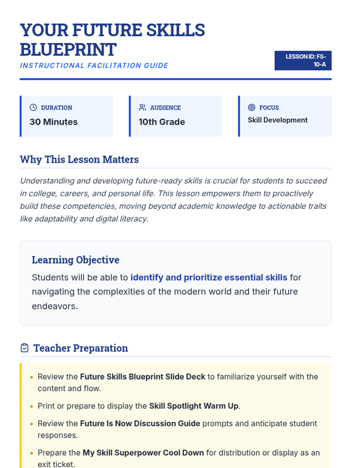 A 30-minute lesson for 10th graders to identify and prioritize essential skills for the modern world, including critical thinking, collaboration, and adaptability.