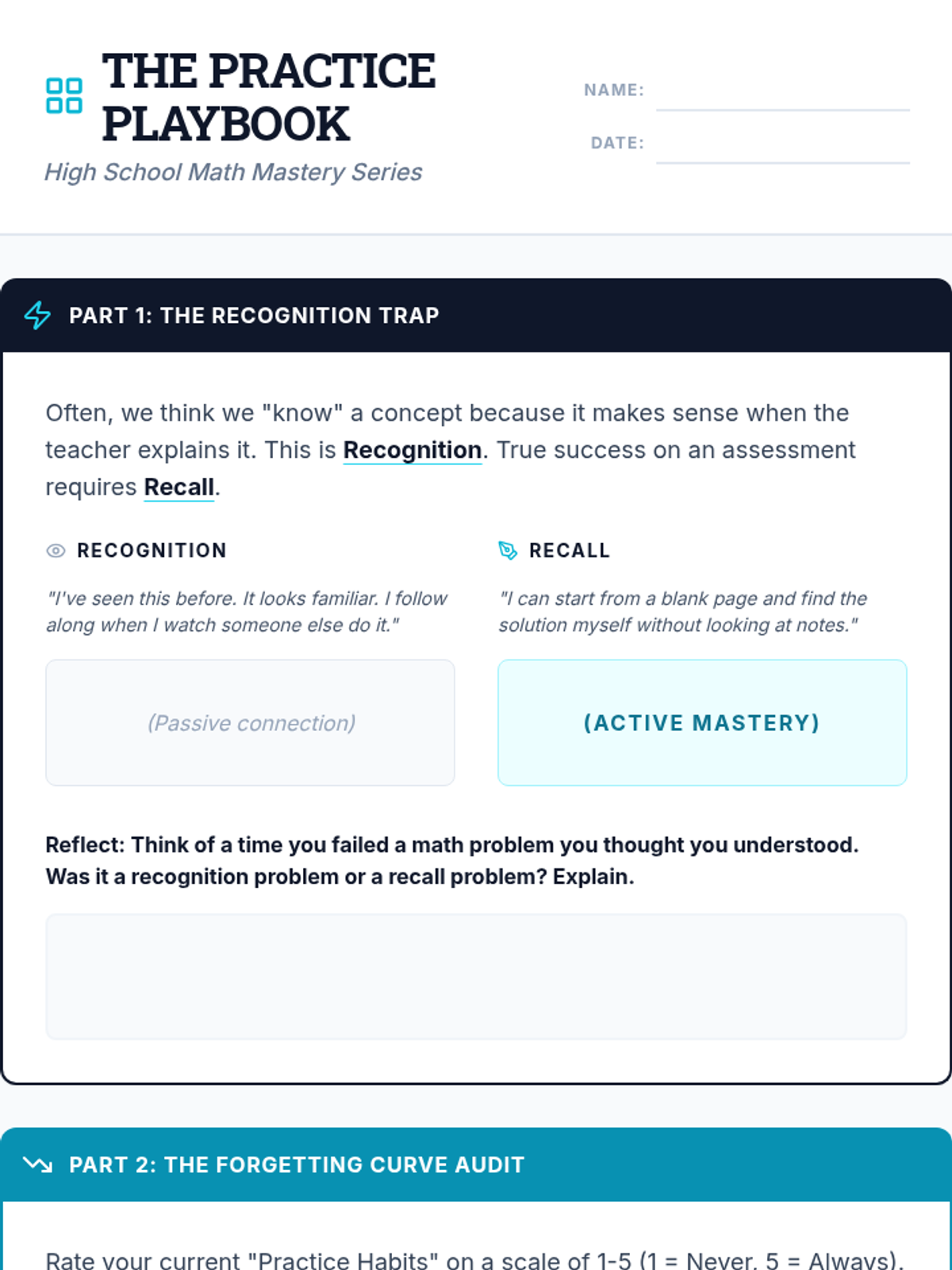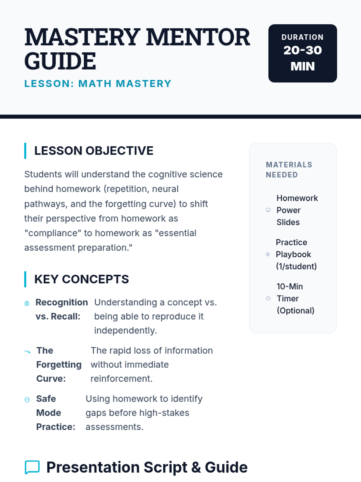 A lesson focused on the value of math homework as essential practice for skill mastery and assessment readiness, tailored for high school students.