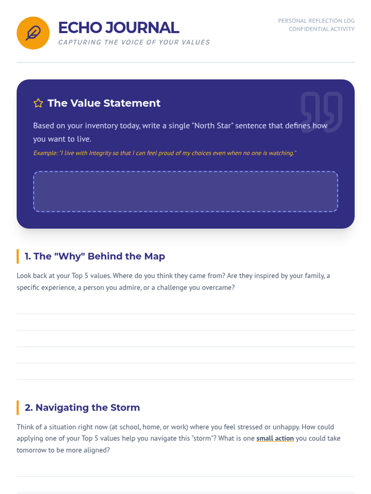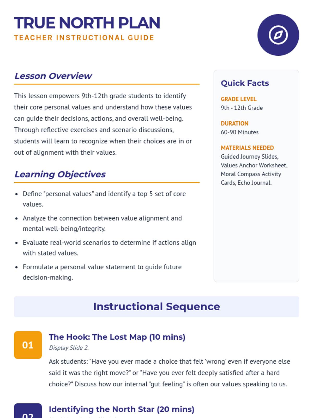 A comprehensive lesson for high schoolers to identify core values and explore how alignment between actions and beliefs leads to personal growth and reduced internal conflict. Students will navigate real-world scenarios and reflect on their personal "True North."