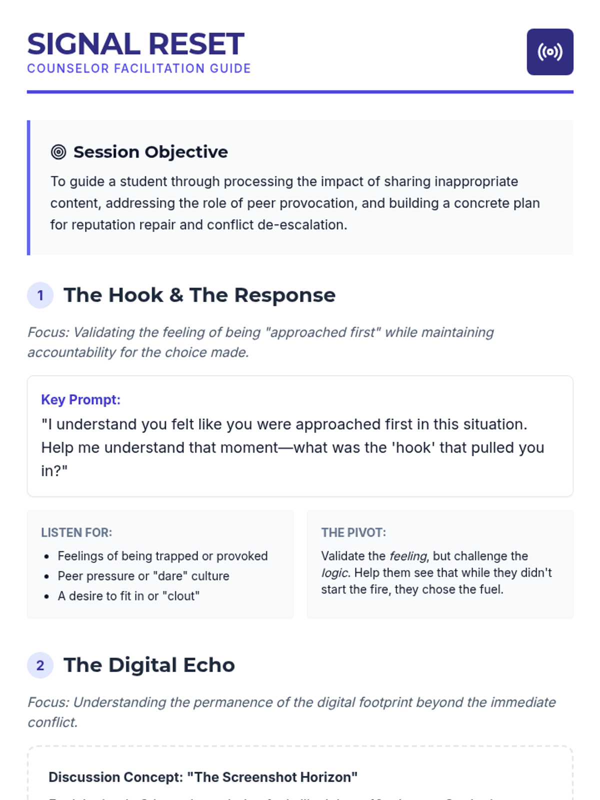 A counseling-focused lesson designed for a 9th-grade student to address the consequences of spreading inappropriate images, managing negative social influences, and developing strategies for reputation repair and conflict diffusion.