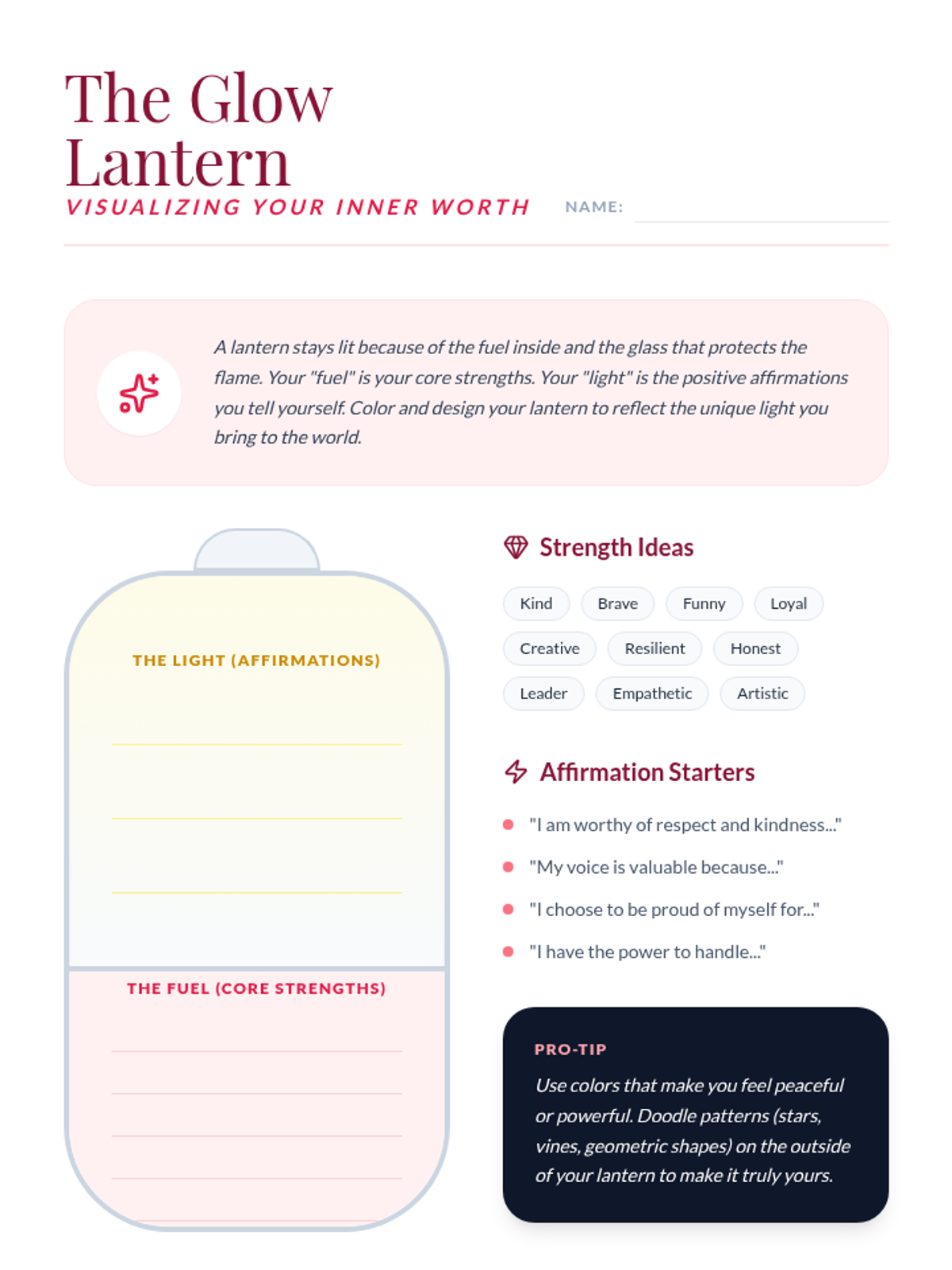 Exploring self-identity and boosting self-esteem through positive affirmation practices and identifying personal strengths.
