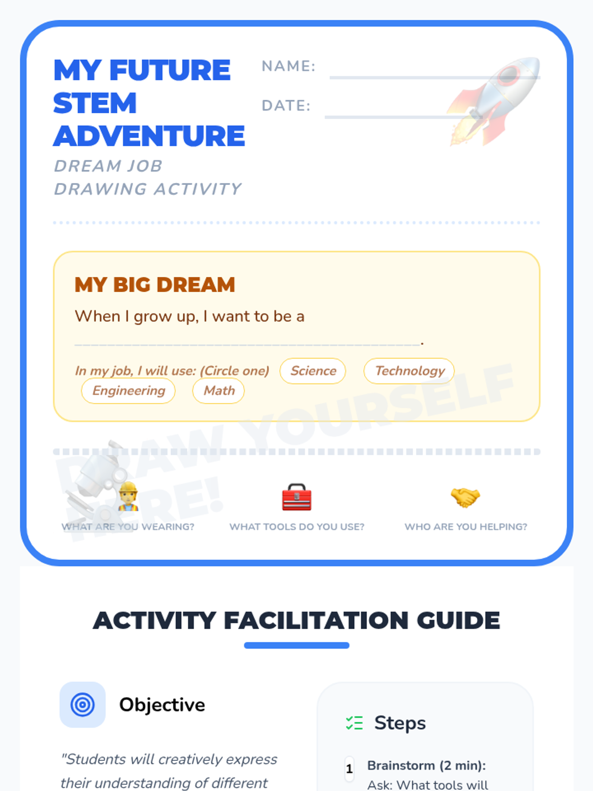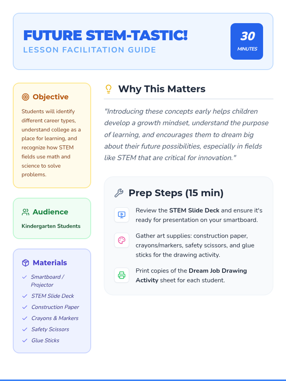 A 30-minute introductory lesson for Kindergarten students to explore STEM careers, college, and various jobs through interactive discussion and a drawing activity.