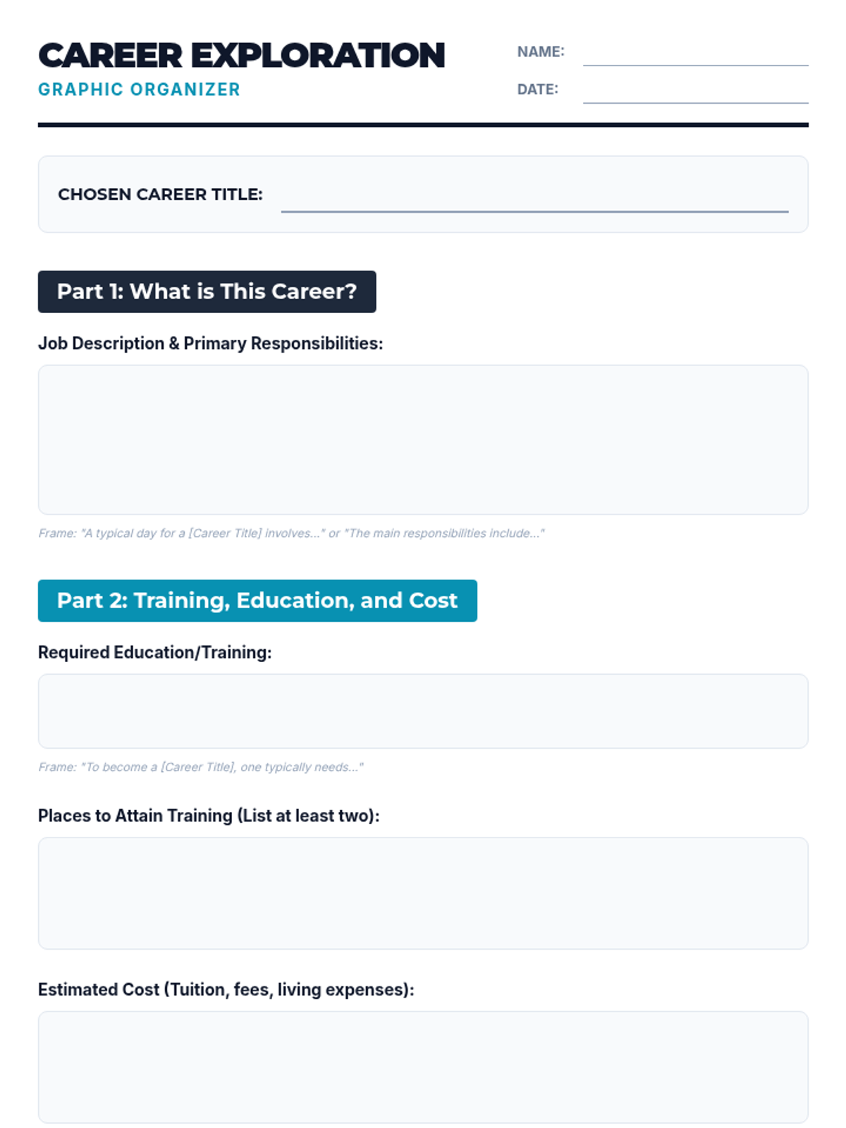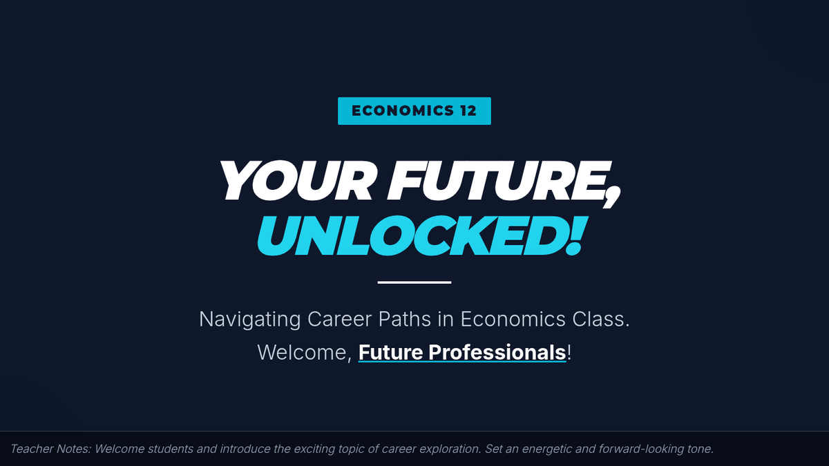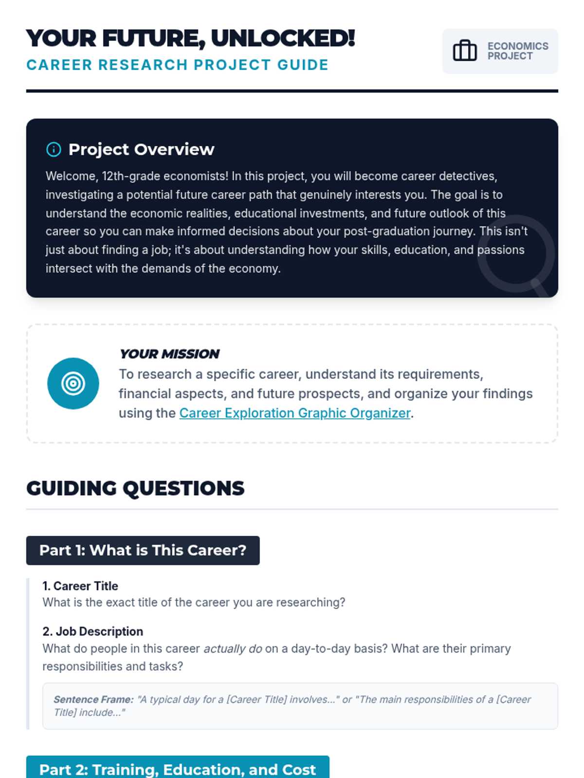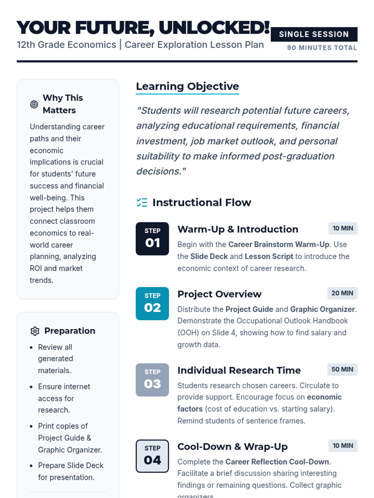 This lesson empowers 12th-grade economics students to research potential future careers, understanding the economic landscape, educational requirements, and job market outlook. Students will gain practical skills in career exploration and financial literacy, essential for post-graduation planning.