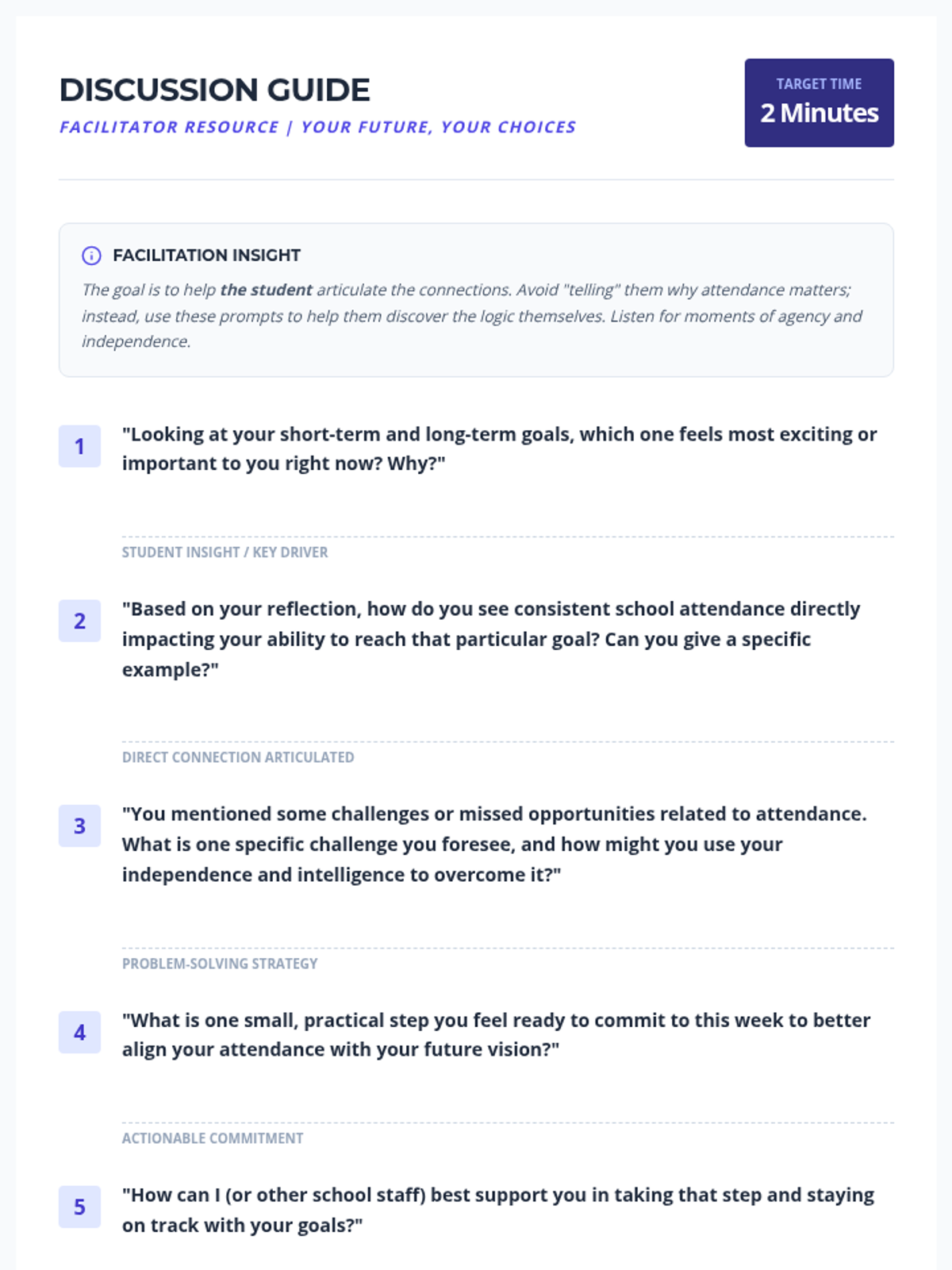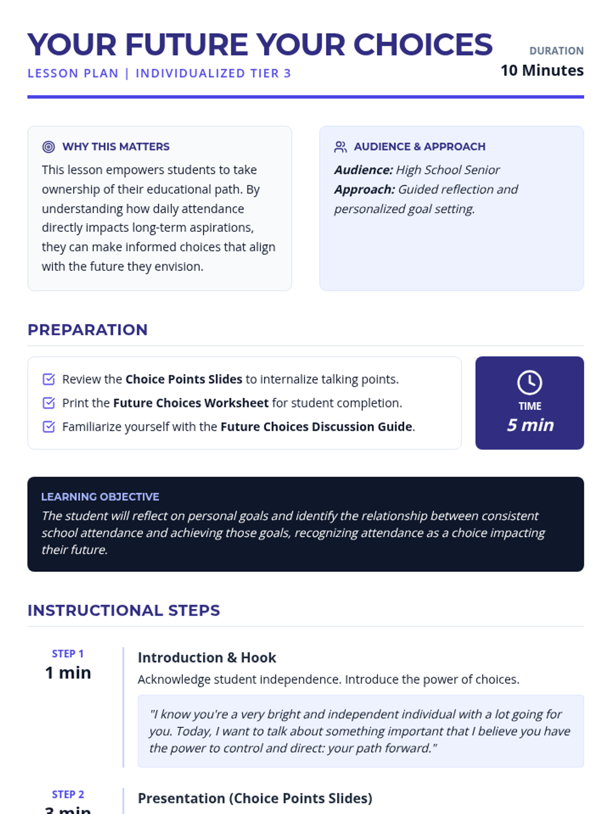 A 10-minute individualized Tier 3 lesson for high school seniors to connect consistent attendance with their future aspirations and long-term dreams.