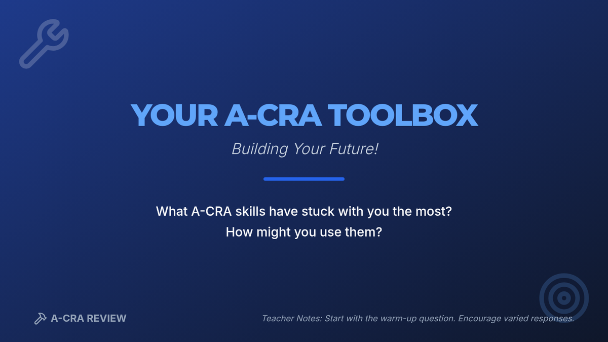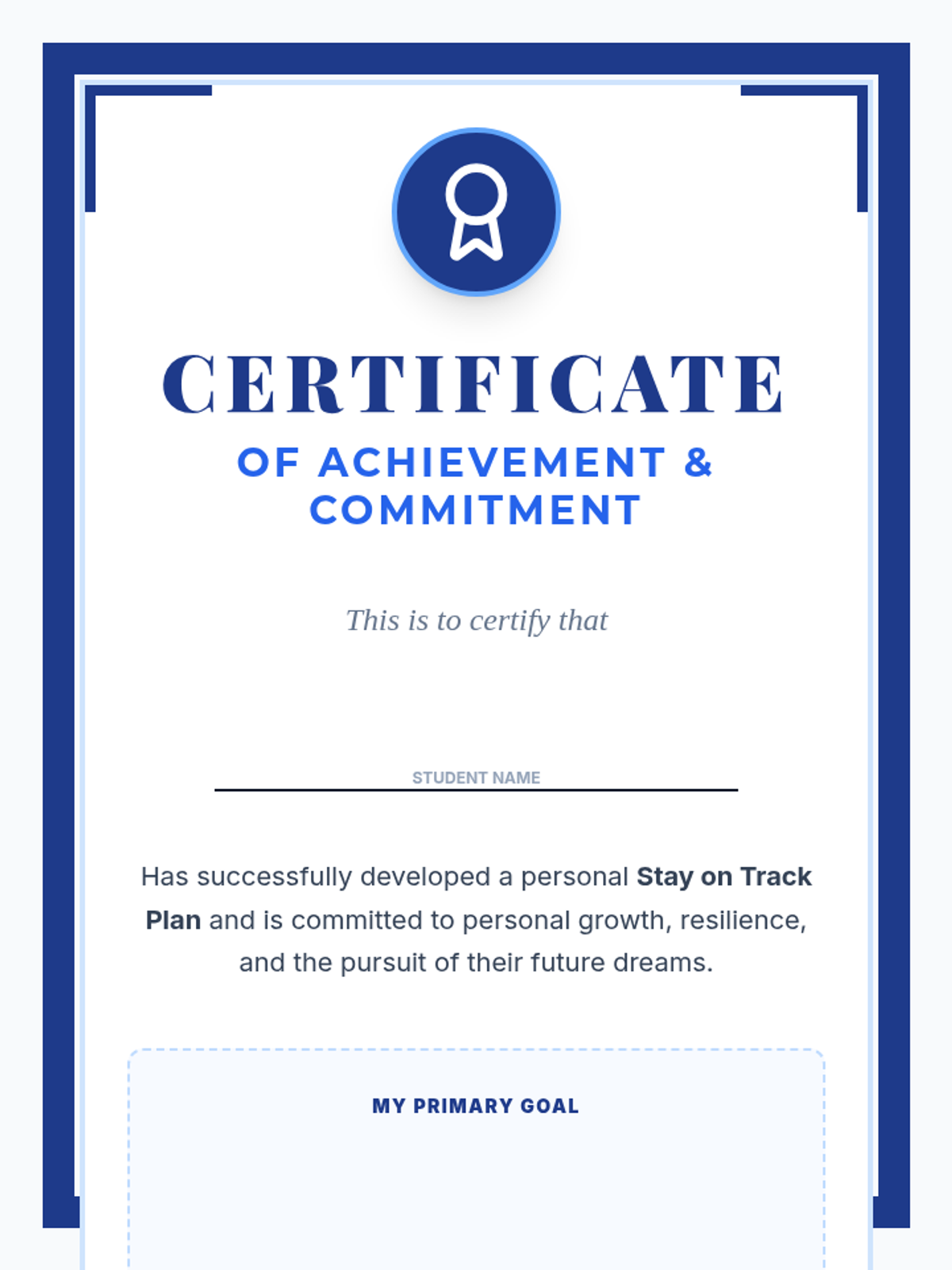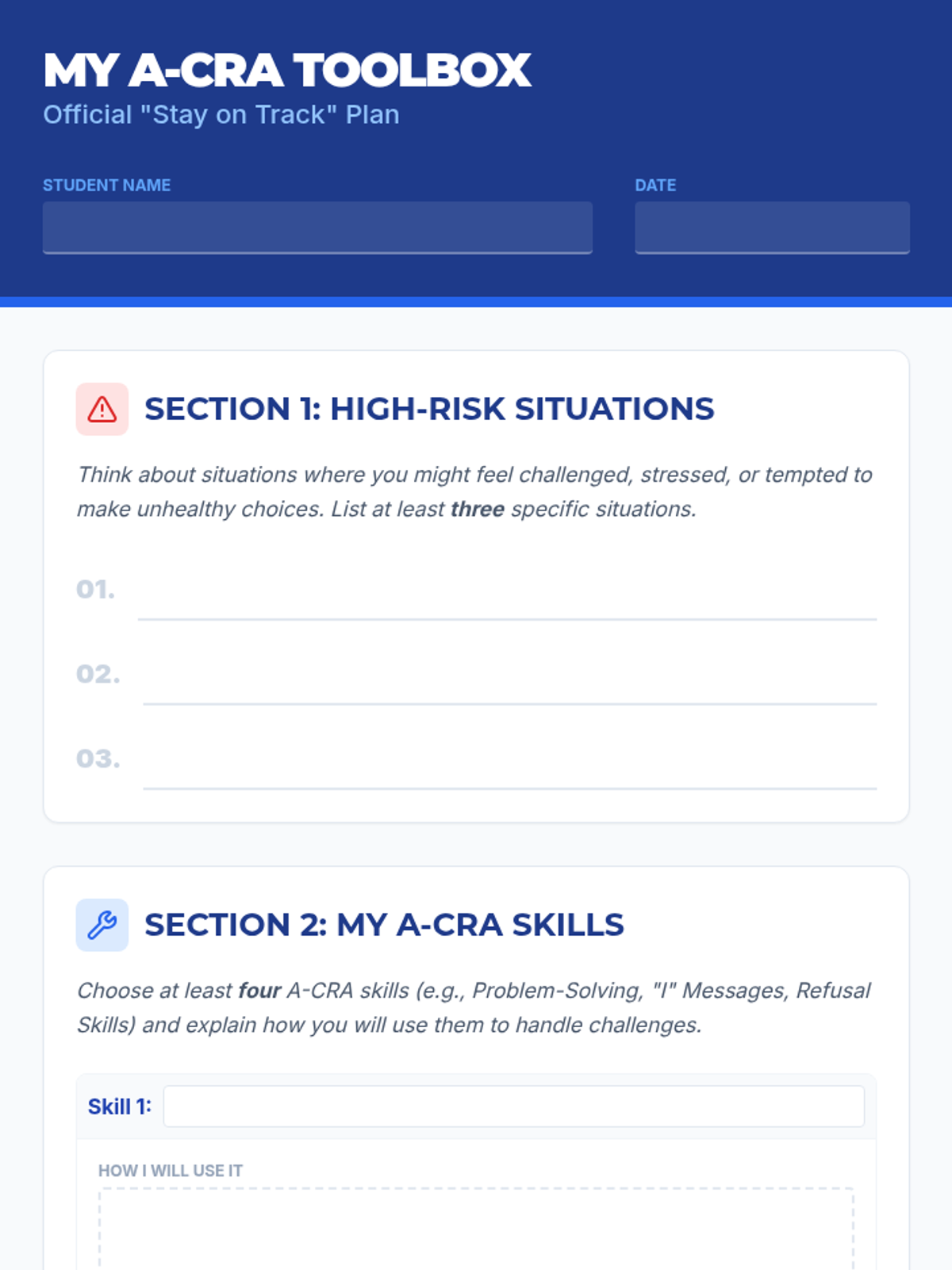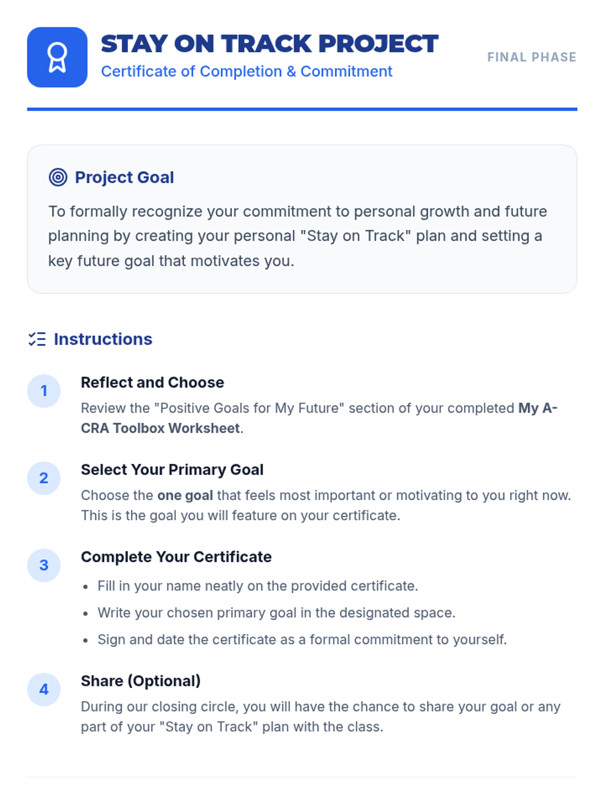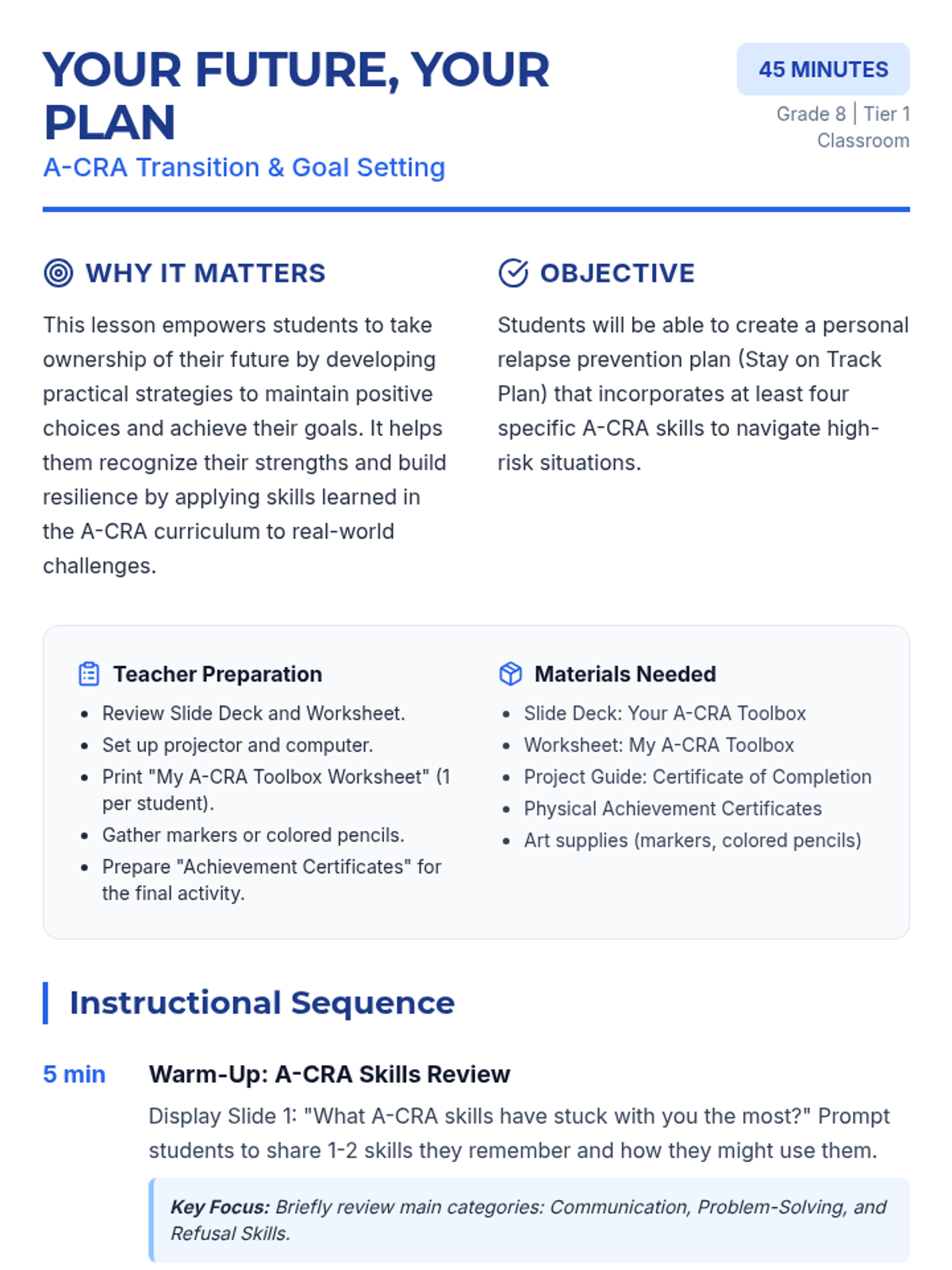 A 45-minute lesson for 8th-grade students to create a personal 'Stay on Track' plan using A-CRA skills, focusing on relapse prevention and goal setting.