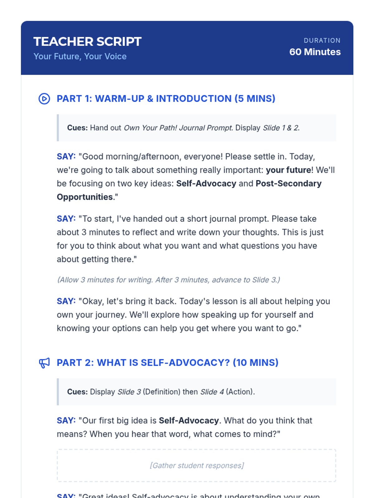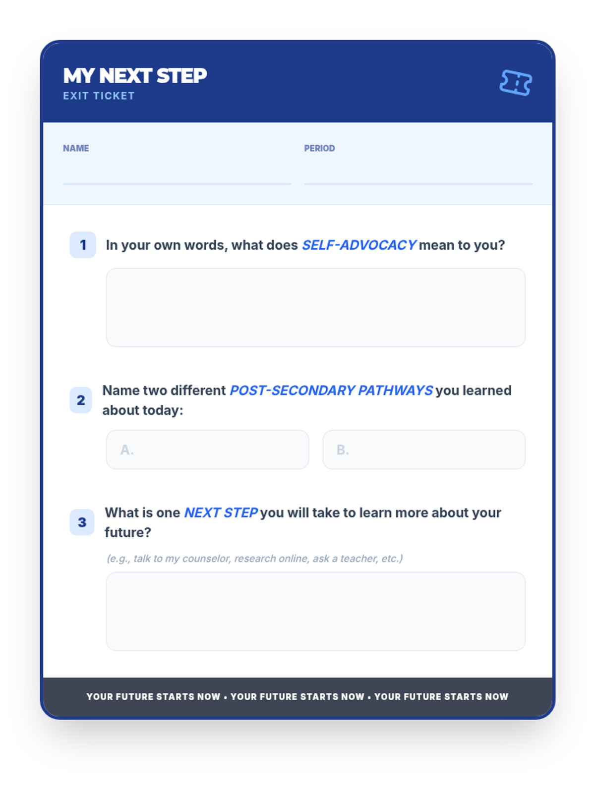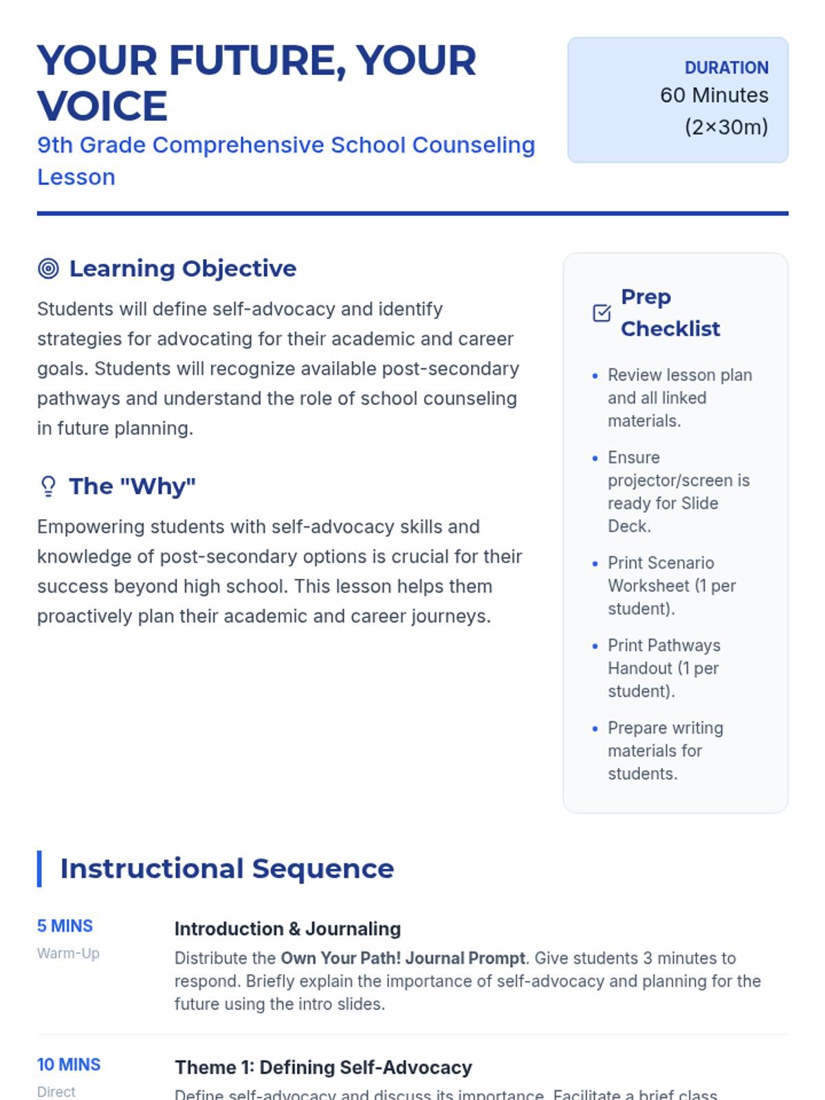 A comprehensive lesson for 9th graders focusing on self-advocacy skills and exploring post-secondary pathways like college, trades, and military service.