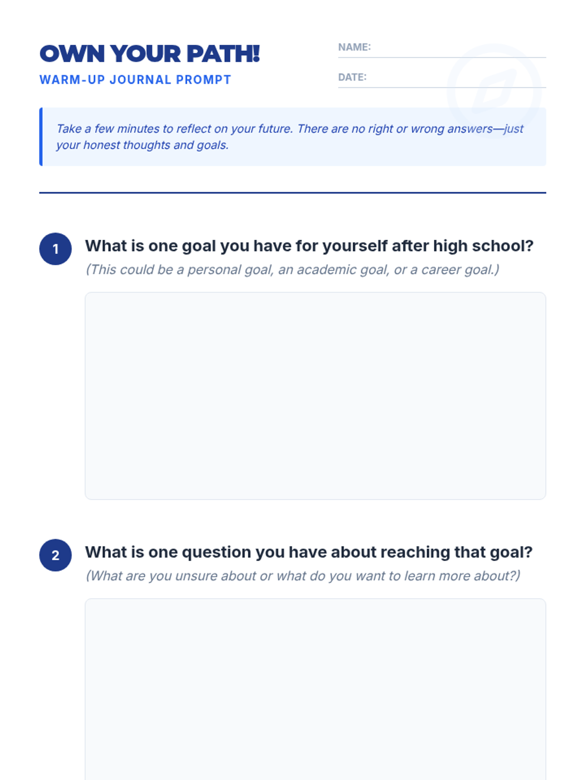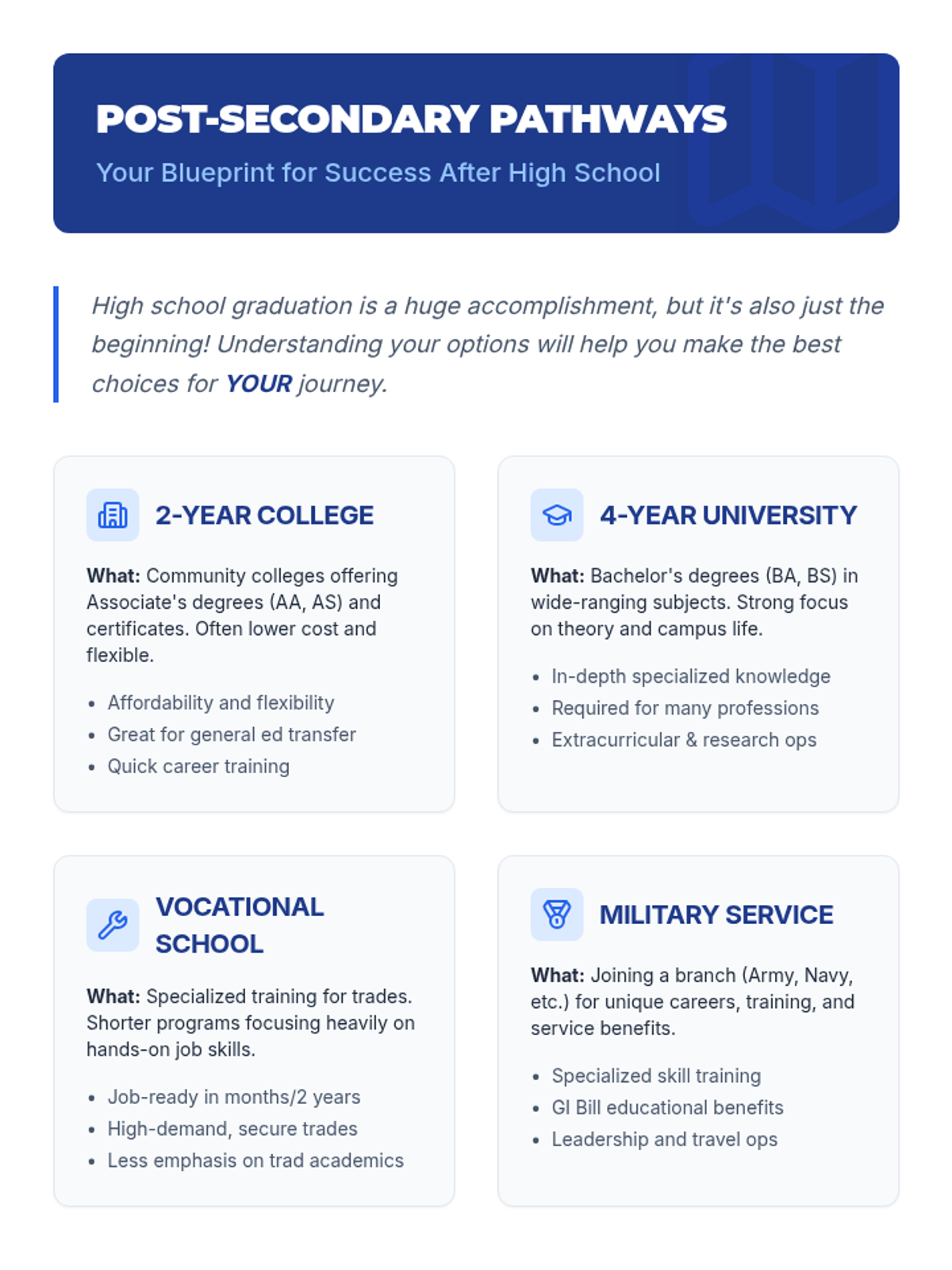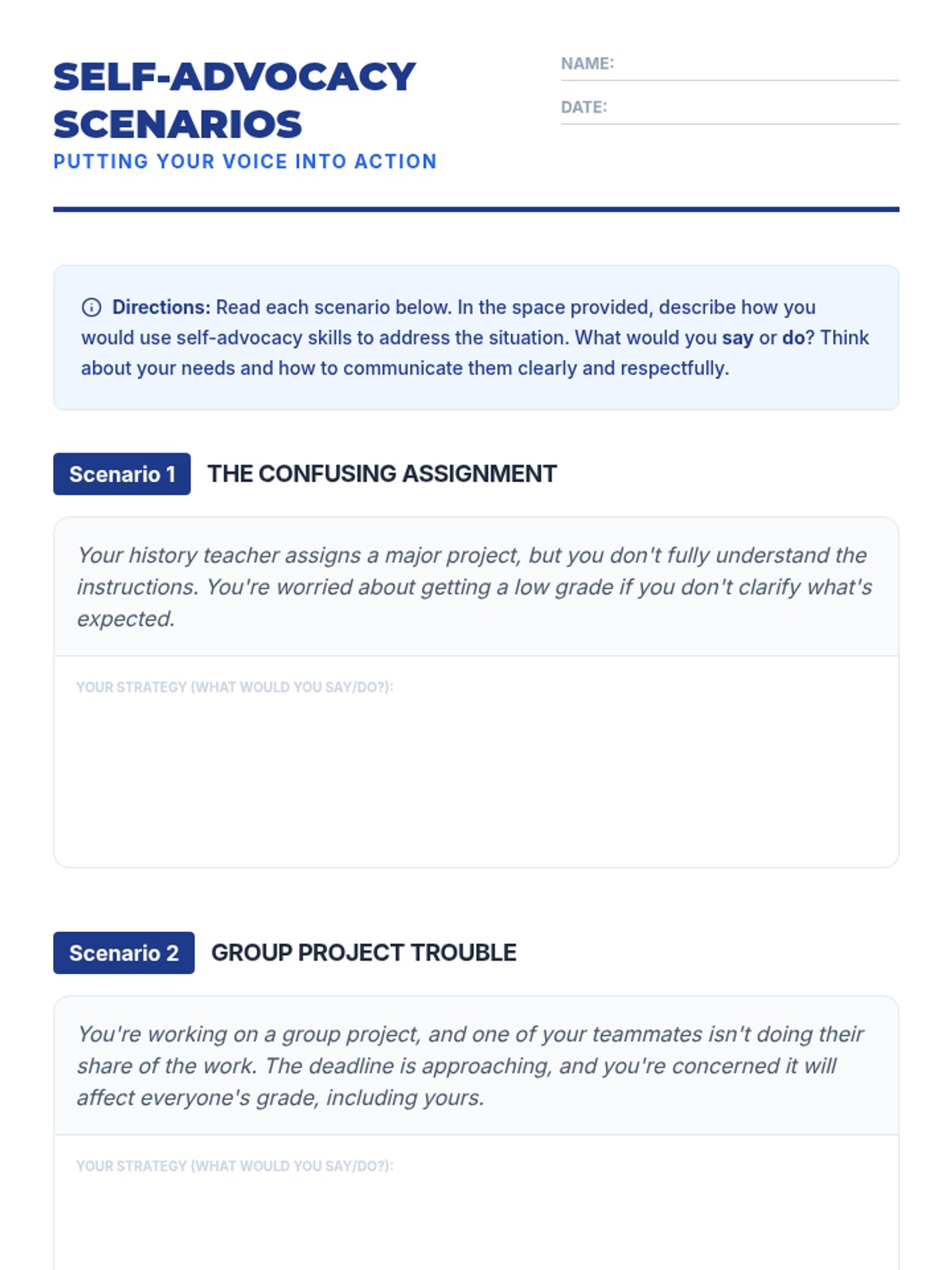 A comprehensive lesson for 9th graders focusing on self-advocacy skills and exploring post-secondary pathways like college, trades, and military service.