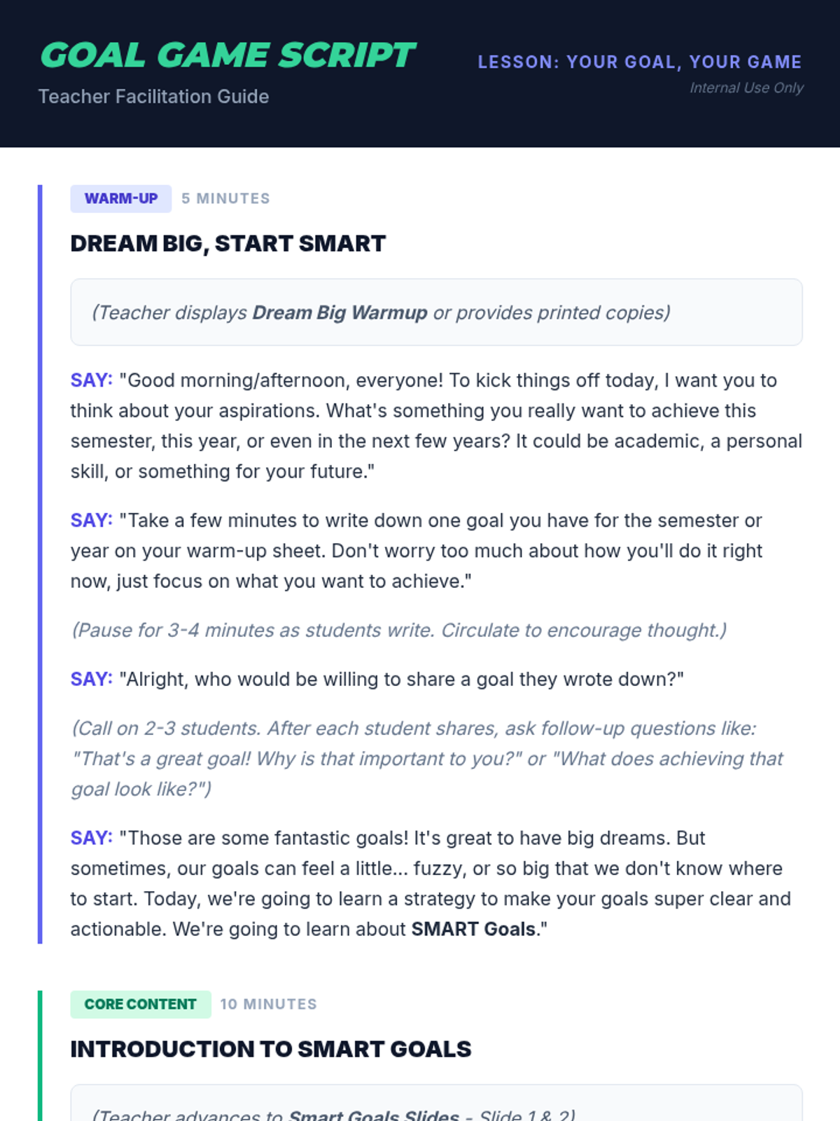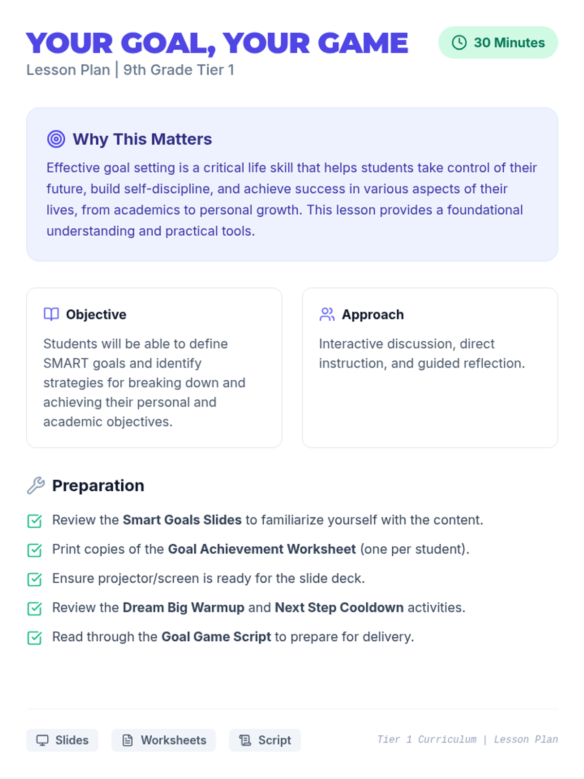 This lesson empowers 9th-grade students to set effective, achievable goals and provides practical strategies for completing them through a gamified SMART framework.