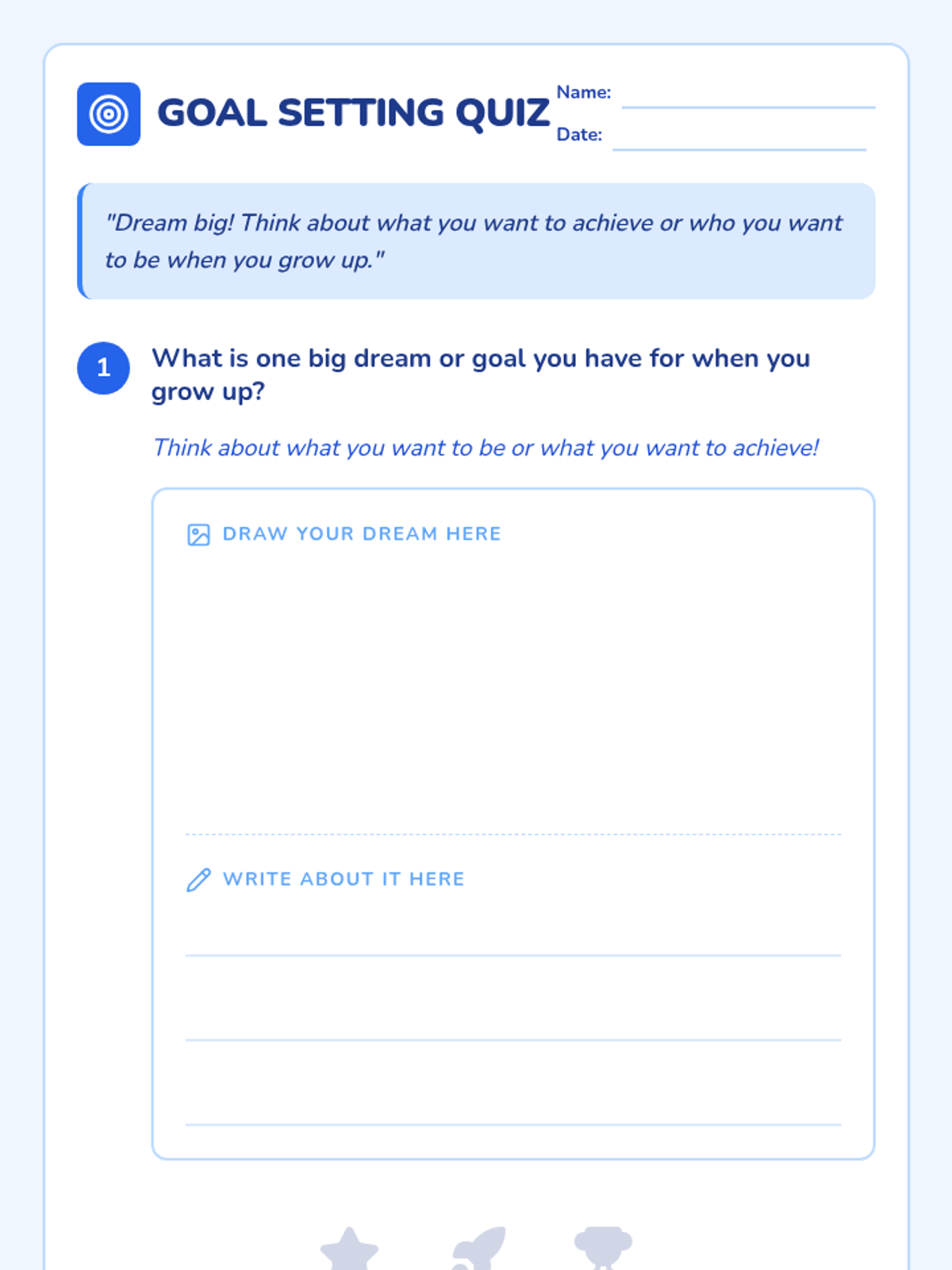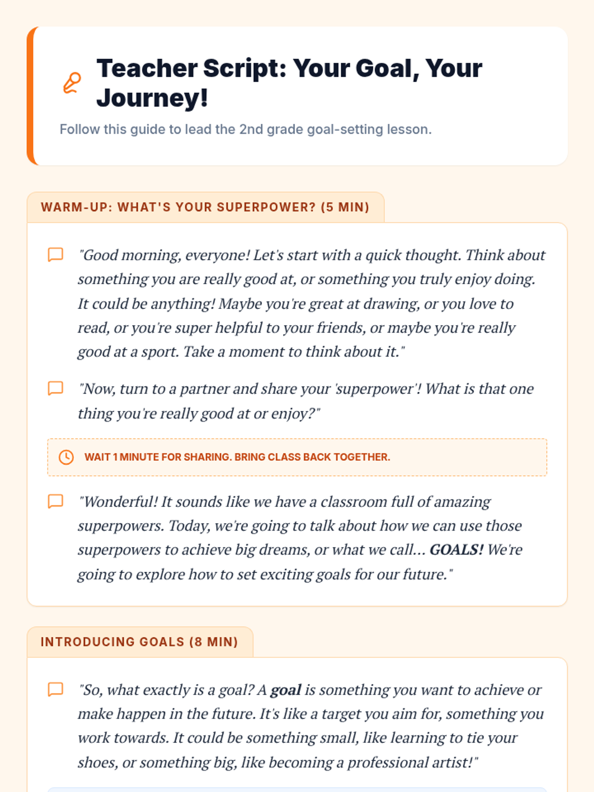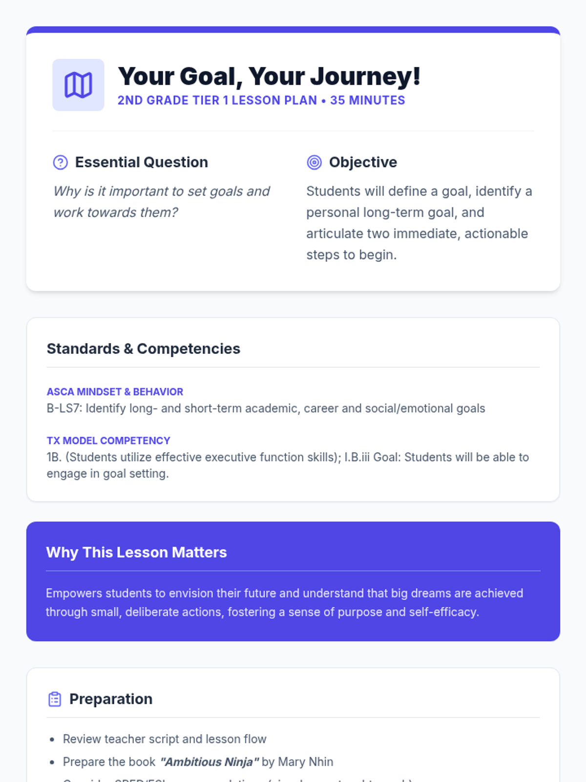 A 35-minute Tier 1 lesson for 2nd graders focused on defining goals, identifying long-term career aspirations, and breaking them down into immediate actionable steps. includes a read-aloud of 'Ambitious Ninja' and self-reflection on work habits.