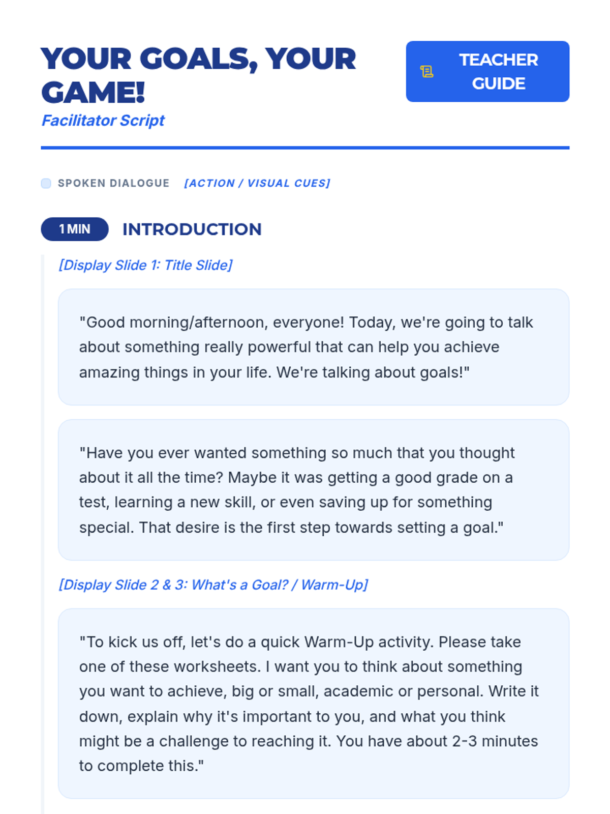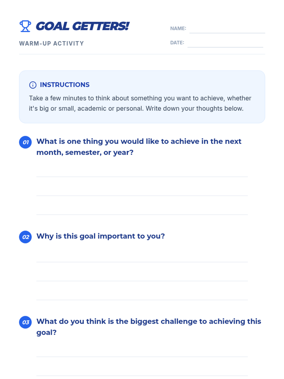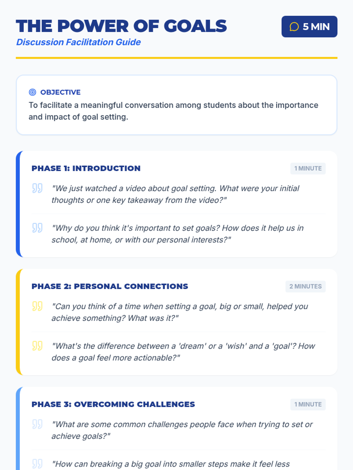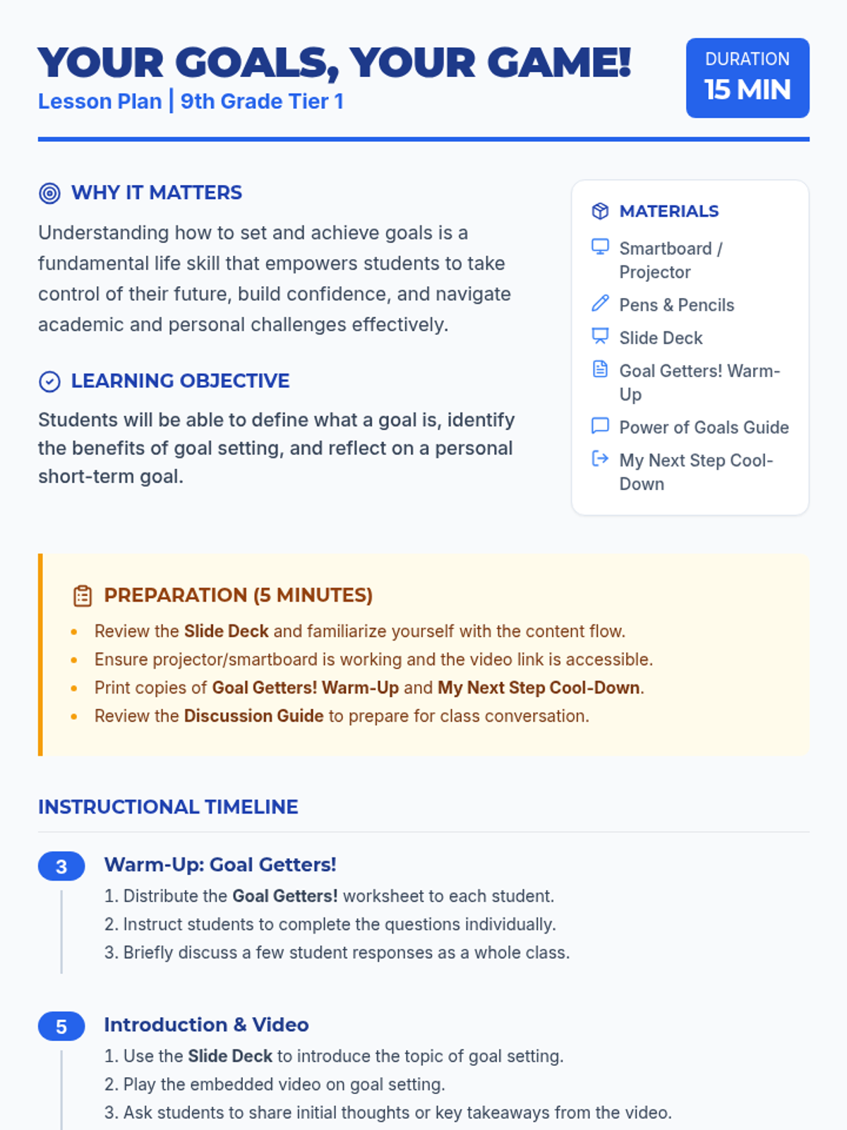 A 15-minute 9th-grade lesson that uses a sports-inspired theme to teach students the fundamentals of goal setting through video, discussion, and personal reflection.