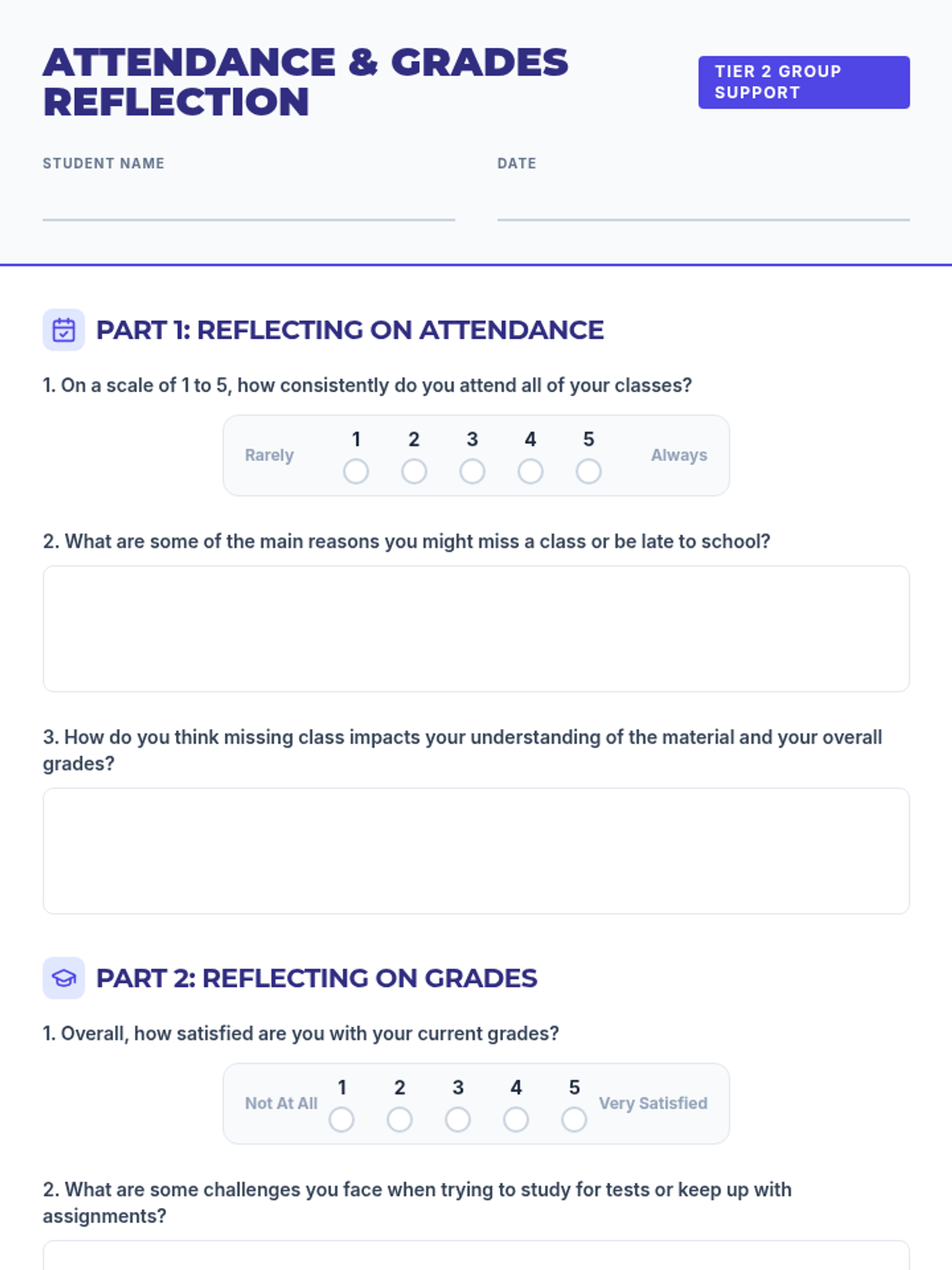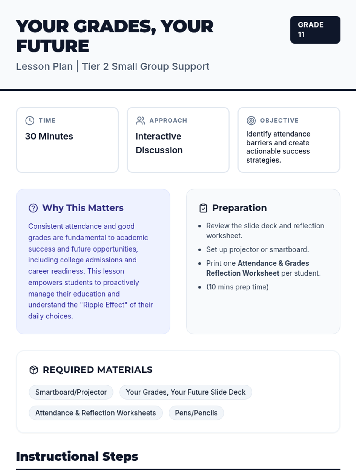 A 30-minute Tier 2 small group support lesson for 11th graders exploring the critical link between consistent attendance and academic success, featuring reflection activities and personalized goal setting.