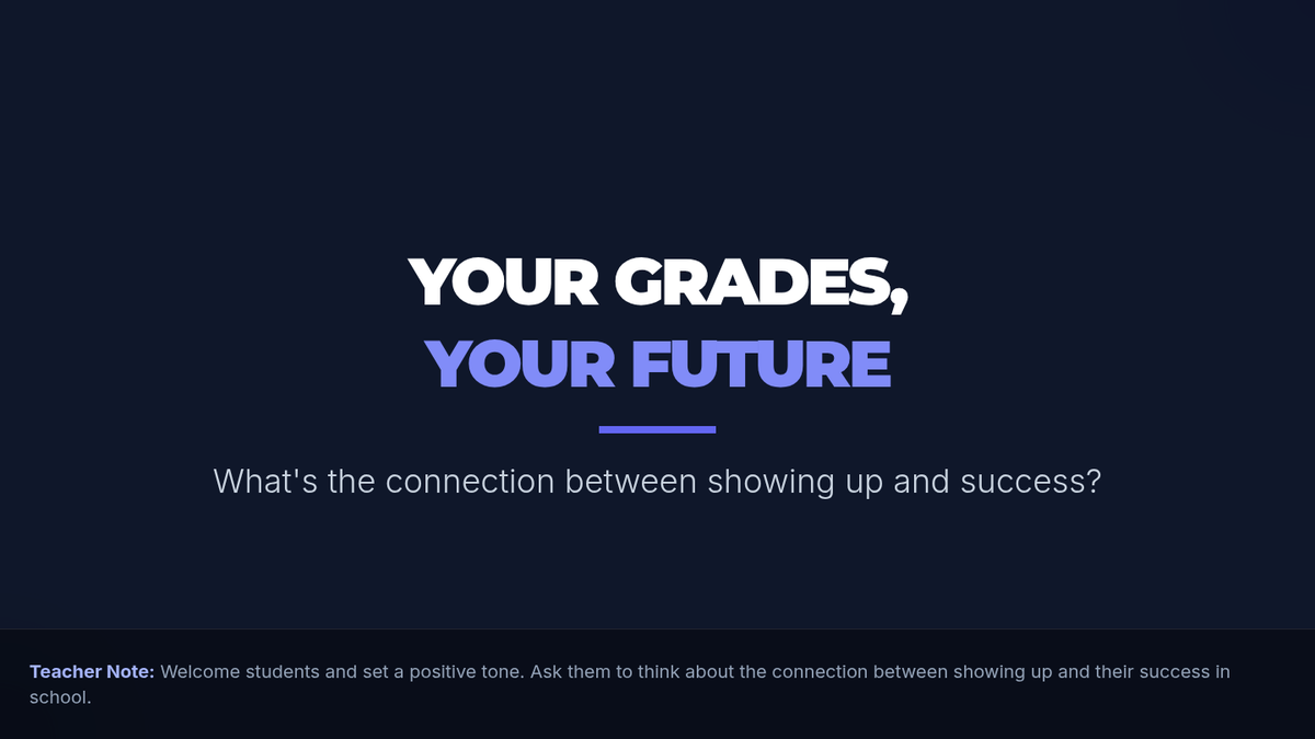 This lesson explores the multi-faceted consequences of skipping class, including academic setbacks, social-emotional impacts, and long-term career implications. Students will reflect on their choices and the weight of their decisions through interactive slides and personal reflection.