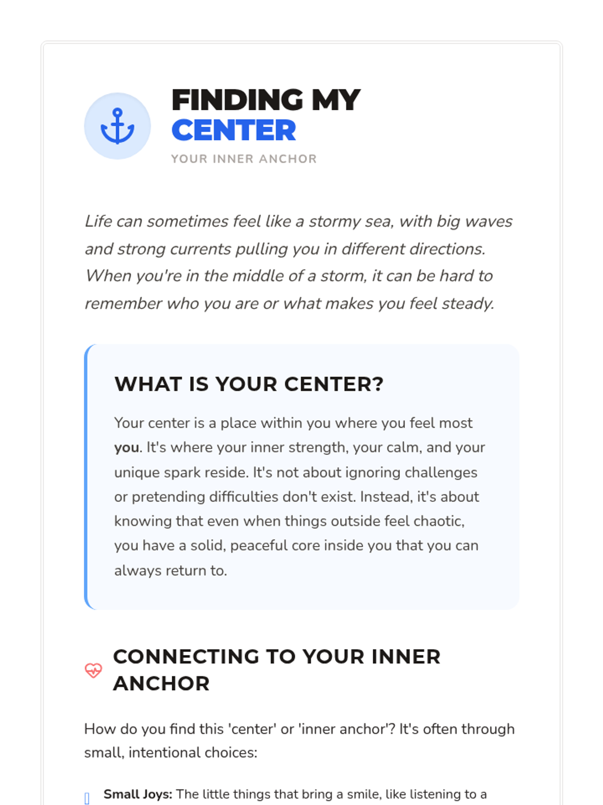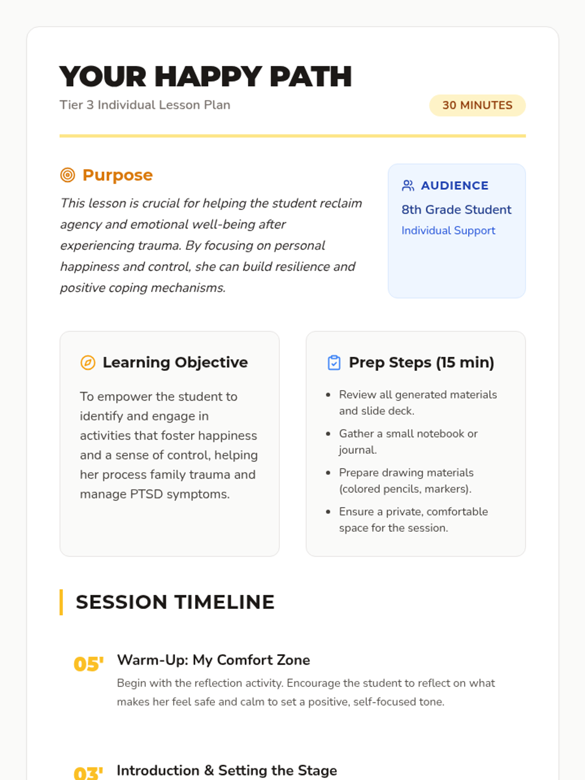 A 30-minute individual Tier 3 lesson designed to help an 8th-grade student reclaim agency and emotional well-being by discovering personal sources of joy and control through creative expression and reflection.