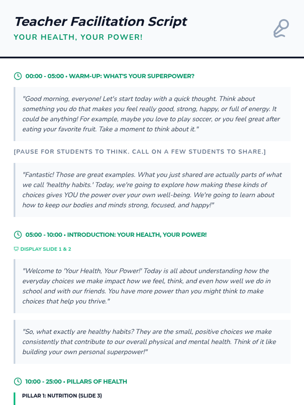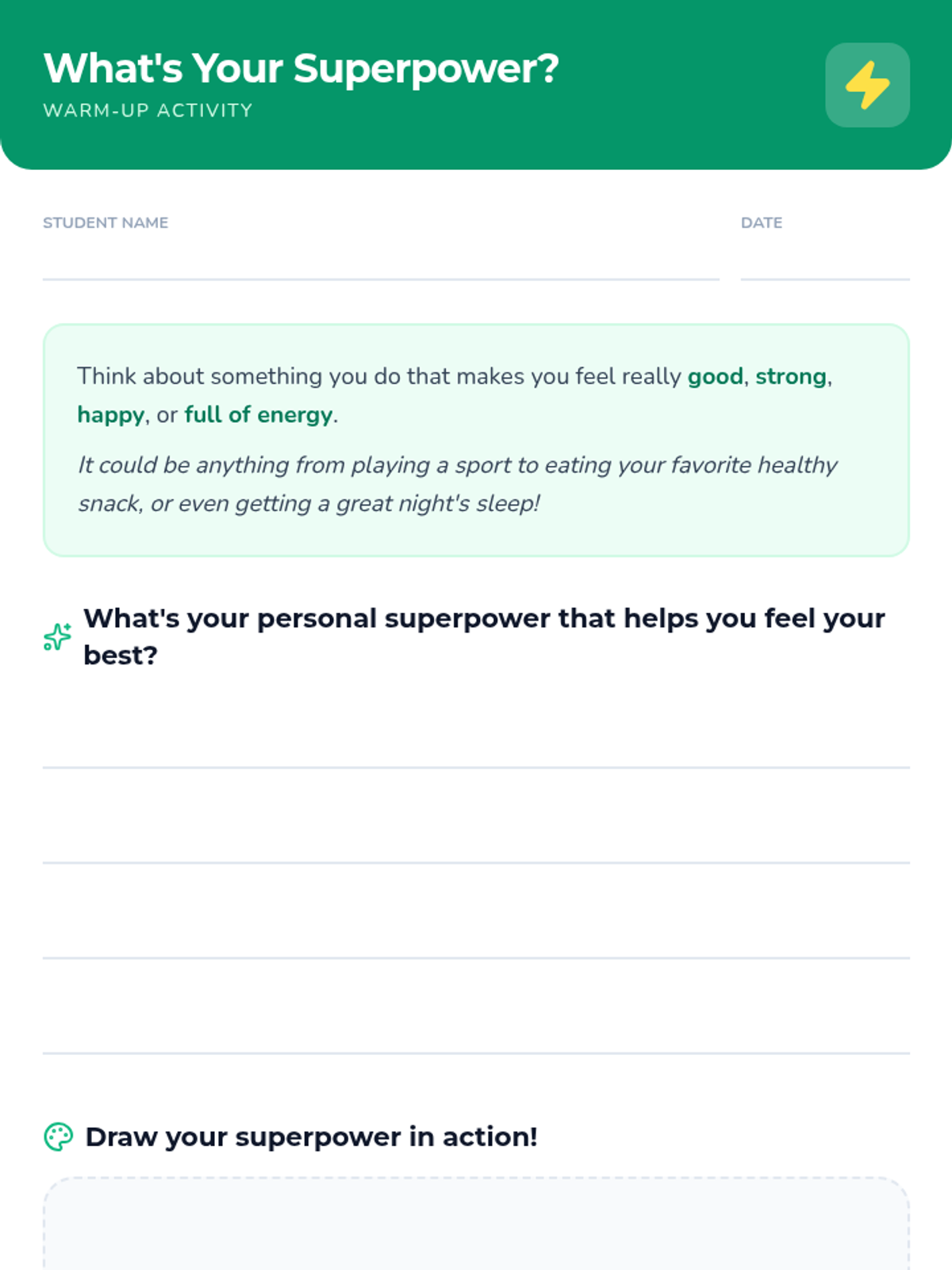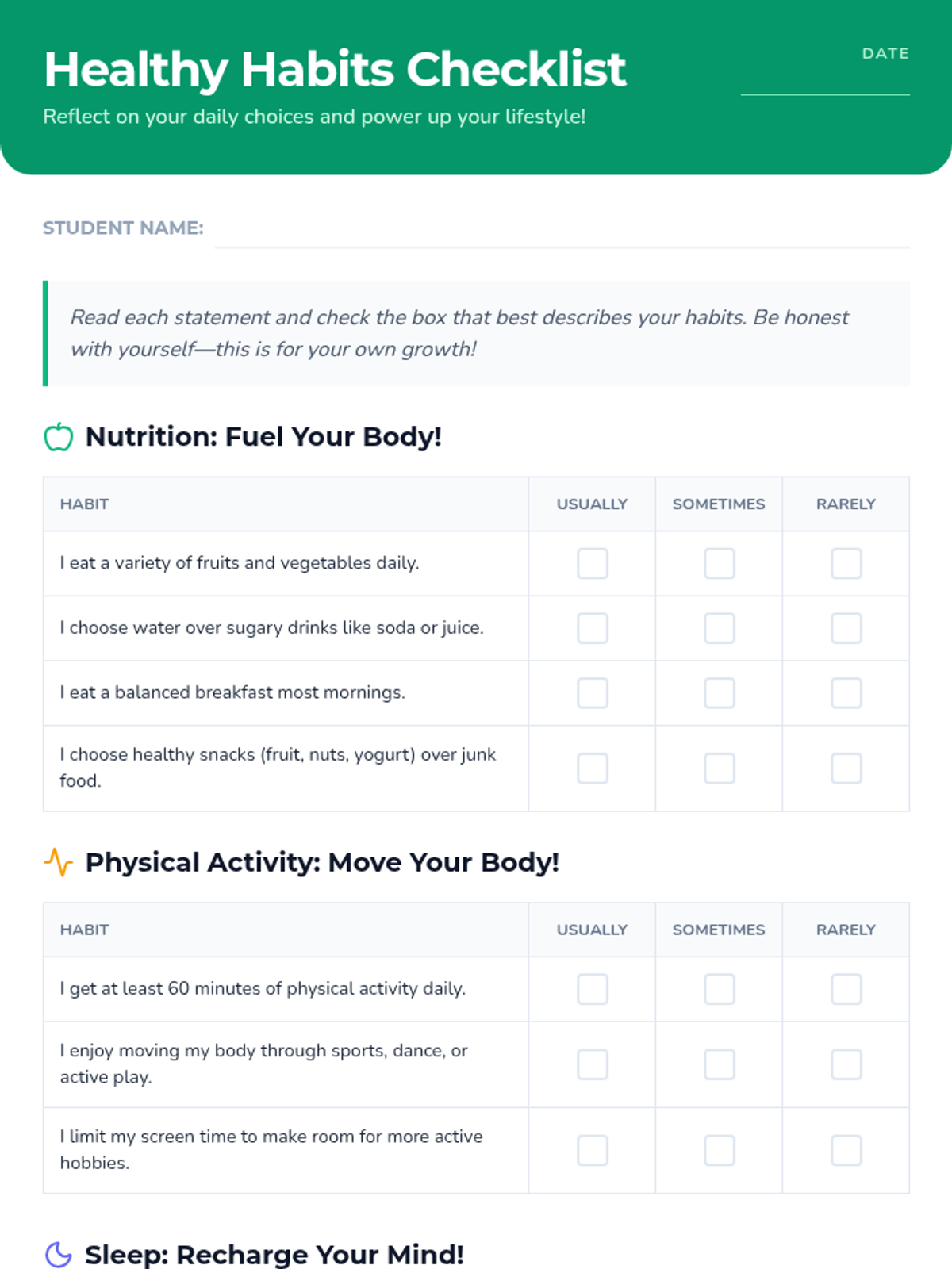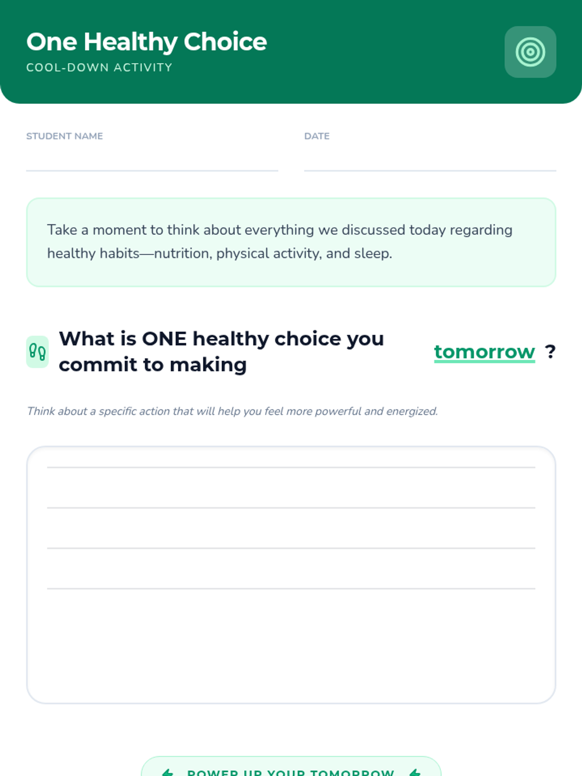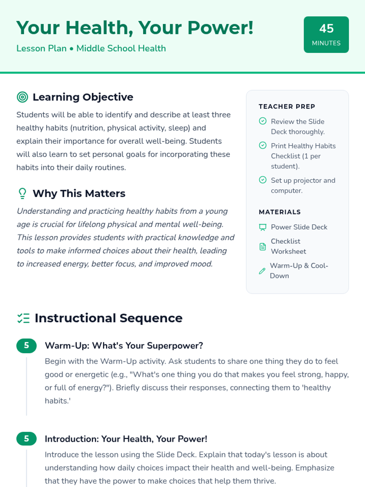 A middle school lesson empowering students to take charge of their well-being through healthy eating, physical activity, and sleep hygiene.